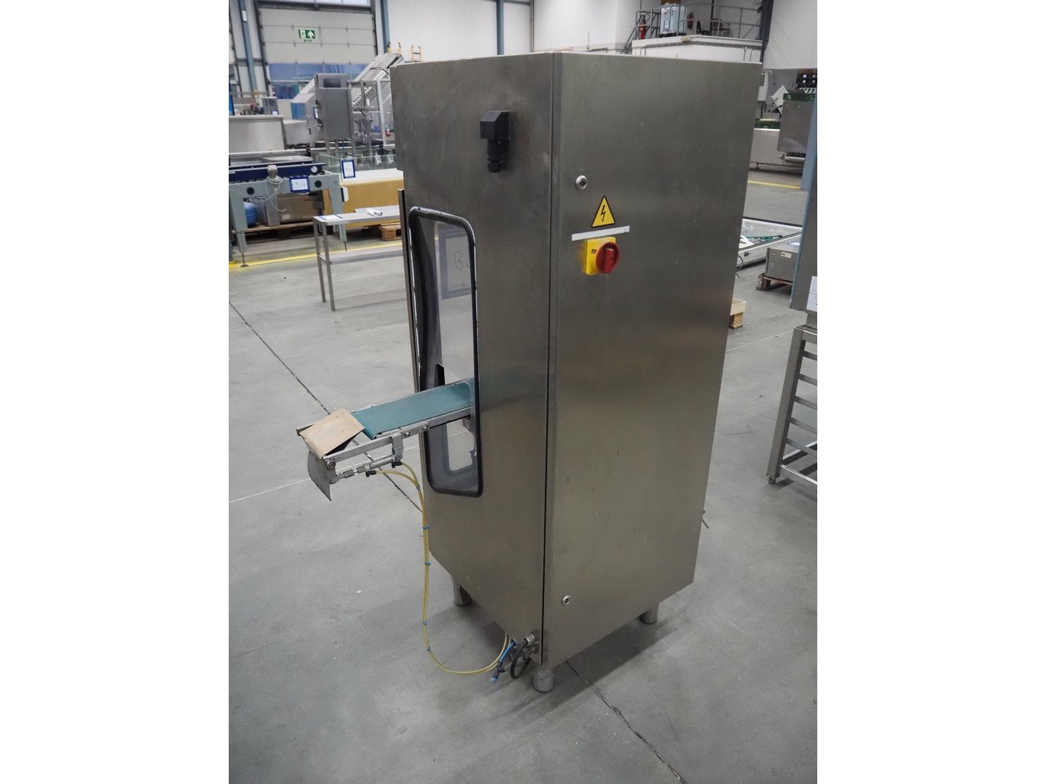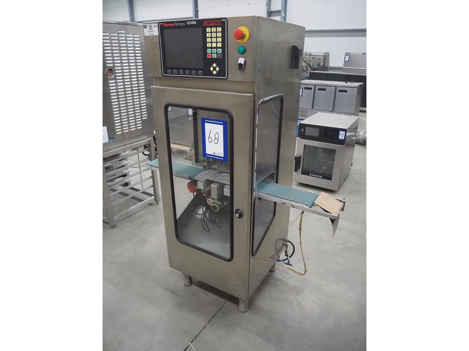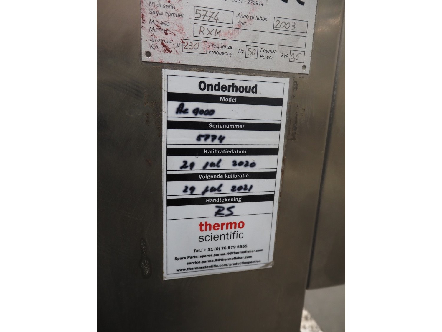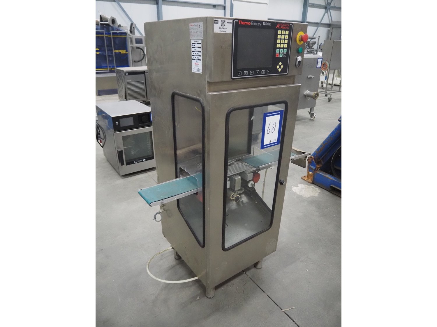 Thermo Ramsey checkweigher, model: RXM, serial number: 5774, year of construction: 2003, 230 V, 50 Hz, 0.6 kVa, plastic belt, belt width: 140 mm, total dimensions: 1080 mm x 630 mm x 1600 mm. Last calibrated: 29 July 2020.
