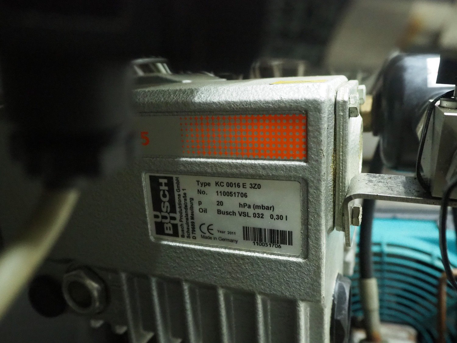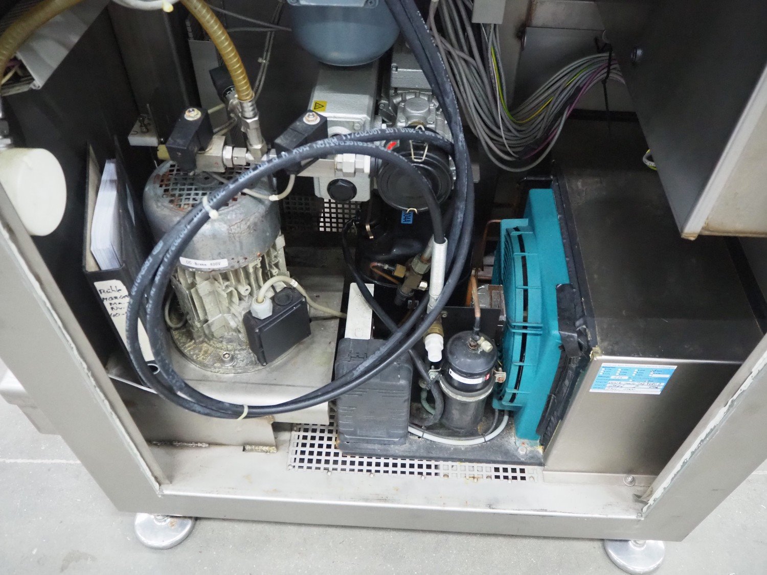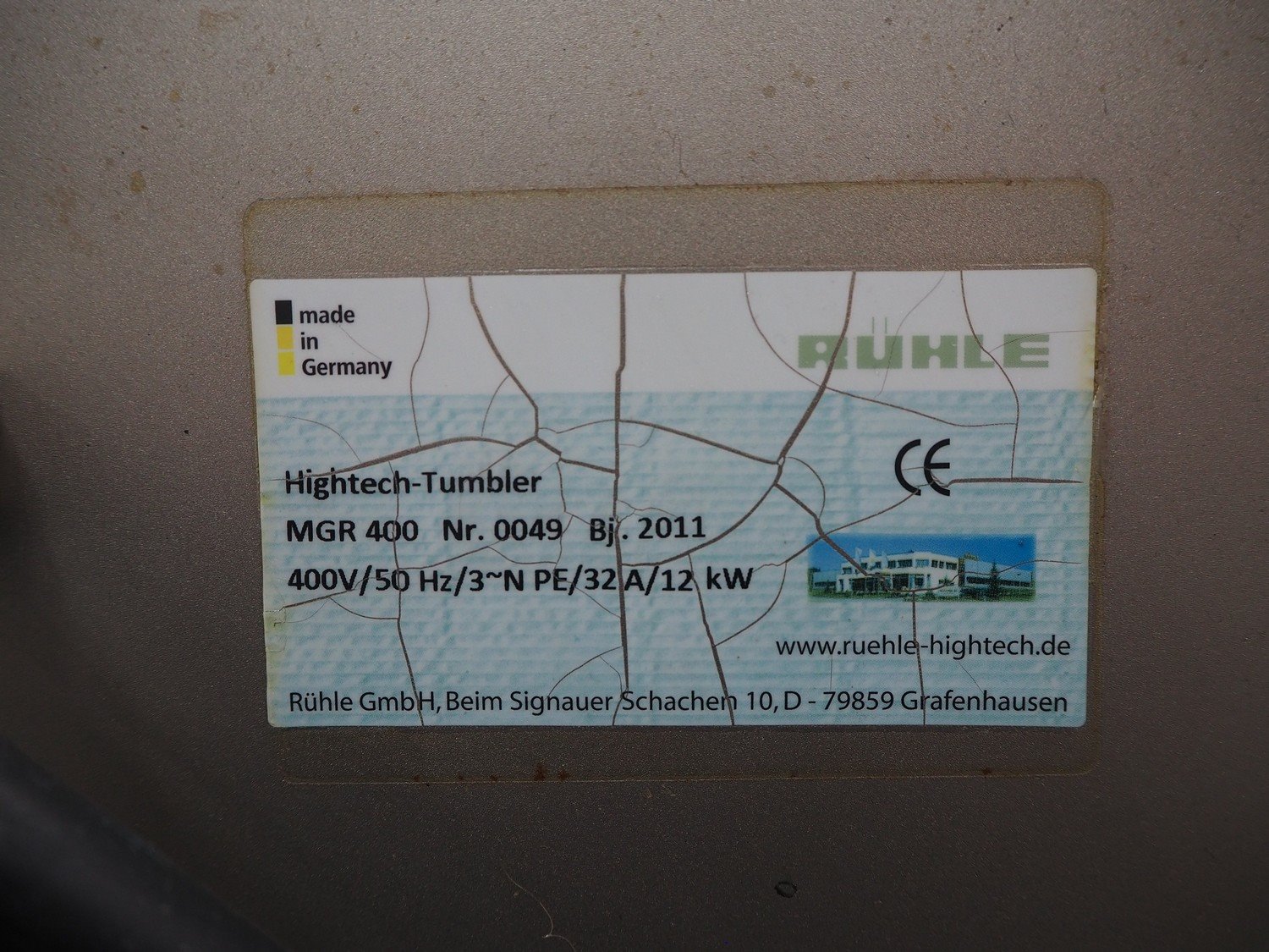Rühle cooled vacuum tumbler, type: MGR 400, number: 0049, year of construction: 2011, 400 V, 3 Ph, 50 Hz, 32 A, 12 kW, Busch vacuum pump, type: KC 0016 E 3Z0, capacity: 16 m³ per hour, dimensions: 2100 mm x 2100 mm x 1950 mm.