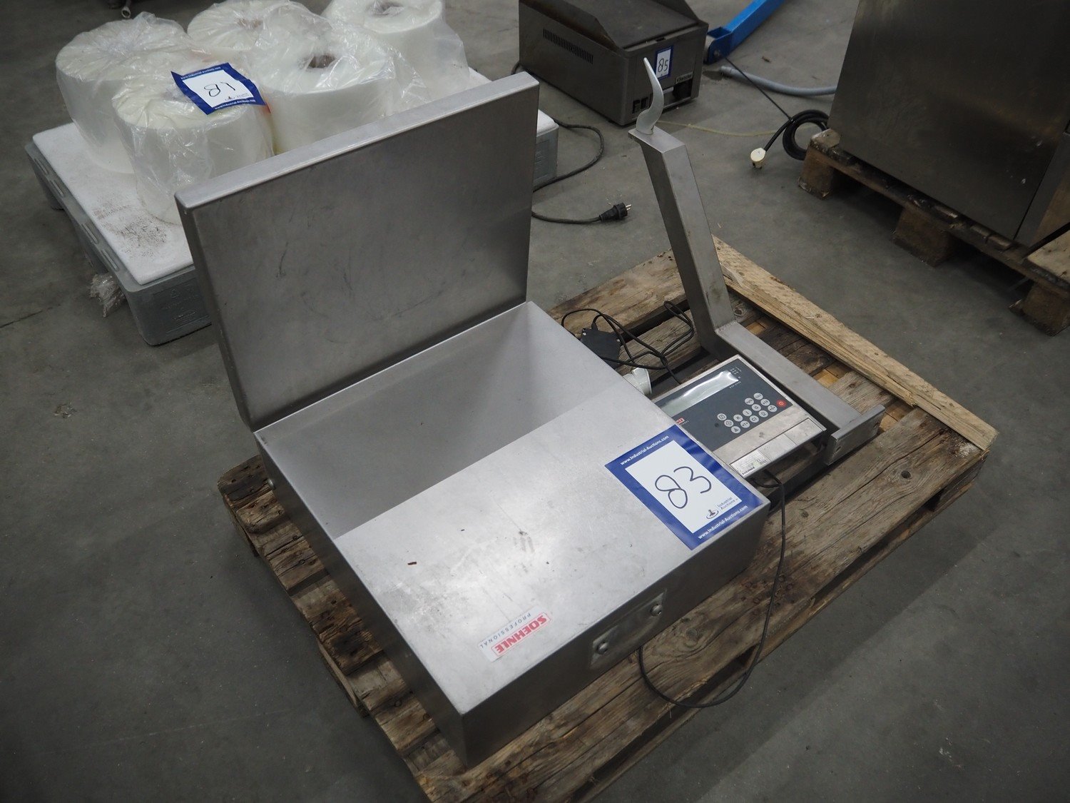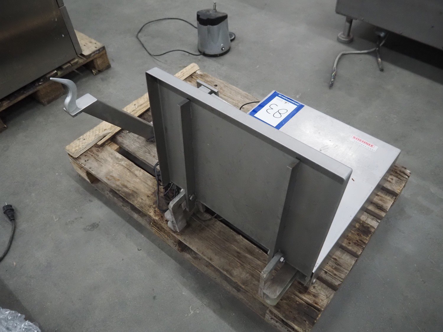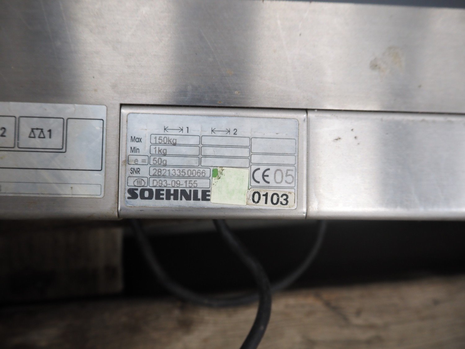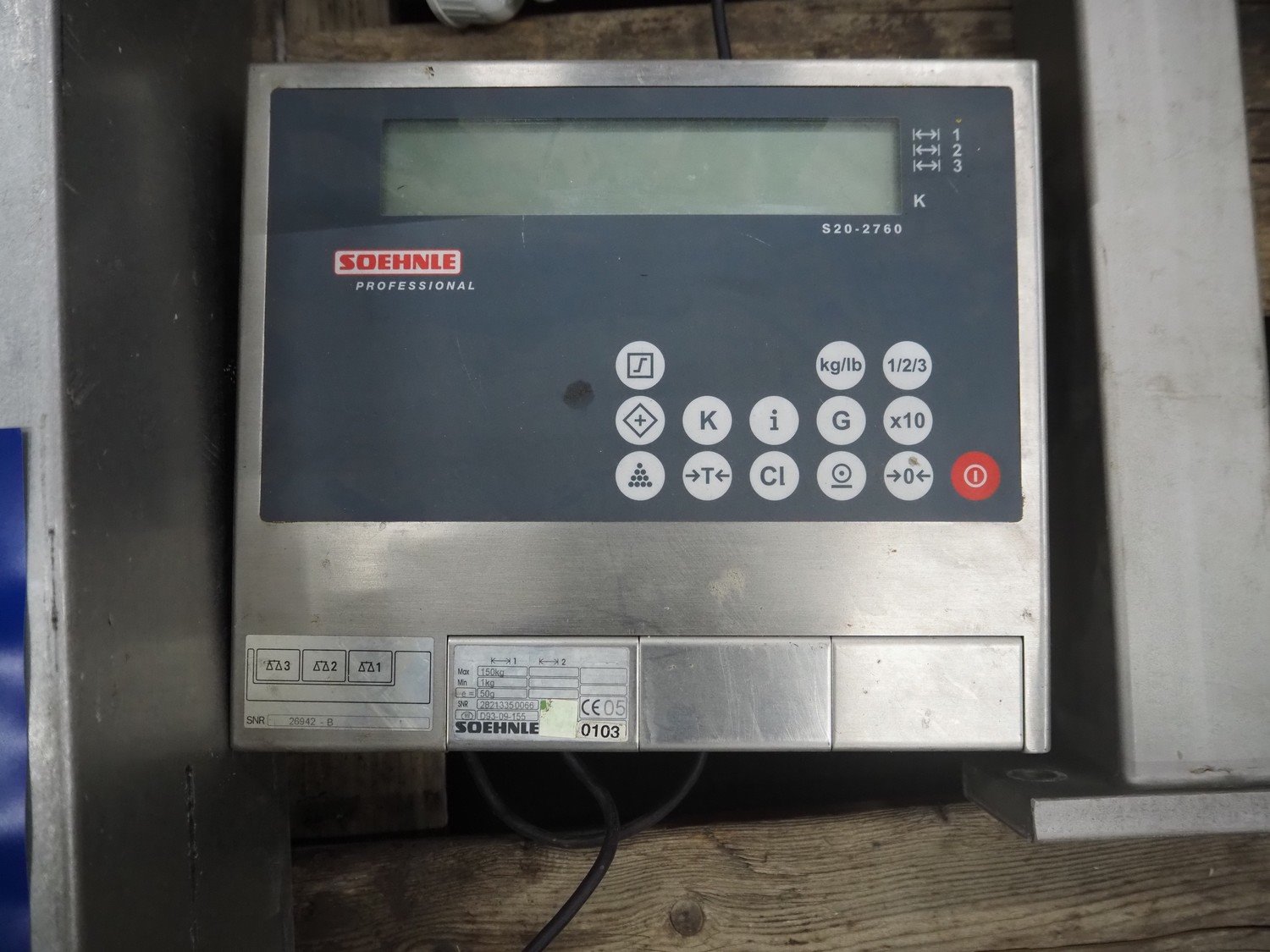 Soehnle hook weighing scale with indicator, serial number: 28213350066, maximum weight: 150 kg, minimum weight: 1 kg, e= 50 gram, dimensions: 570 mm x 300 mm x 700 mm.