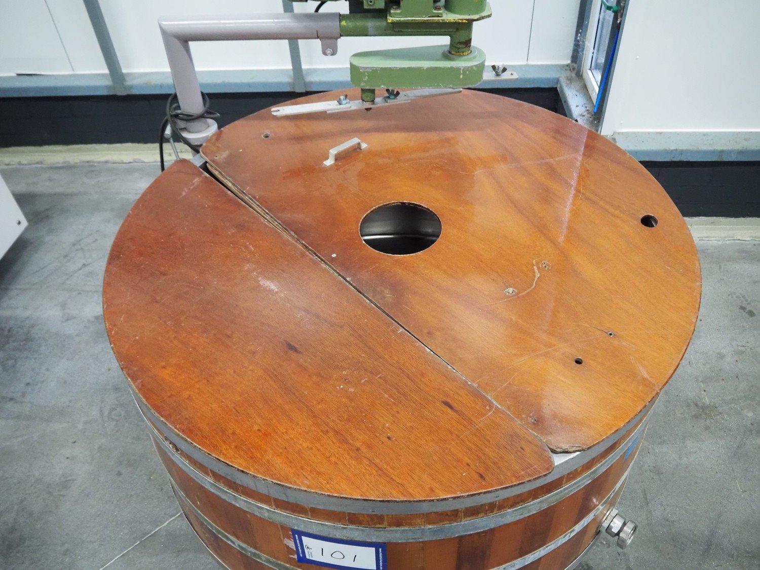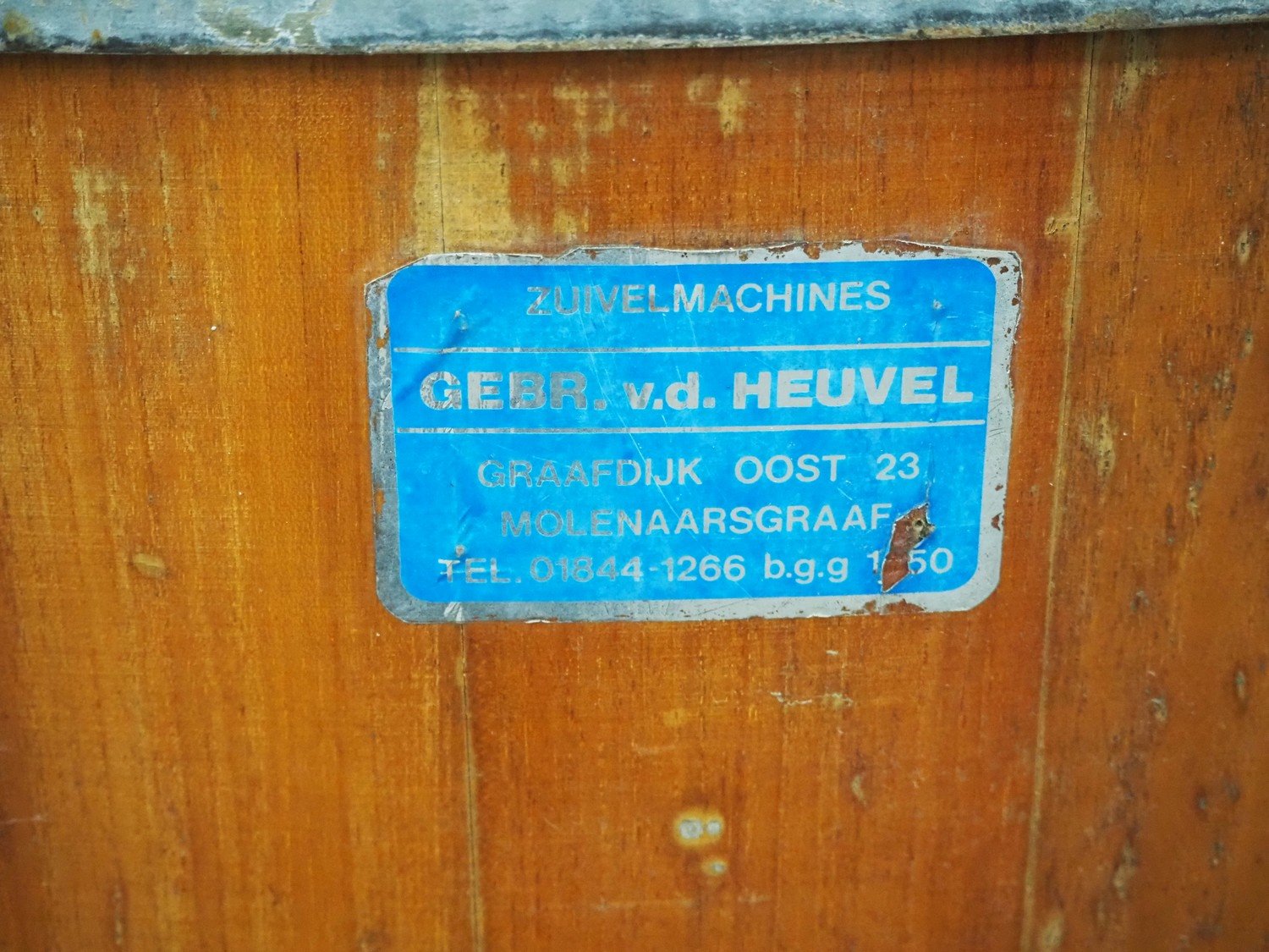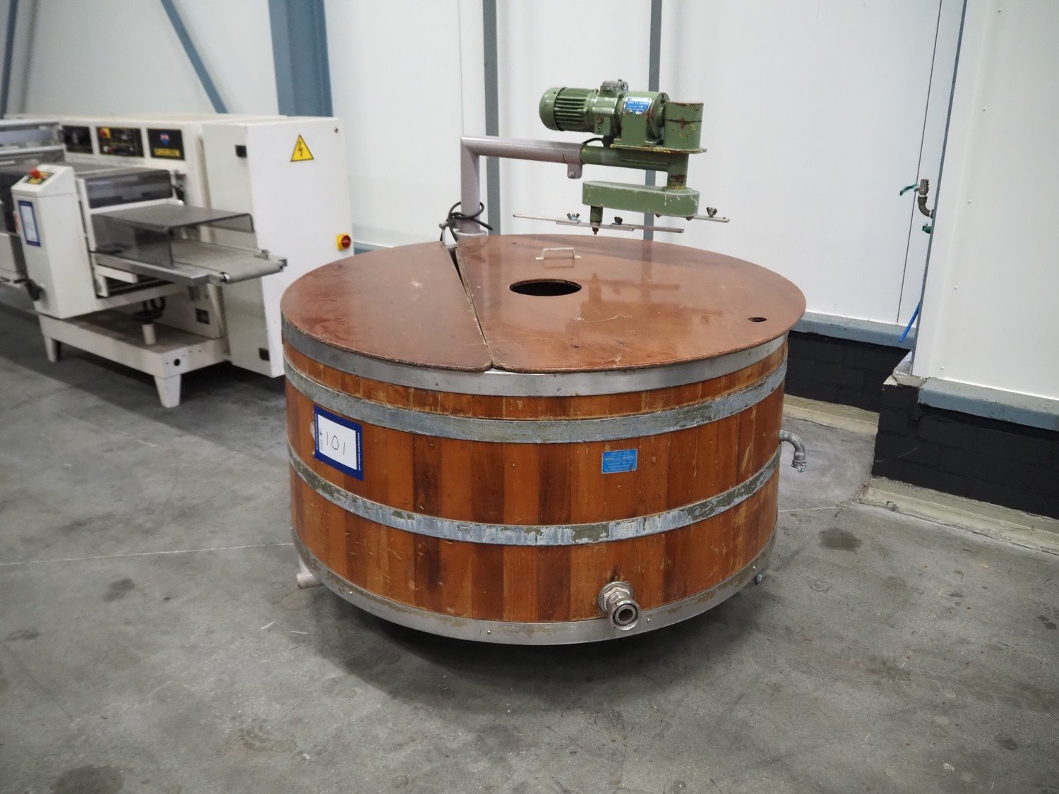 Gebr. Van den Heuvel mobile wooden cheese vat with agitator, inside dimensions: 1300 mm x 1300 mm x 680 mm, total dimensions: 1600 mm x 1450 mm x 1500 mm.