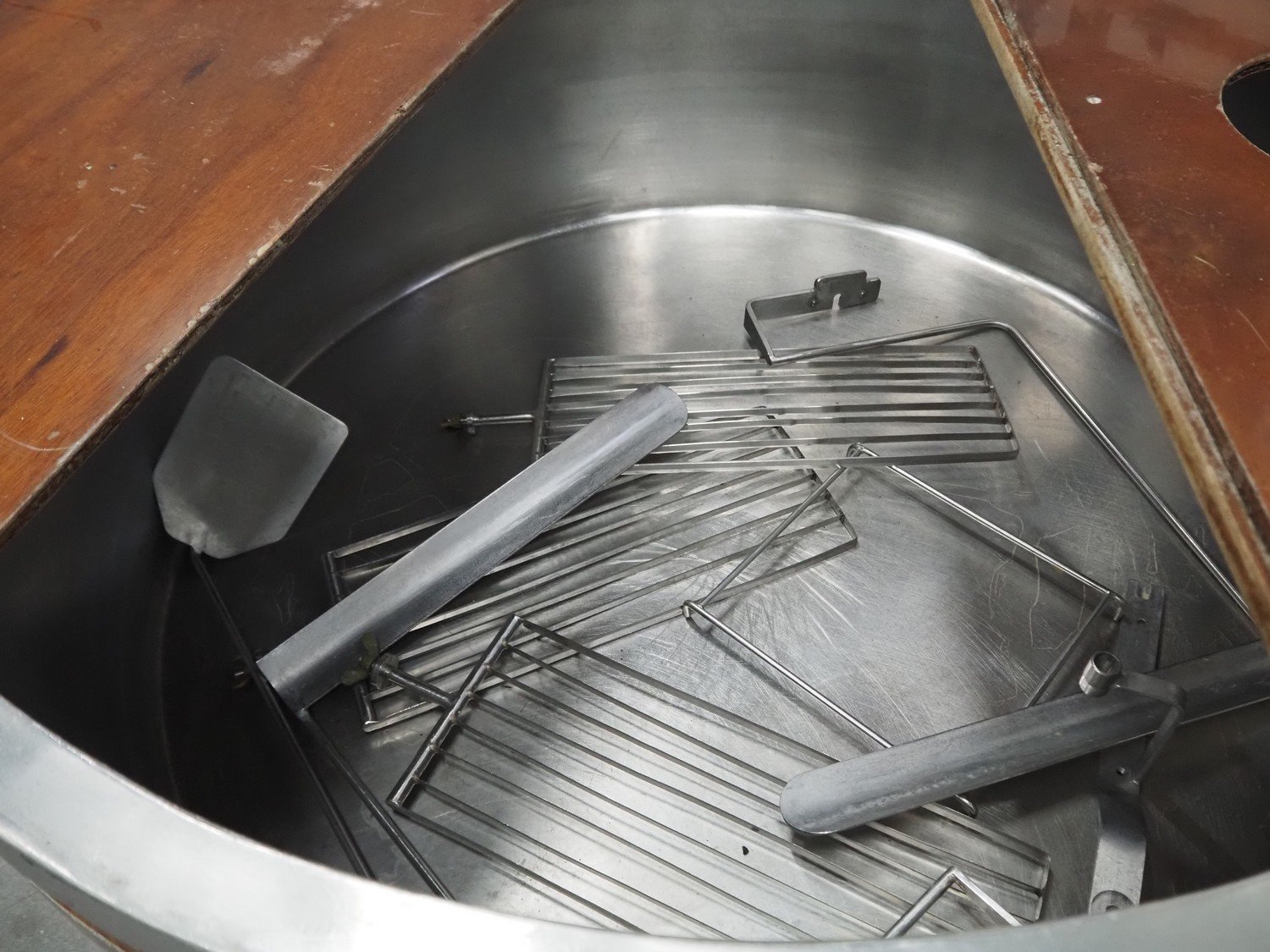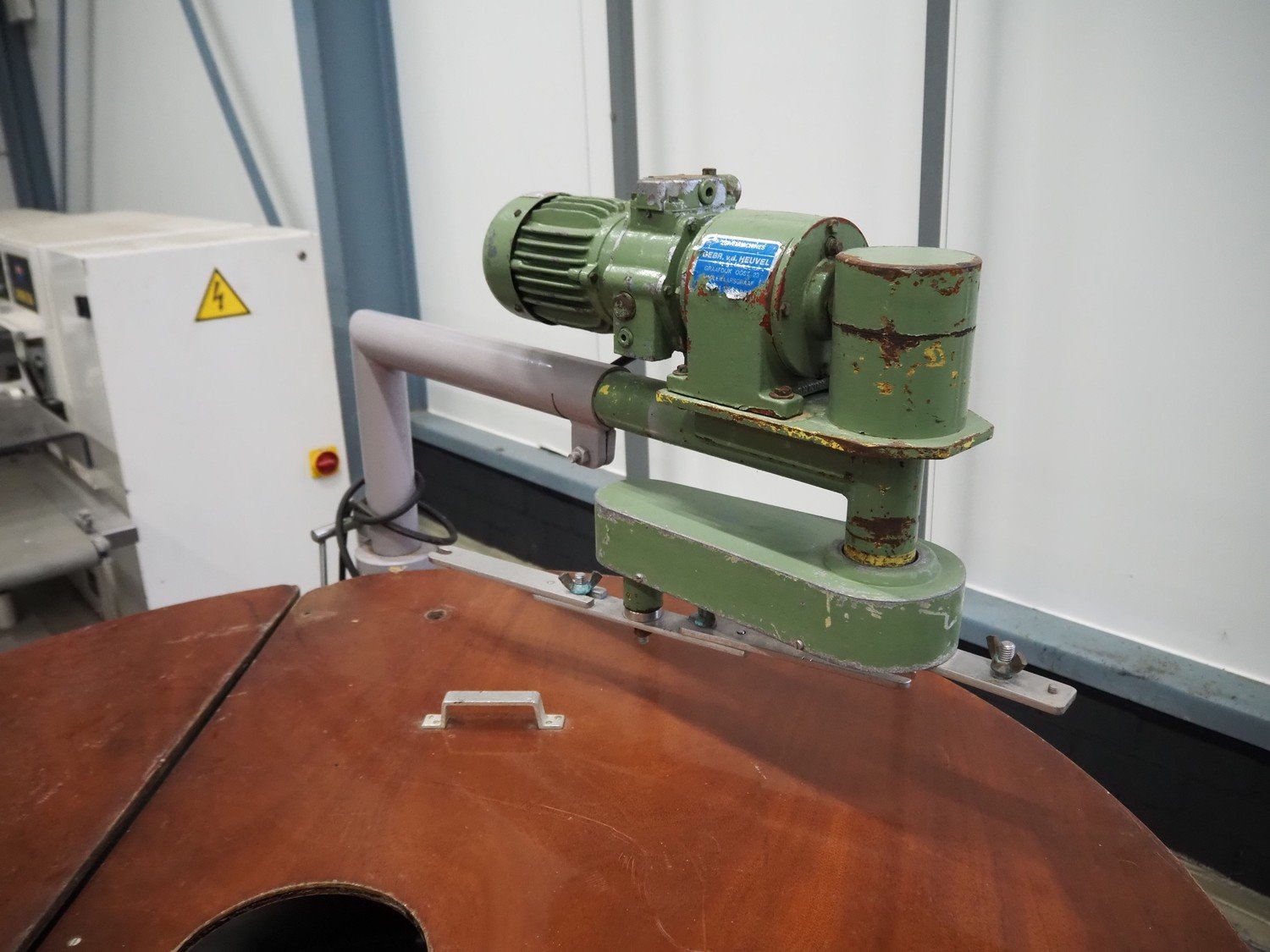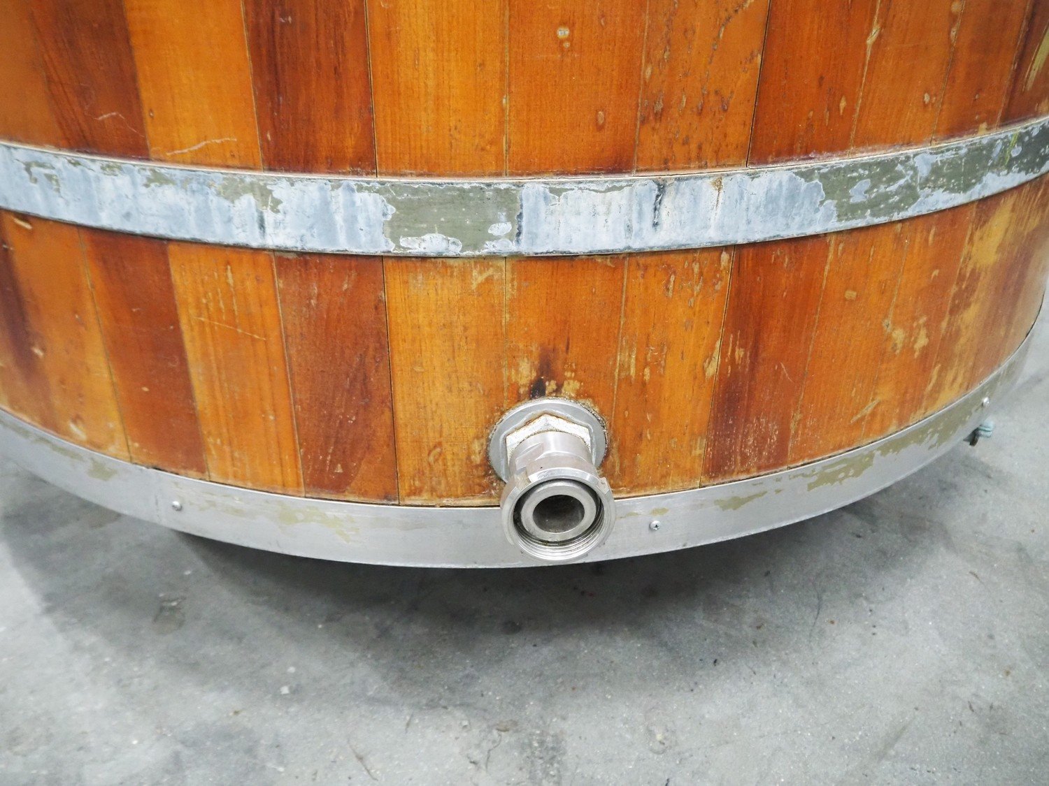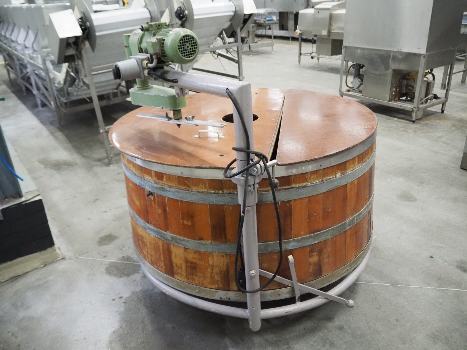 Gebr. Van den Heuvel mobile wooden cheese vat with agitator, inside dimensions: 1300 mm x 1300 mm x 680 mm, total dimensions: 1600 mm x 1450 mm x 1500 mm.