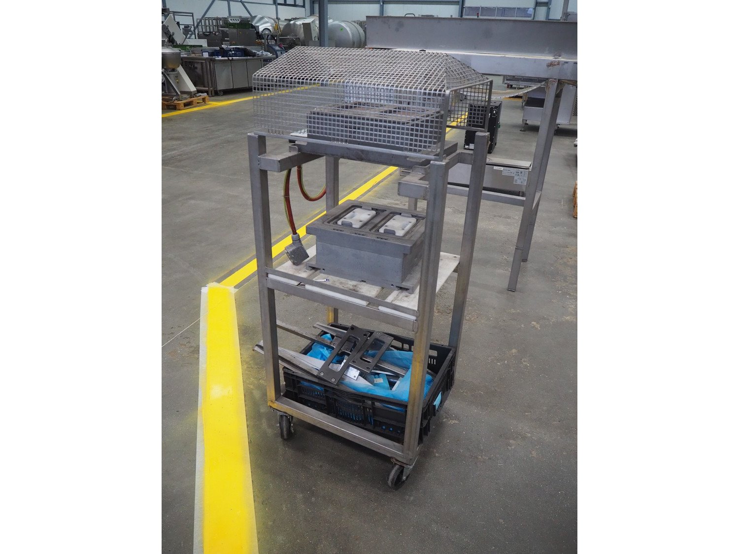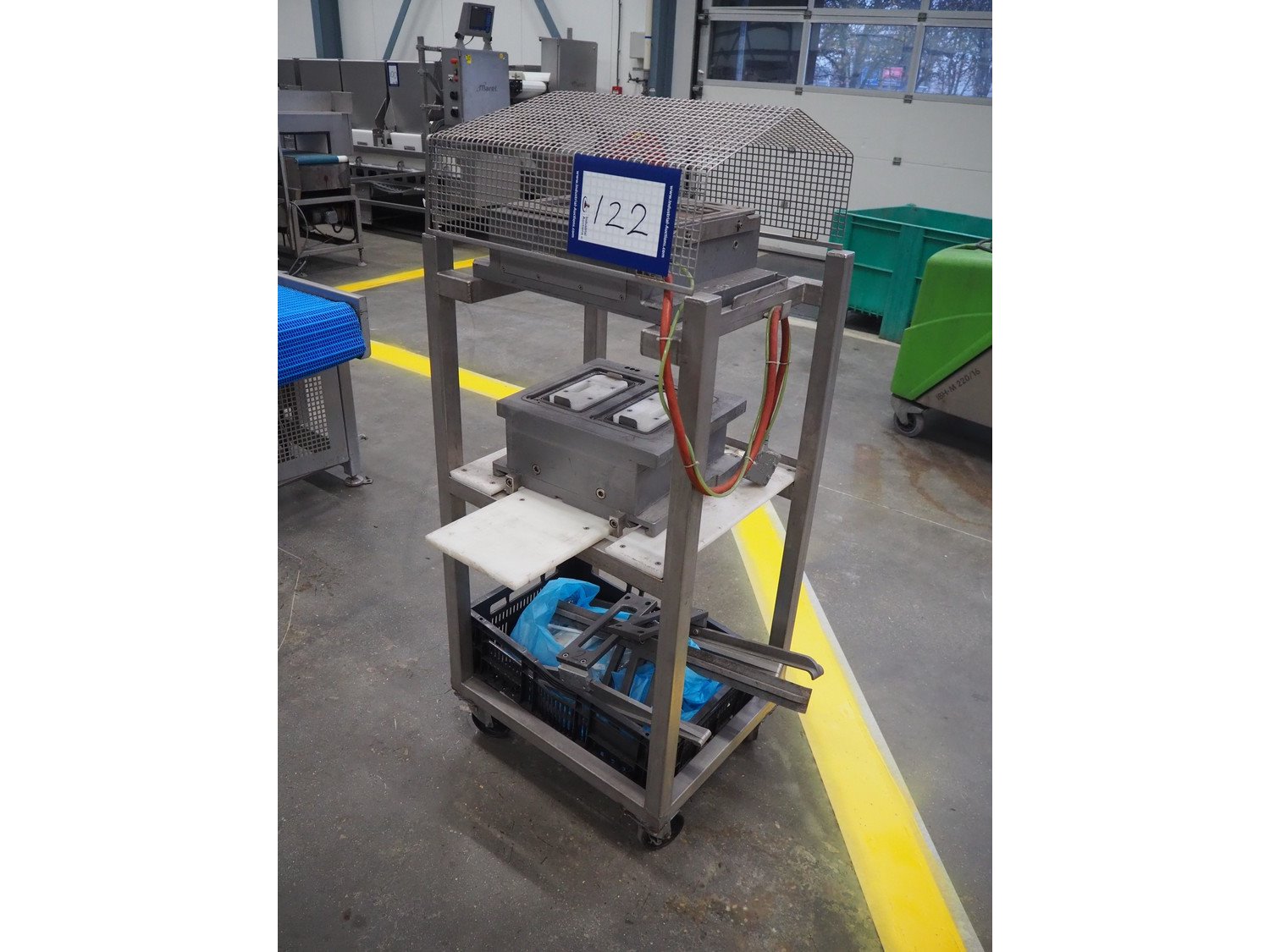 S/s trolley with parts for traysealer, dimensions dye: (2x) 190 mm x 100 mm, total dimensions: 630 mm x 500 mm x 1220 mm.