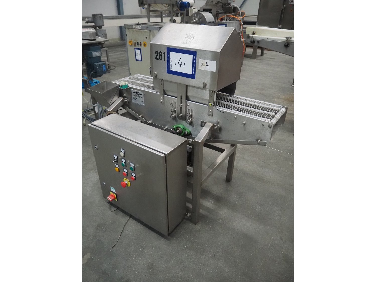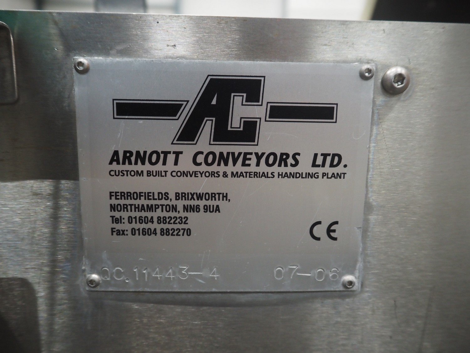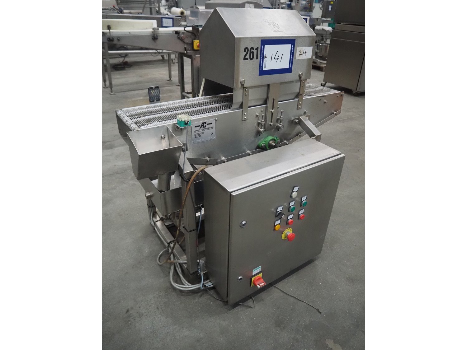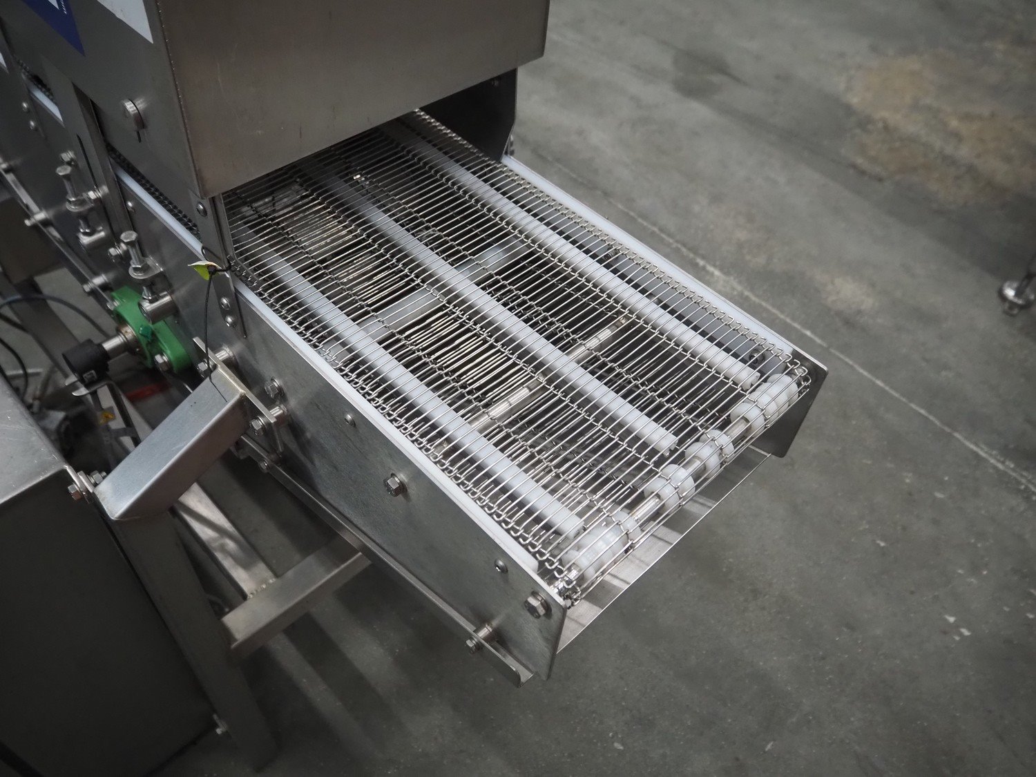 Arnott spraying belt, number: OC.11443-4, year of construction: 07-06, s/s mesh belt, belt width: 250 mm, total dimensions: 1250 mm x 850 mm x 1200 mm.