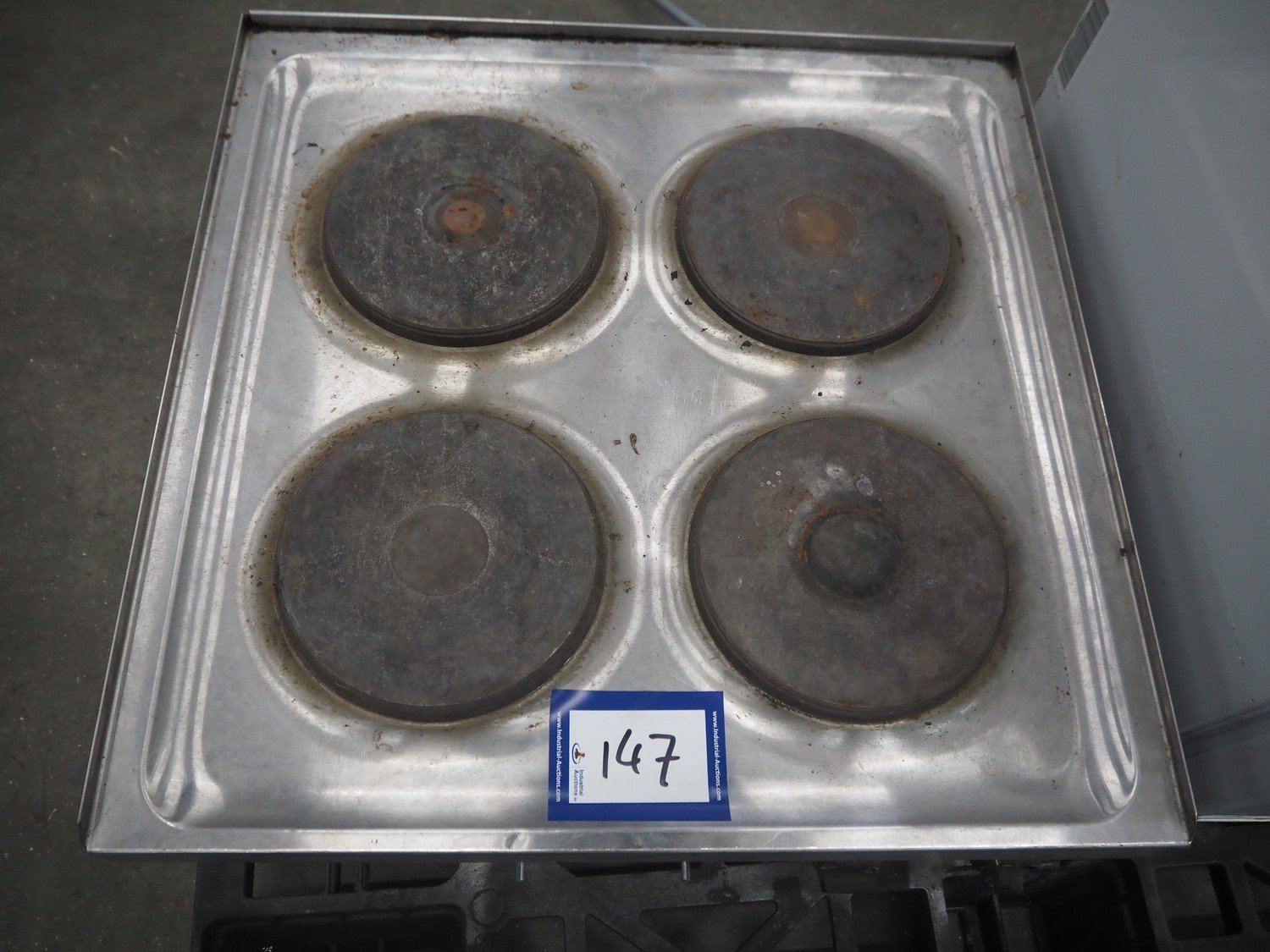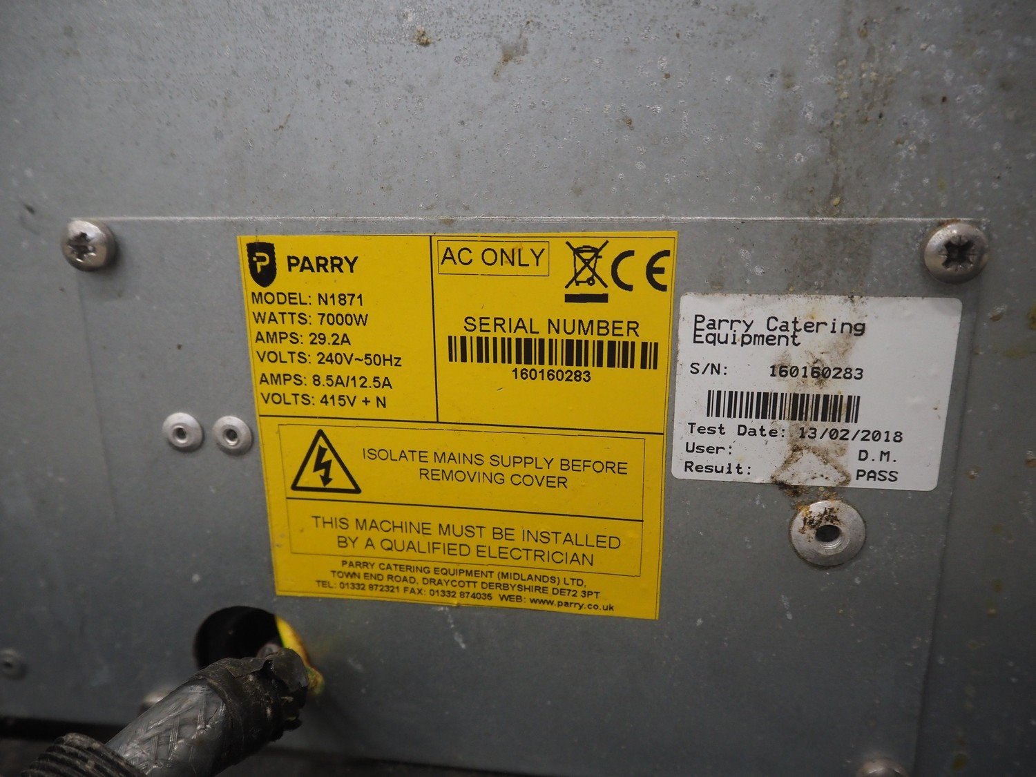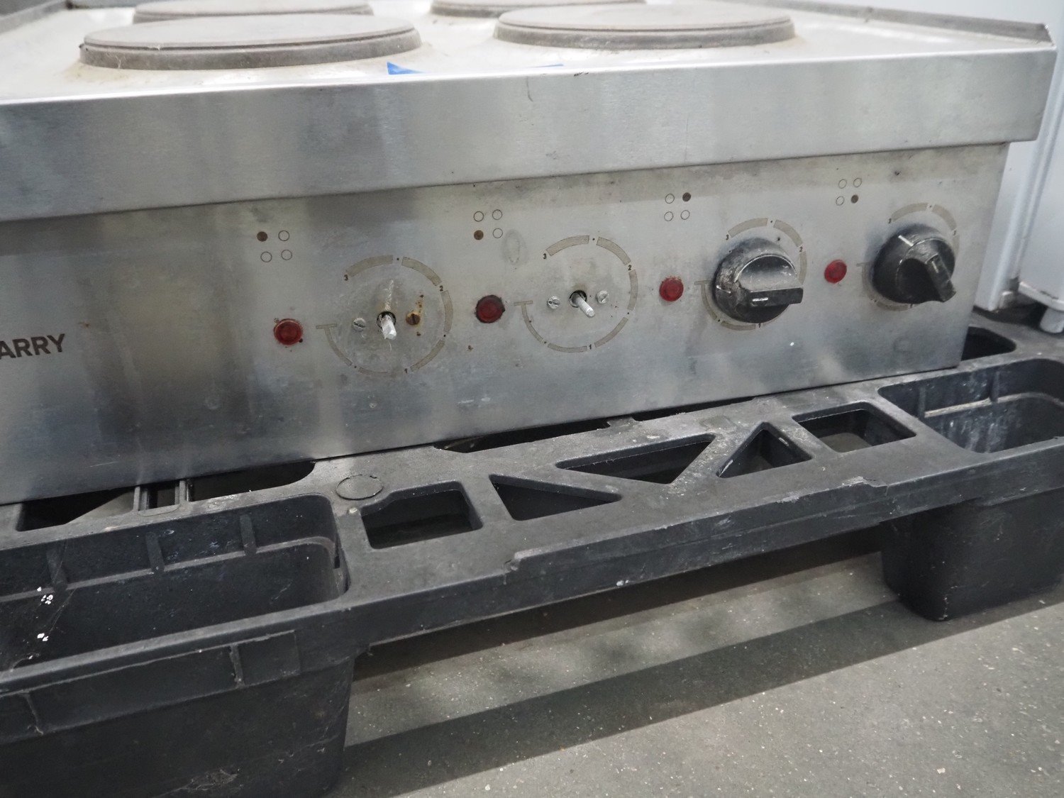 Parry 4 pits stove, model: N1871, serial number: 160160283, 240/415 V, 50 Hz, 8.5/12.5/29.2 A, 7 kW, dimensions: 600 mm x 610 mm x 220 mm. Missing 2 buttons.