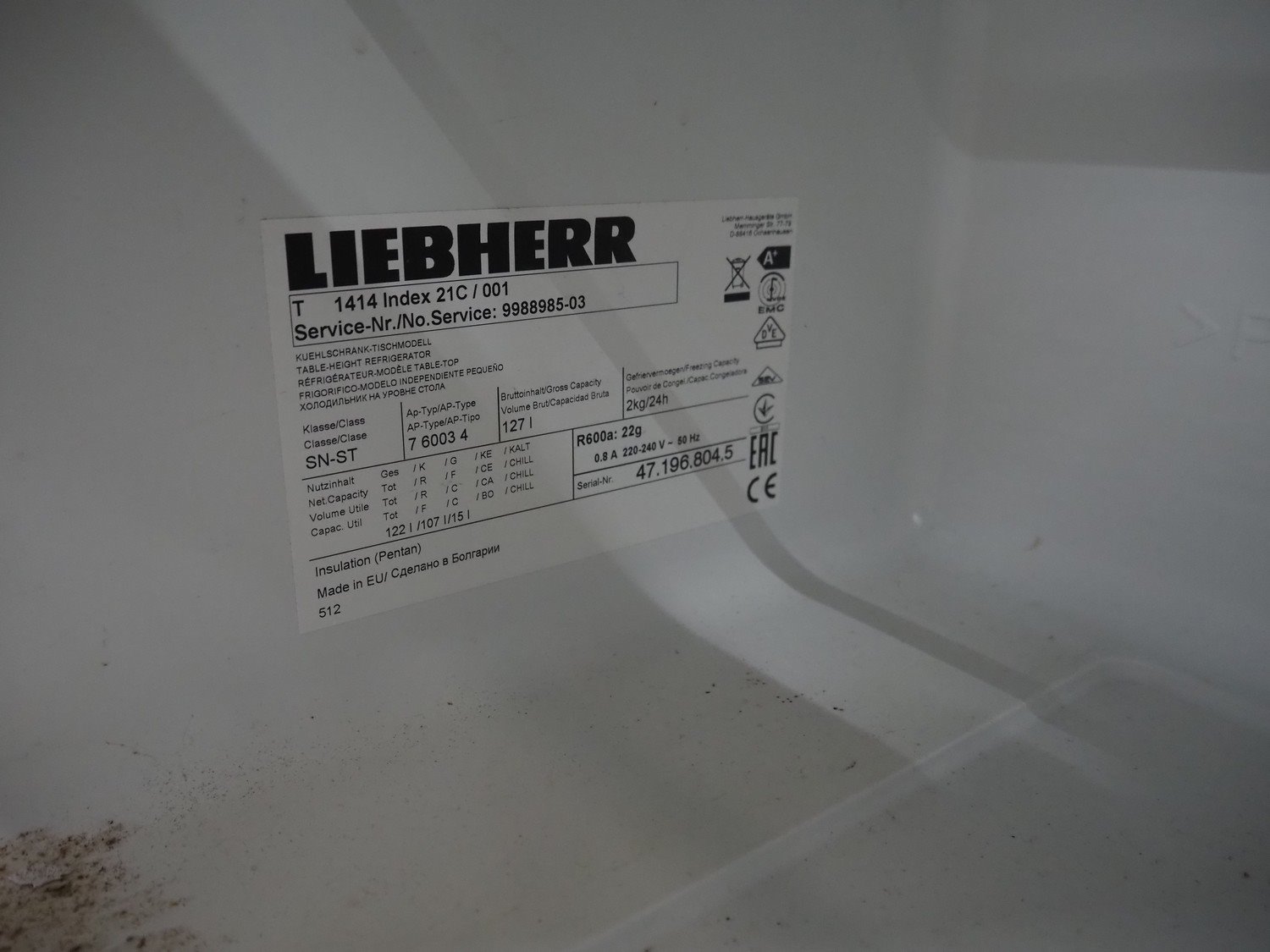 Liebherr refrigerator, type: 7 6003 4, serial number: 47.196.804.5, refrigerant: R600a / 22 gram, volume: 127 liter, dimensions: 500 mm x 600 mm x 850 mm.