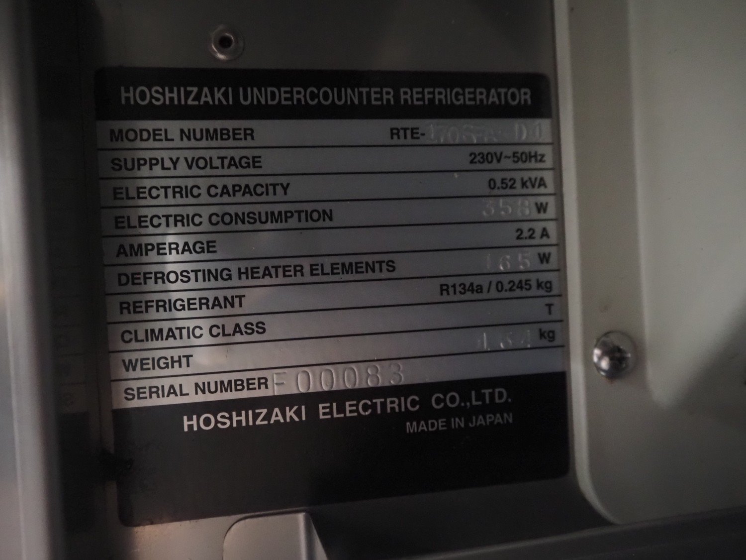 Hoshizaki mobile refrigerator, model: RTE-1703A, serial number: F00083, 230 V, 1 Ph, 50 Hz, 2.2 A, 358 W, refrigerant: R134a / 0.245 kg, weight: 134 kg, dimensions: 1700 mm x 700 mm x 850 mm.