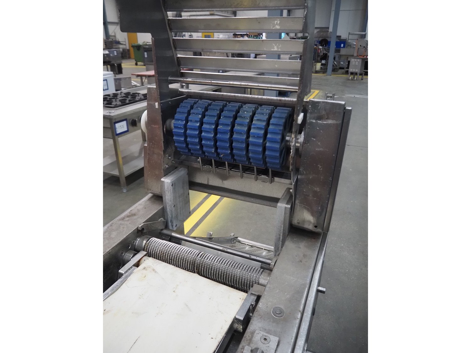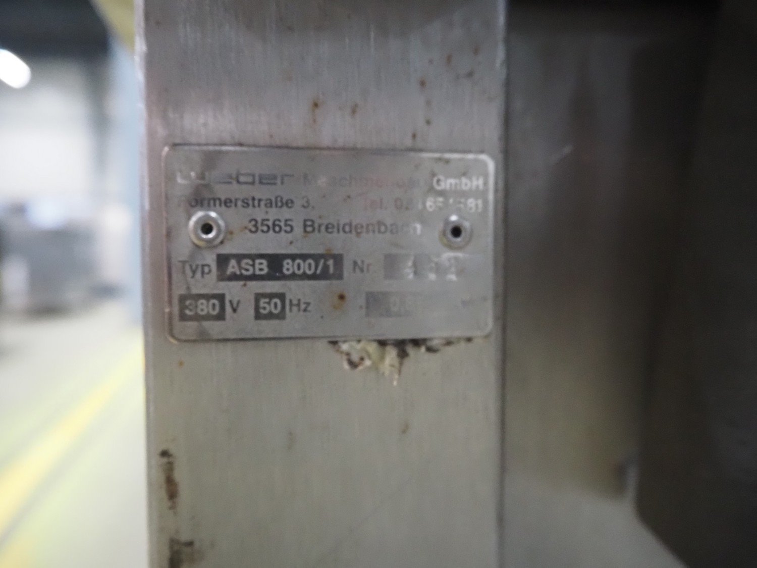 Weber Maschinenbau GmbH mobile skinning and derinding machine, type: ASB 800/1, number: 452, 380 V, 50 Hz, 0.85 kW, working width: 380 mm, total dimensions: 670 mm x 850 mm x 1200 mm. Incomplete.