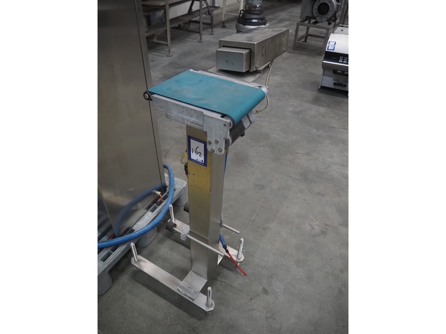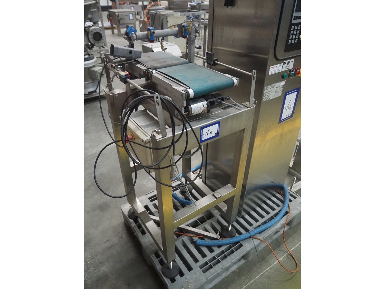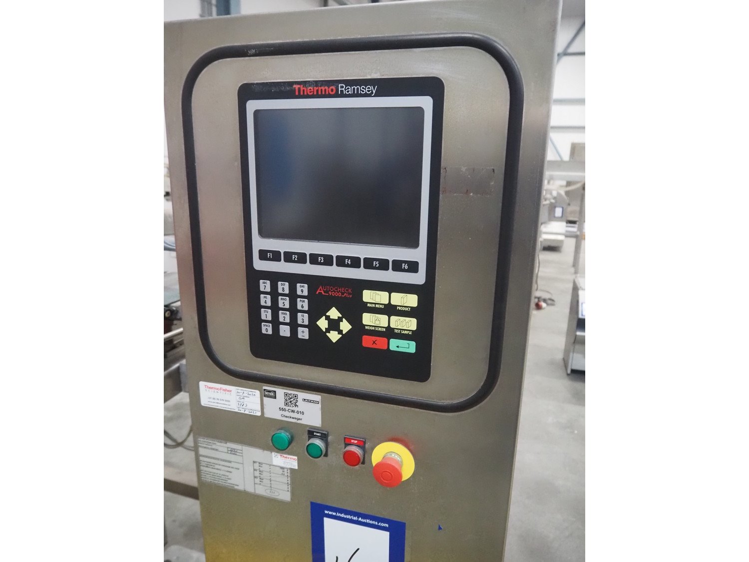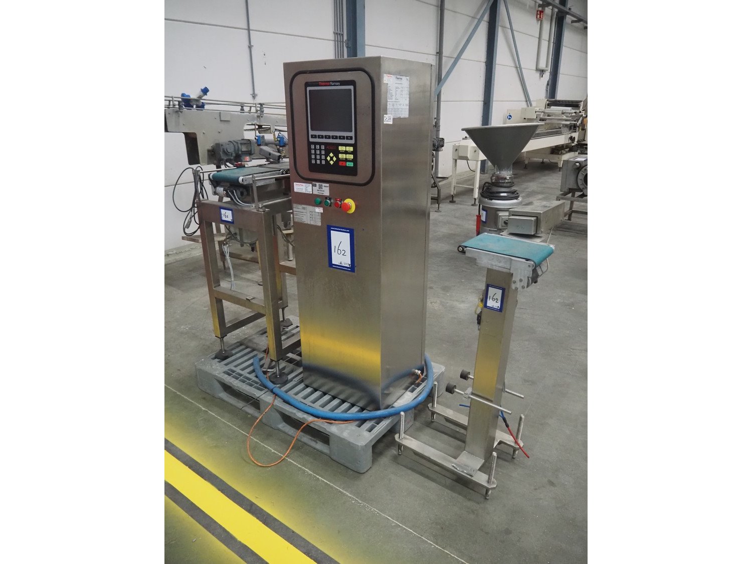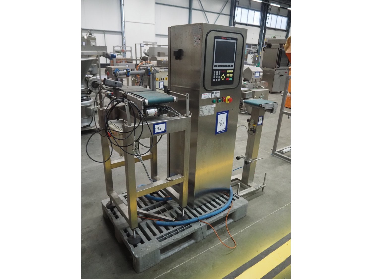 Thermo Ramsey checkweigher with rejecter, model: Sentron C, serial number: 5773, year of construction: 2003, 230 V, 50 Hz, 0.6 kVA, maximum weight: 1500 gram, minimum weight: 35 gram, e= 0.5 gram, plastic belt, belt width: 195 mm, total dimensions: 900 mm x 800 mm x 1250 mm. With Thermo Ramsey control panel, dimensions: 500 mm x 430 mm x 1770 mm.