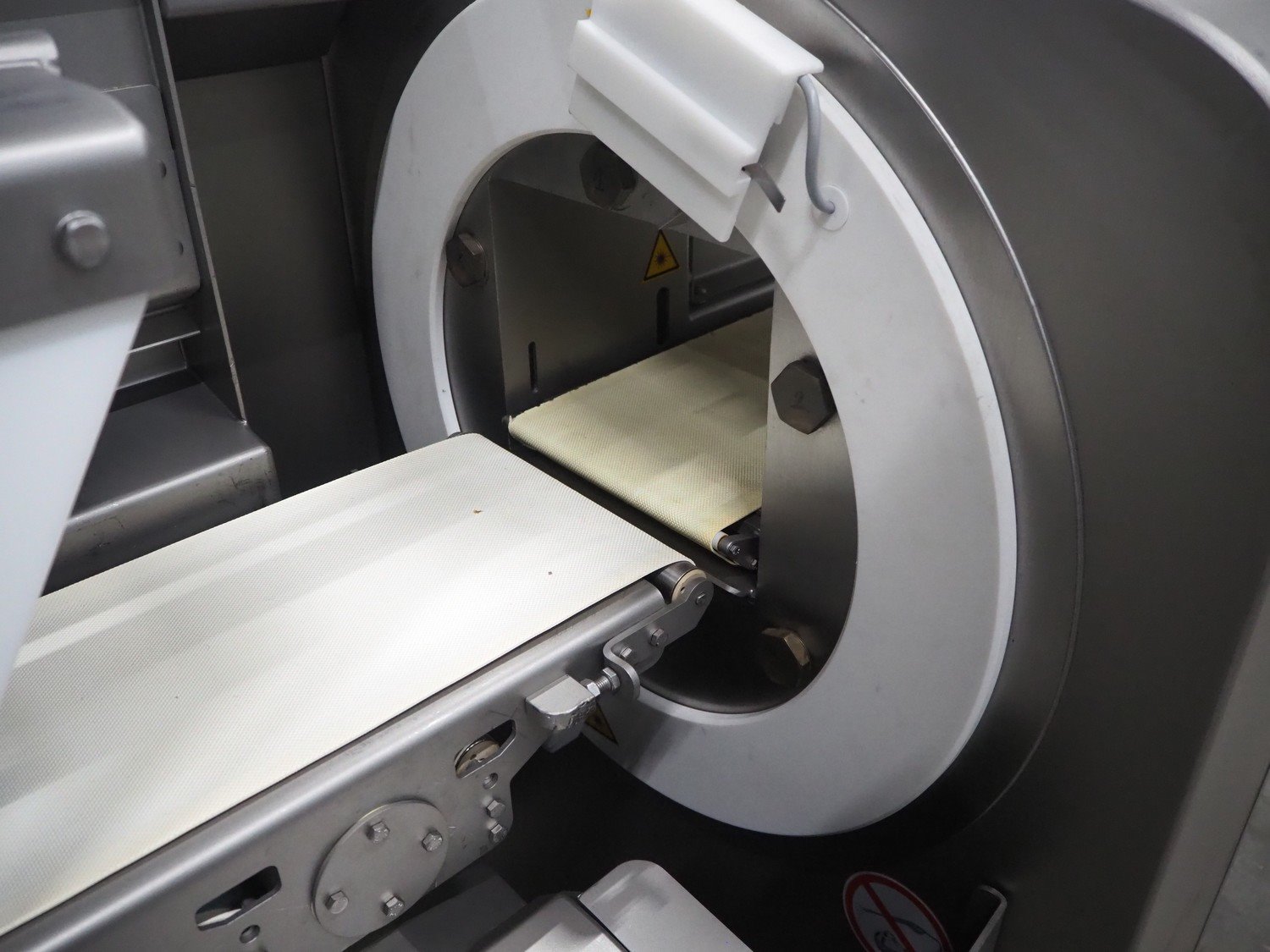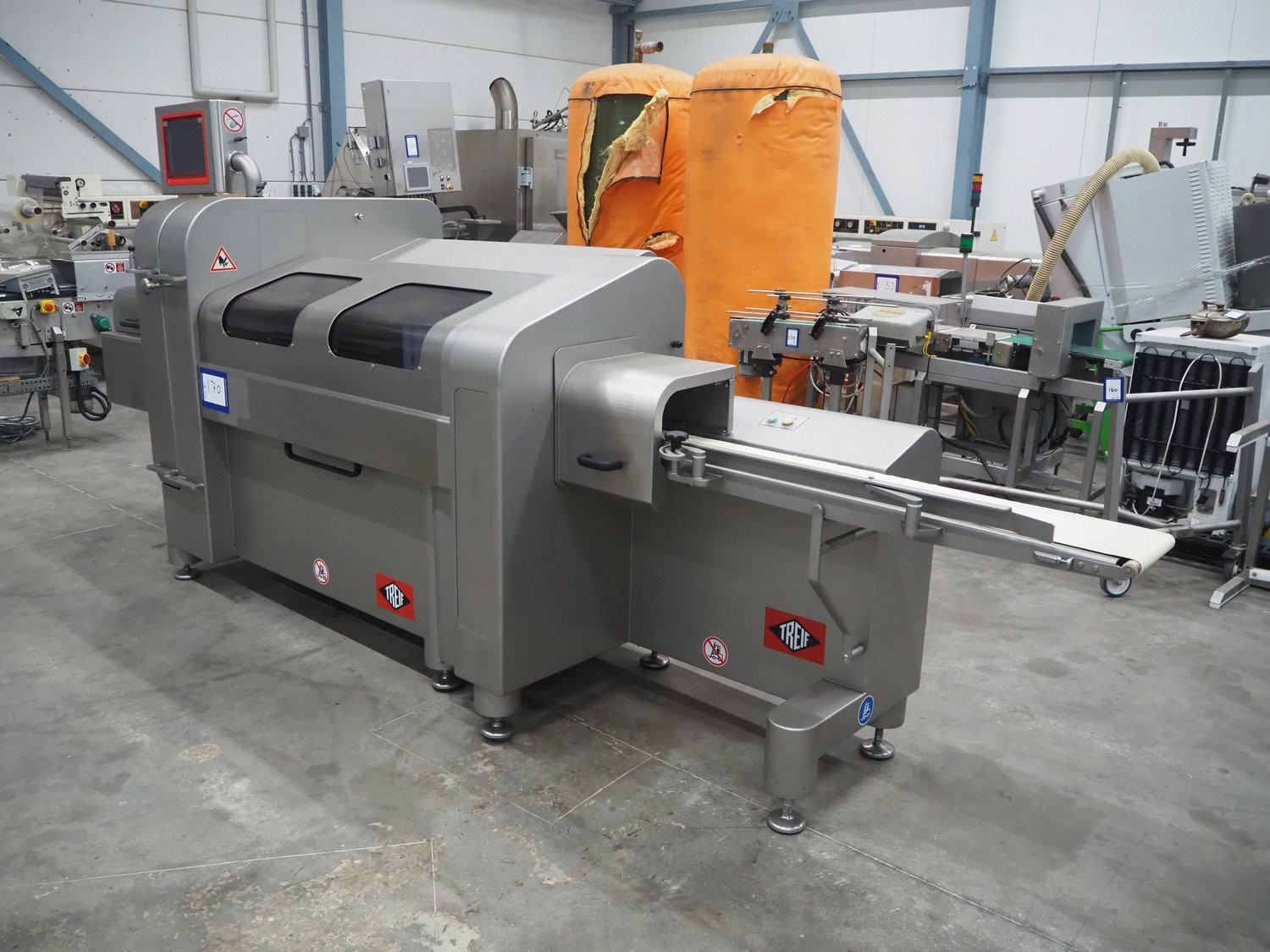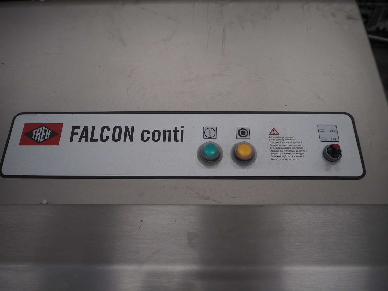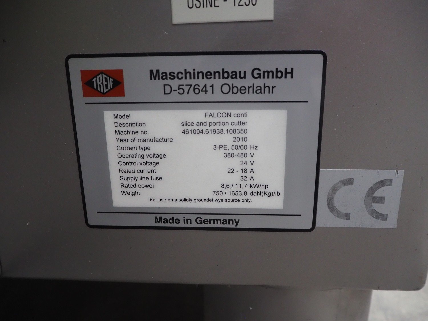 Treif slicer, model: FALCON conti, machine number: 461004.61938.108350, year of construction: 2010, 380-480 V, 3 Ph, 50/60 Hz, 32 A, 8.6/11.7 kW, weight: 750 kg, plastic belt, clearance: 260 mm x 180 mm, total dimensions: 4600 mm x 1250 mm x 1830 mm. Without knife.