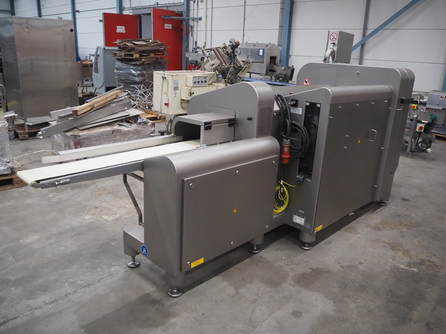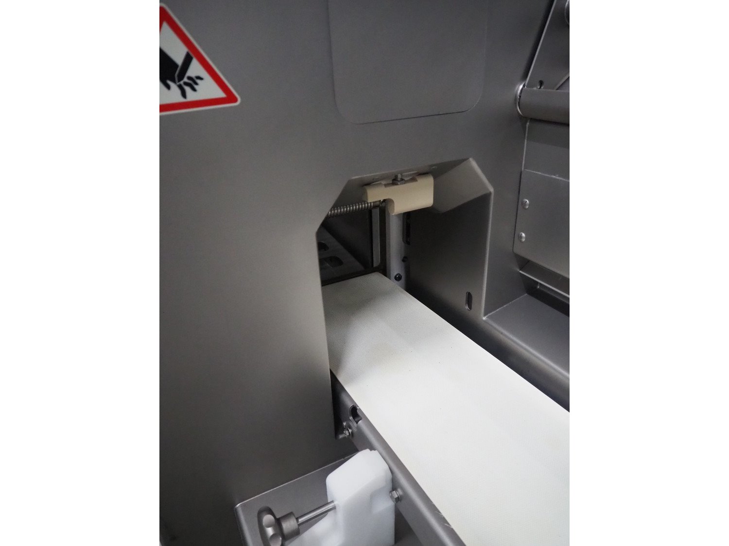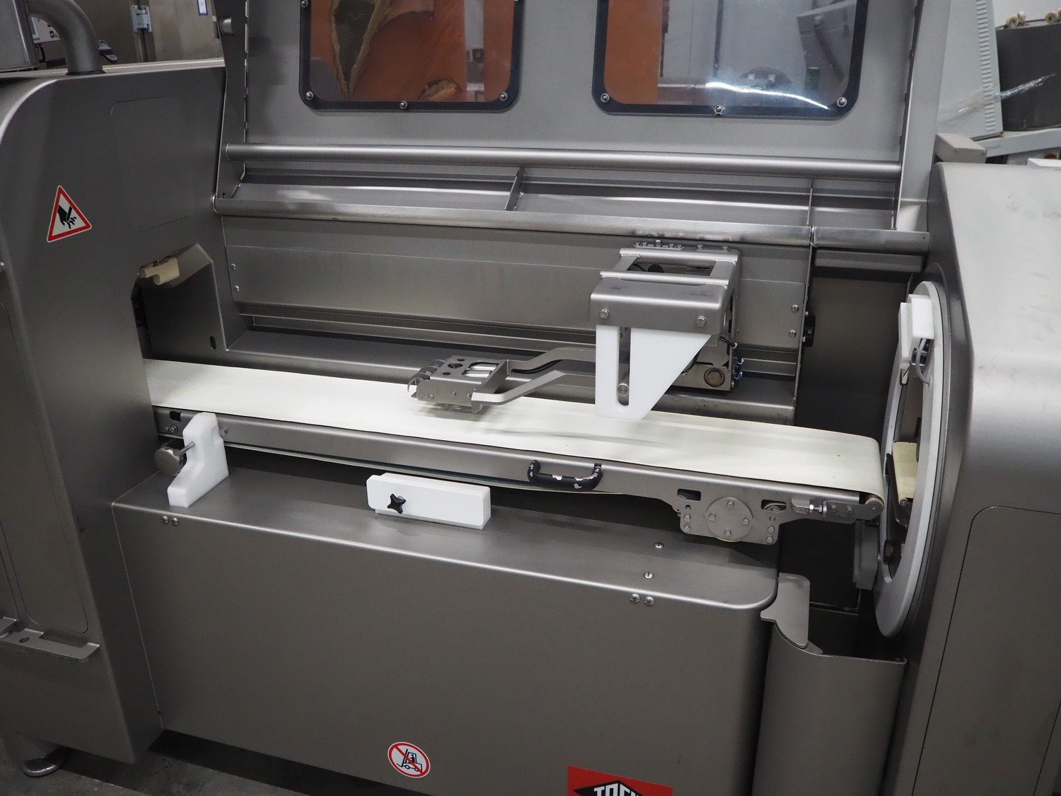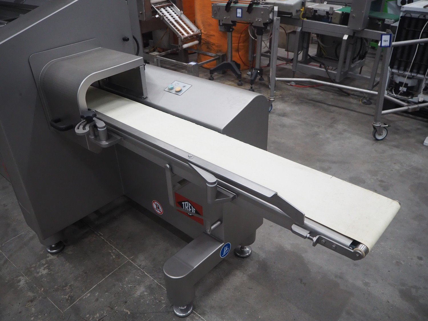 Treif slicer, model: FALCON conti, machine number: 461004.61938.108350, year of construction: 2010, 380-480 V, 3 Ph, 50/60 Hz, 32 A, 8.6/11.7 kW, weight: 750 kg, plastic belt, clearance: 260 mm x 180 mm, total dimensions: 4600 mm x 1250 mm x 1830 mm. Without knife.