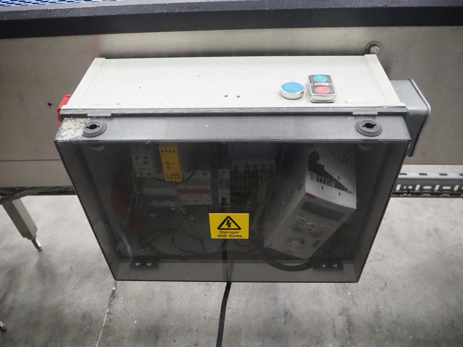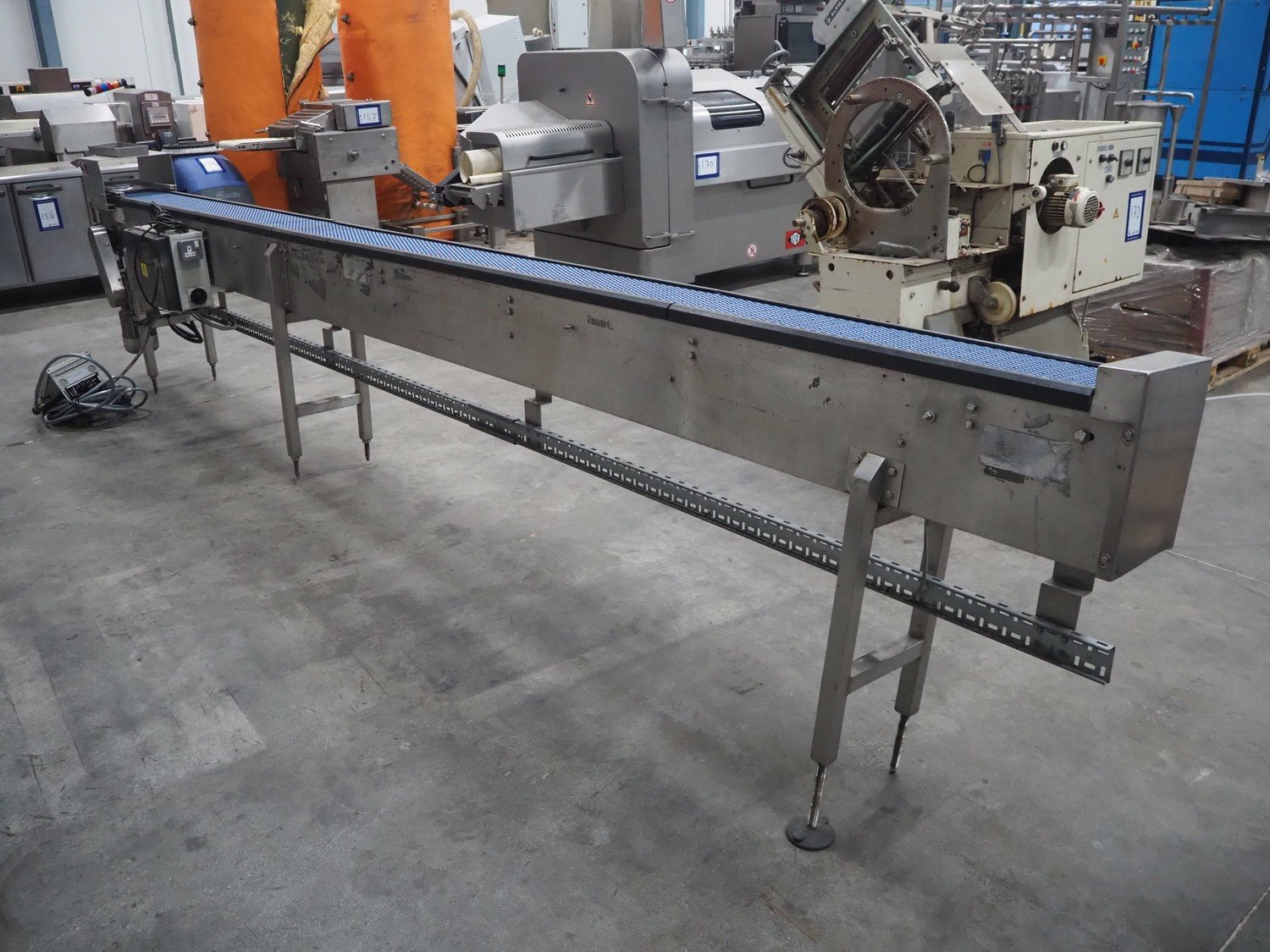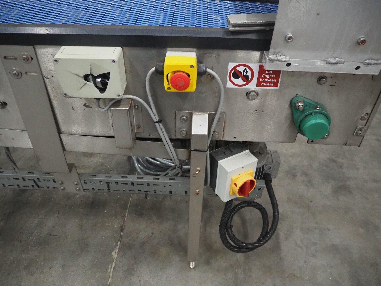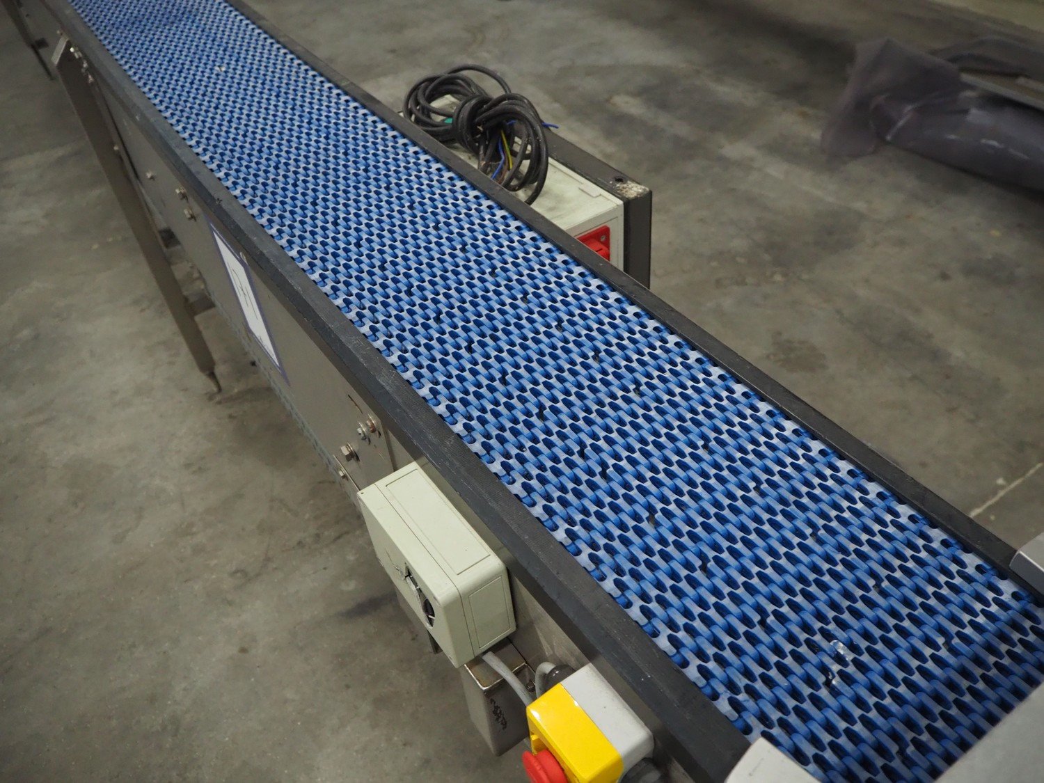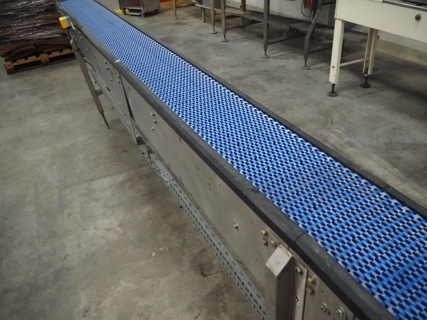 Transport belt, s/s frame, plastic mesh belt, belt width: 210 mm, total dimensions: 5200 mm x 500 mm x 1100 mm.