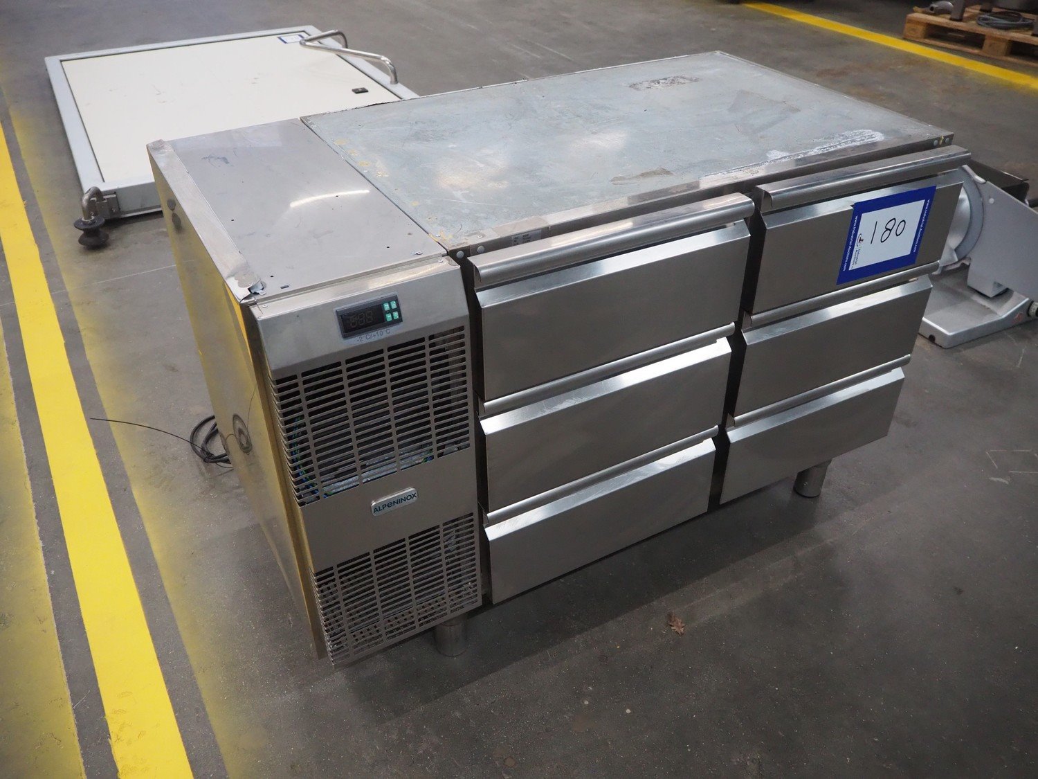 Alpeninox refrigerated counter with 6 drawers, model: HB2PNT, serial number: 61510001, inside dimensions: (6x) 300 mm x 520 mm x 100 mm, total dimensions: 1220 mm x 700 mm x 820 mm.