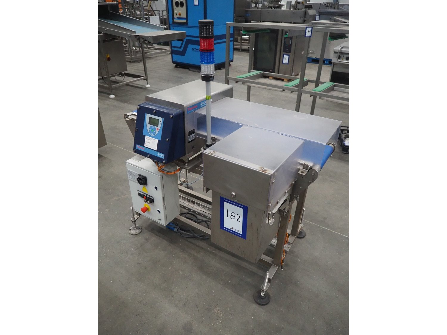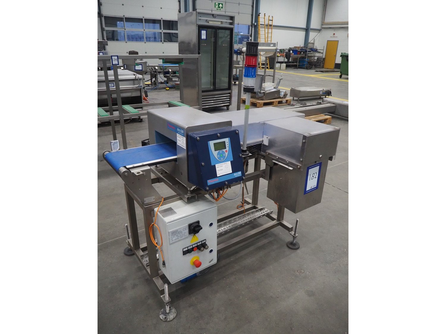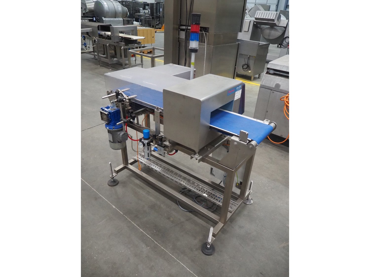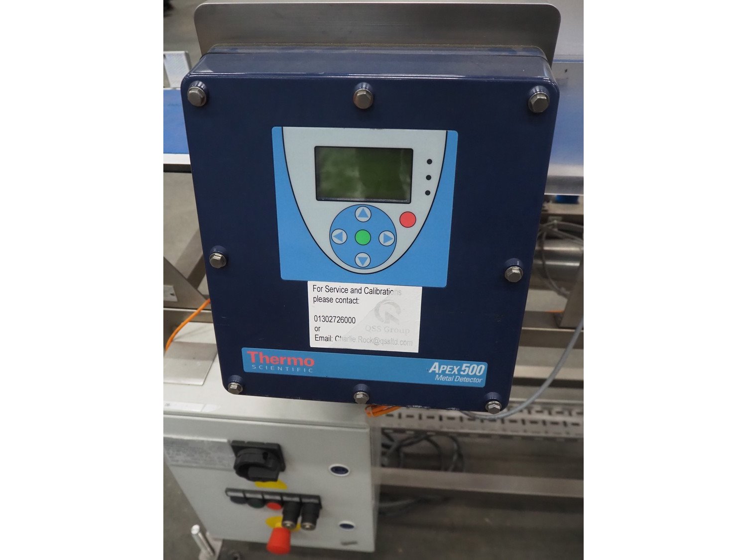 Thermo Fisher metal detector with rejecter, model: Apex500, serial number: 9628, year of construction: 2012, 120/230 V, 50/60 Hz, 0.4 A, plastic belt, belt width: 250 mm, clearance: 350 mm x 150 mm, total dimensions: 1400 mm x 960 mm x 1460 mm.
