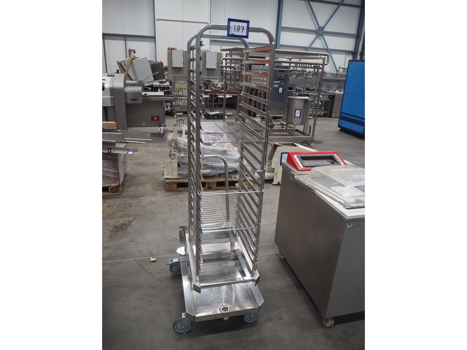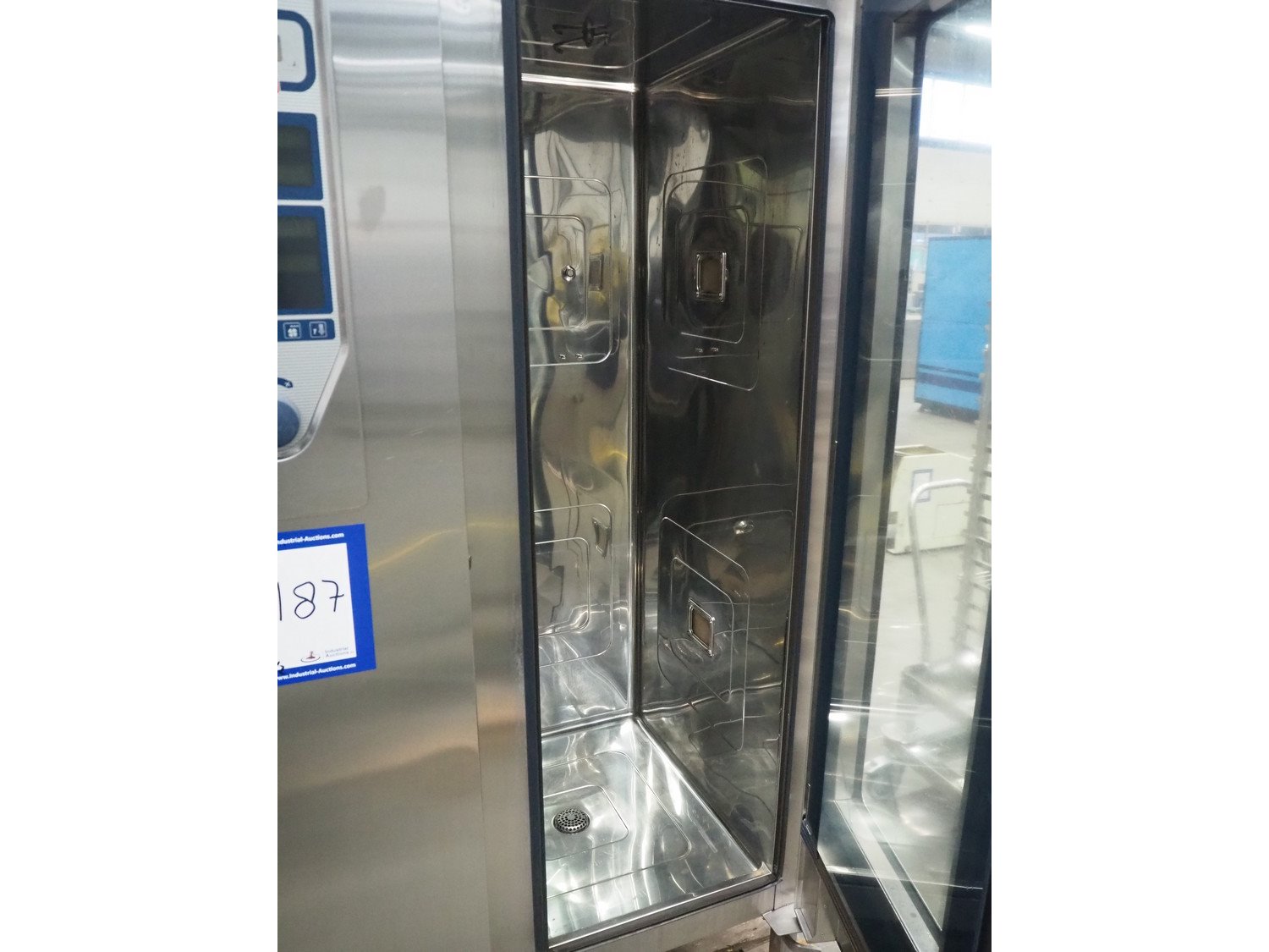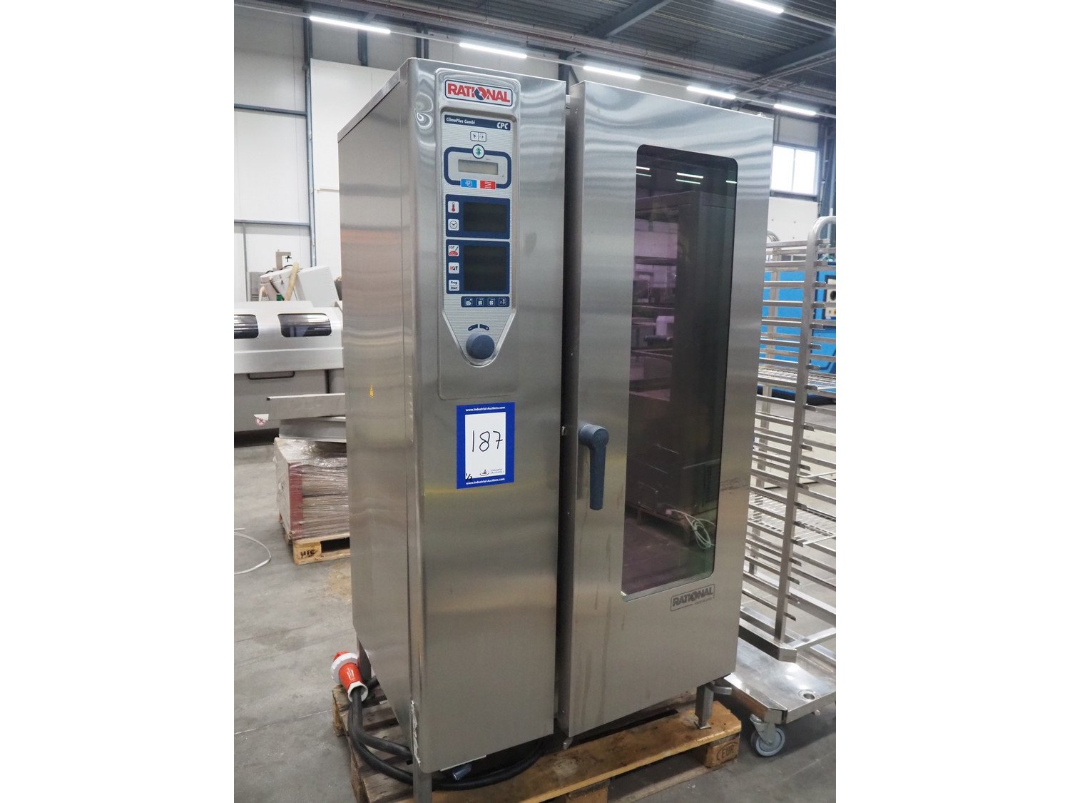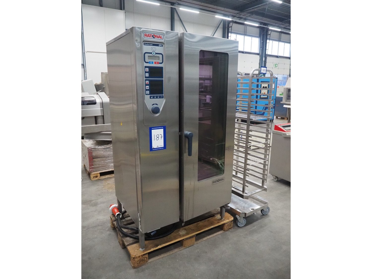 Rational combi steamer, model: ClimaPLus Combi CPC 201, serial number: E21CD02111079329, 400 V, 50 Hz, electric heated, s/s trolley, 20 floors, dimensions each floor: 530 mm x 330 mm, dimensions trolley: 850 mm x 540 mm x 1800, total dimensions: 1000 mm x 900 mm x 1900 mm.