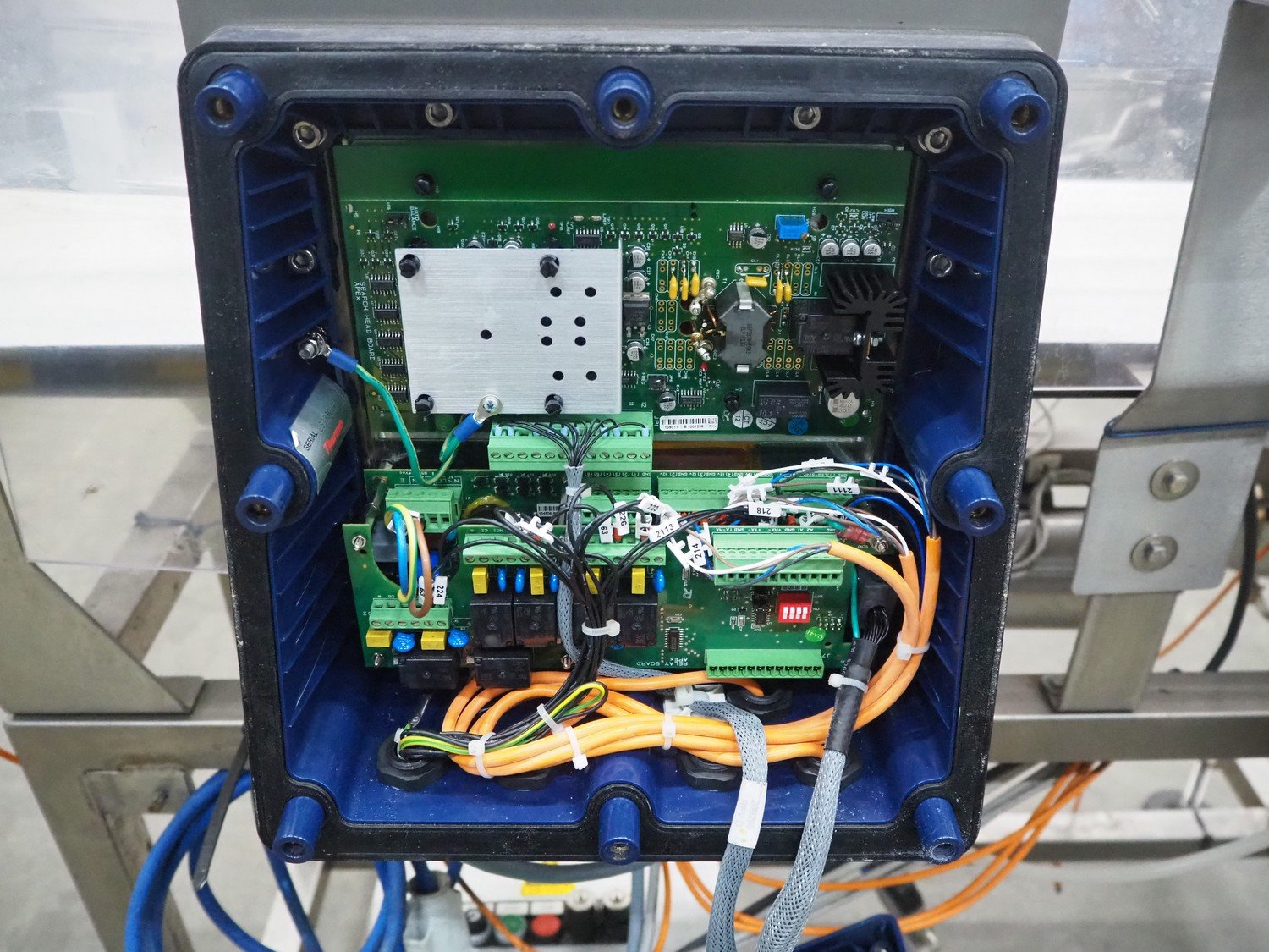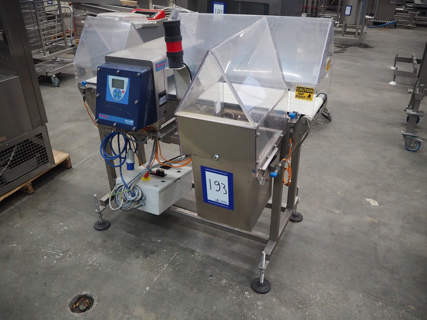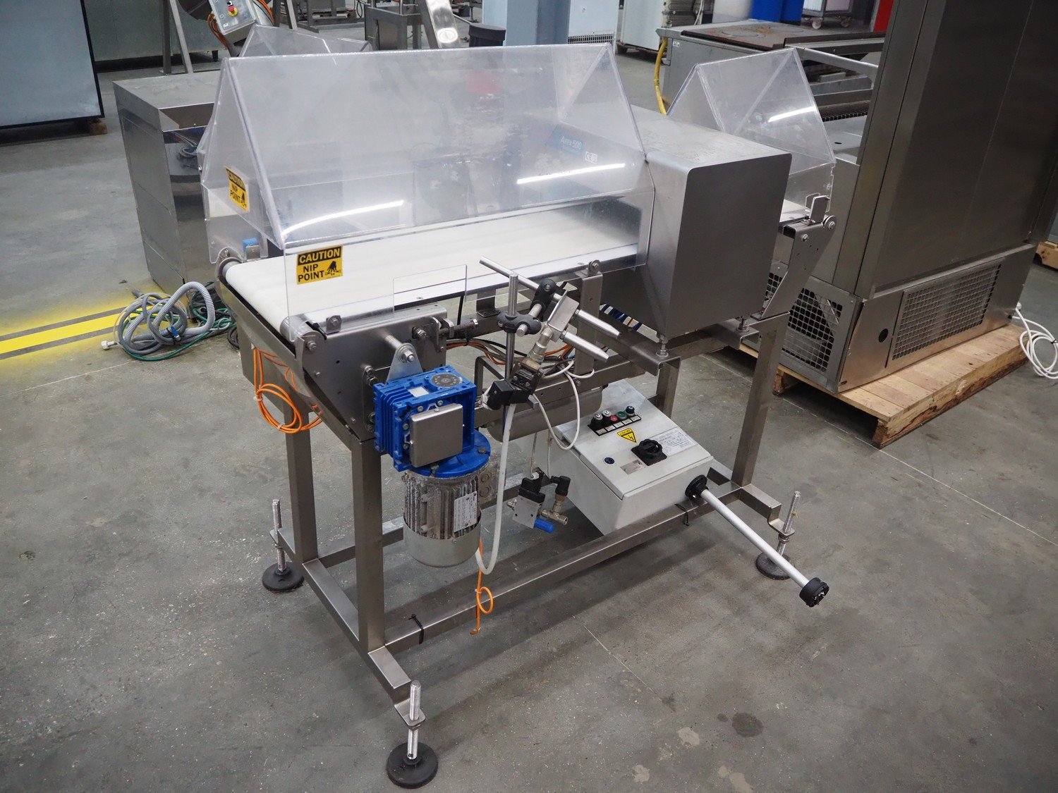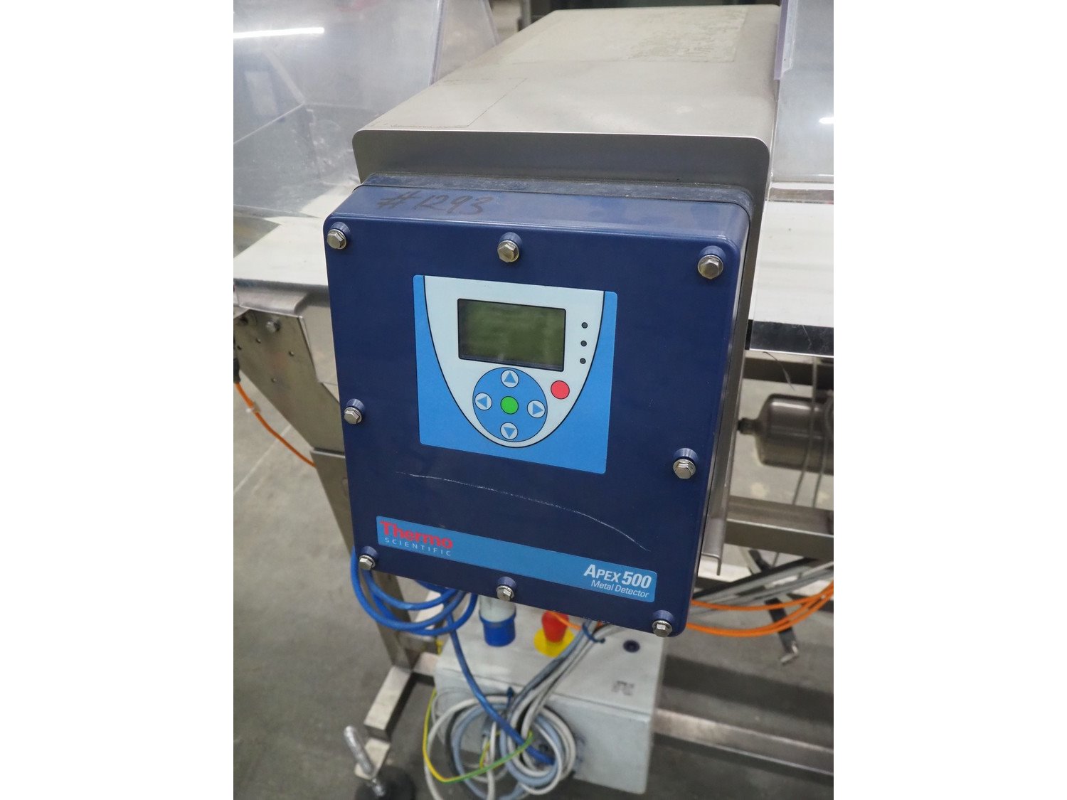 Thermo Fischer metal detector with rejector, model: Apex500, serial number: 9627, year of construction: 2012, 230 V, 50 Hz, plastic belt, belt width: 250 mm, clearance: 300 mm x 100 mm, total dimensions: 1400 mm x 1100 mm x 1350 mm.