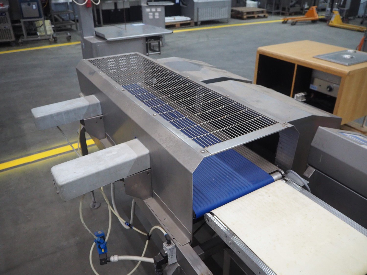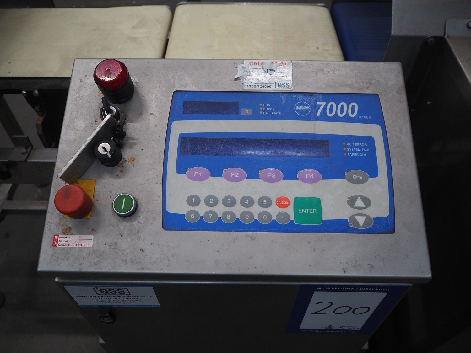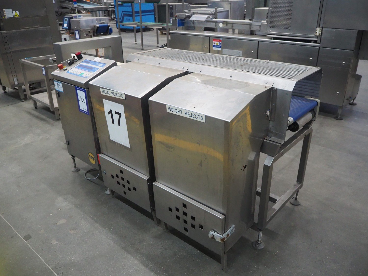 Loma systems checkweigher with metal detector and double rejector, serial number: 71A001, 240 V, 1 Ph, 50 Hz, plastic belt, belt width: 300 mm, clearance: 450 mm x 130 mm, total dimensions: 2750 mm x 1000 mm x 1050 mm.