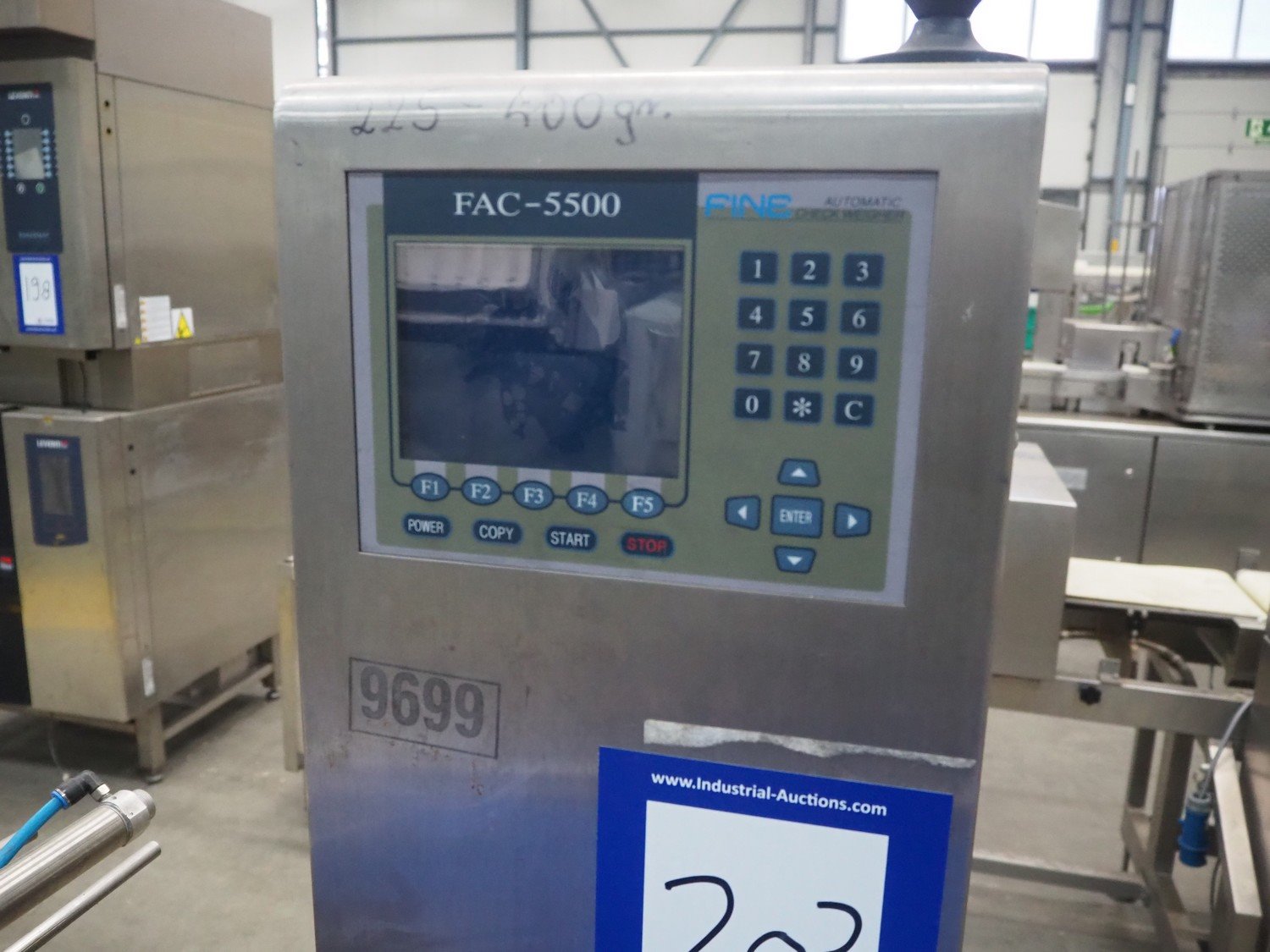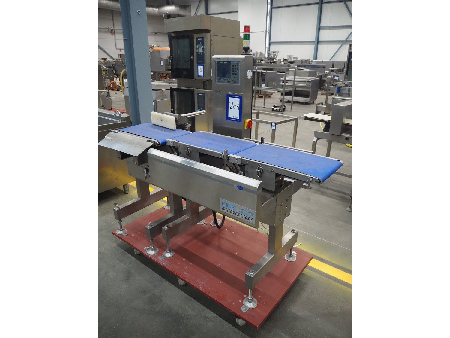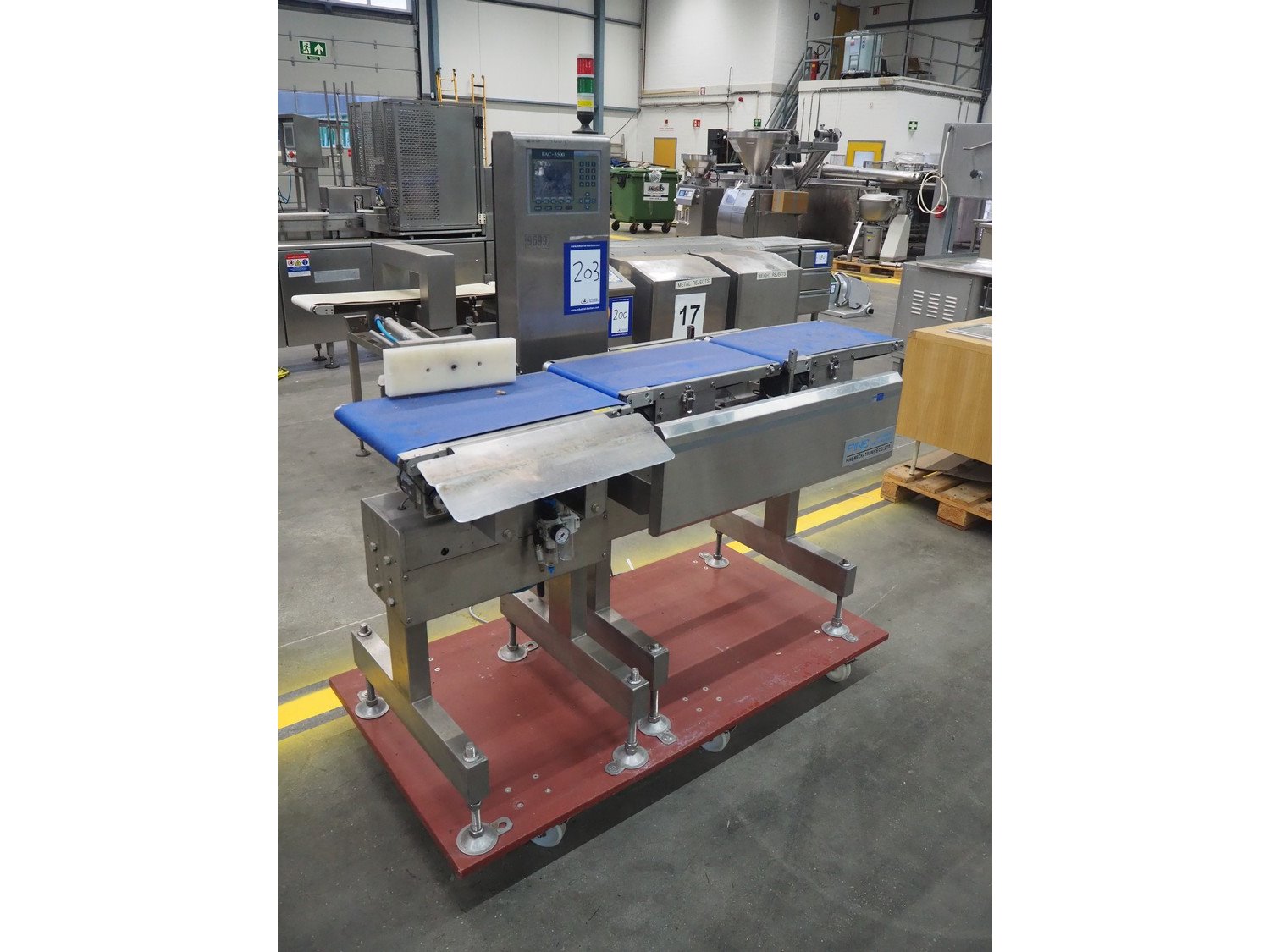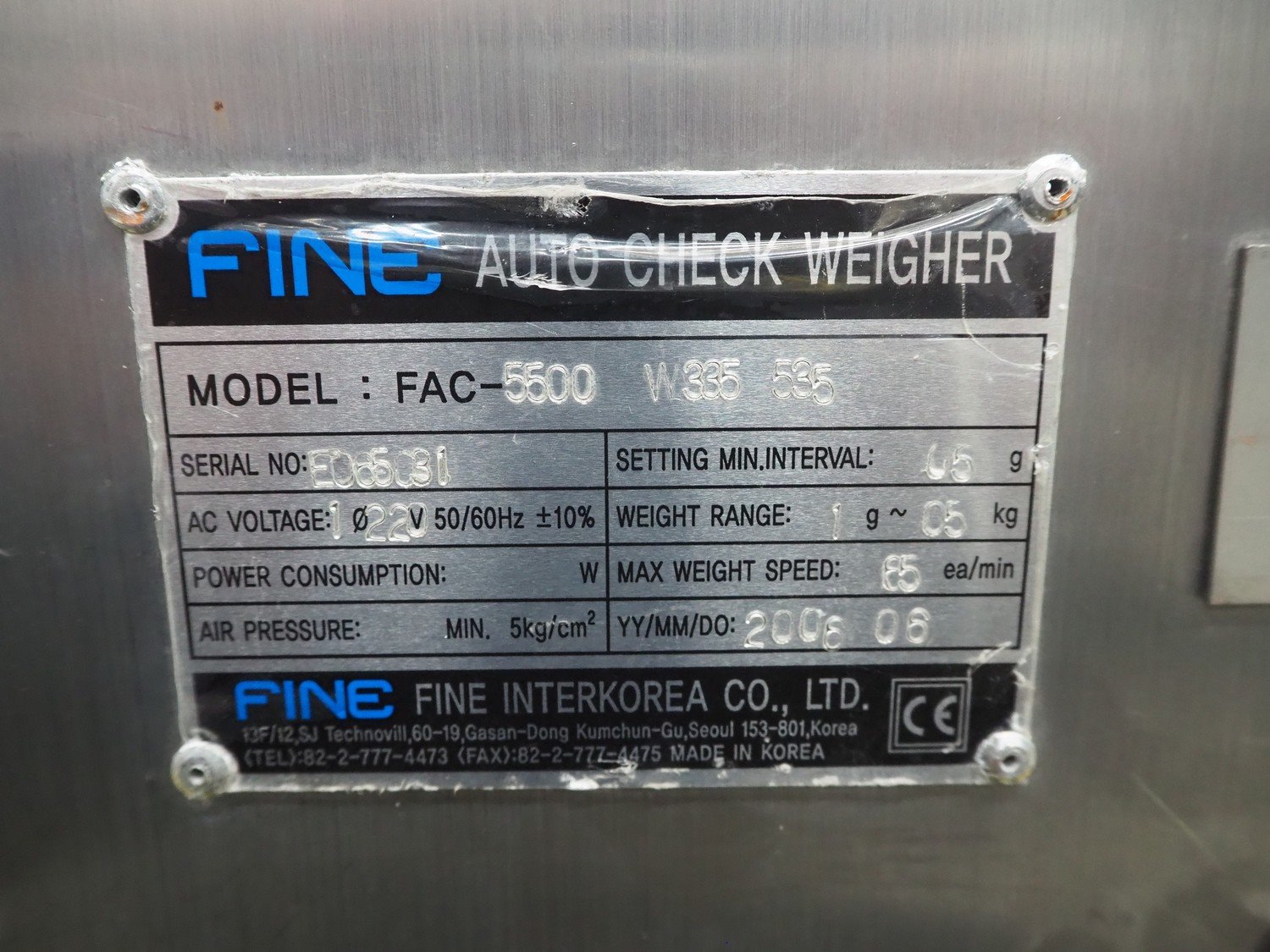 Fine Interkorea checkweigher with rejecter, model: FAC-5500 W335 535, serial number: E065031, year of construction: 2006/06, weight range: 1-500 gram, plastic belt, belt width: 300 mm, total dimensions: 1670 mm x 900 mm x 1630 mm.
