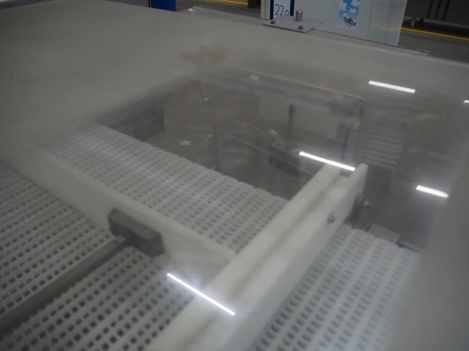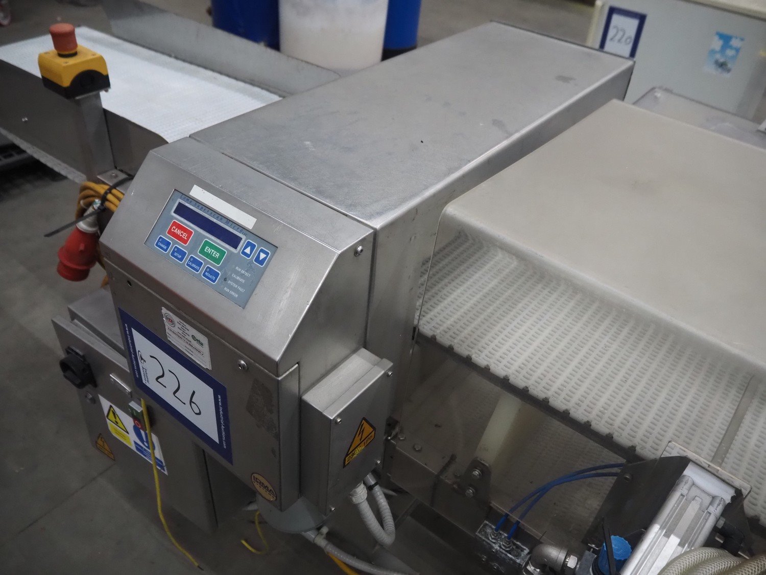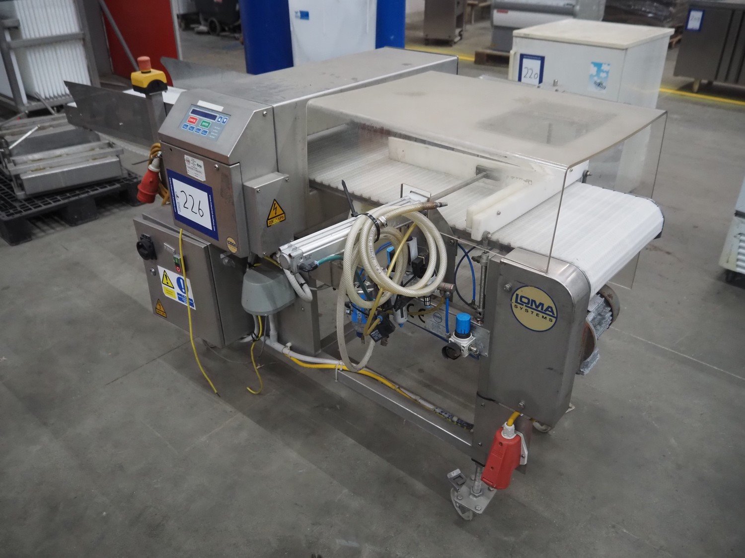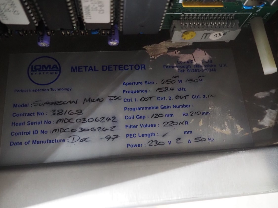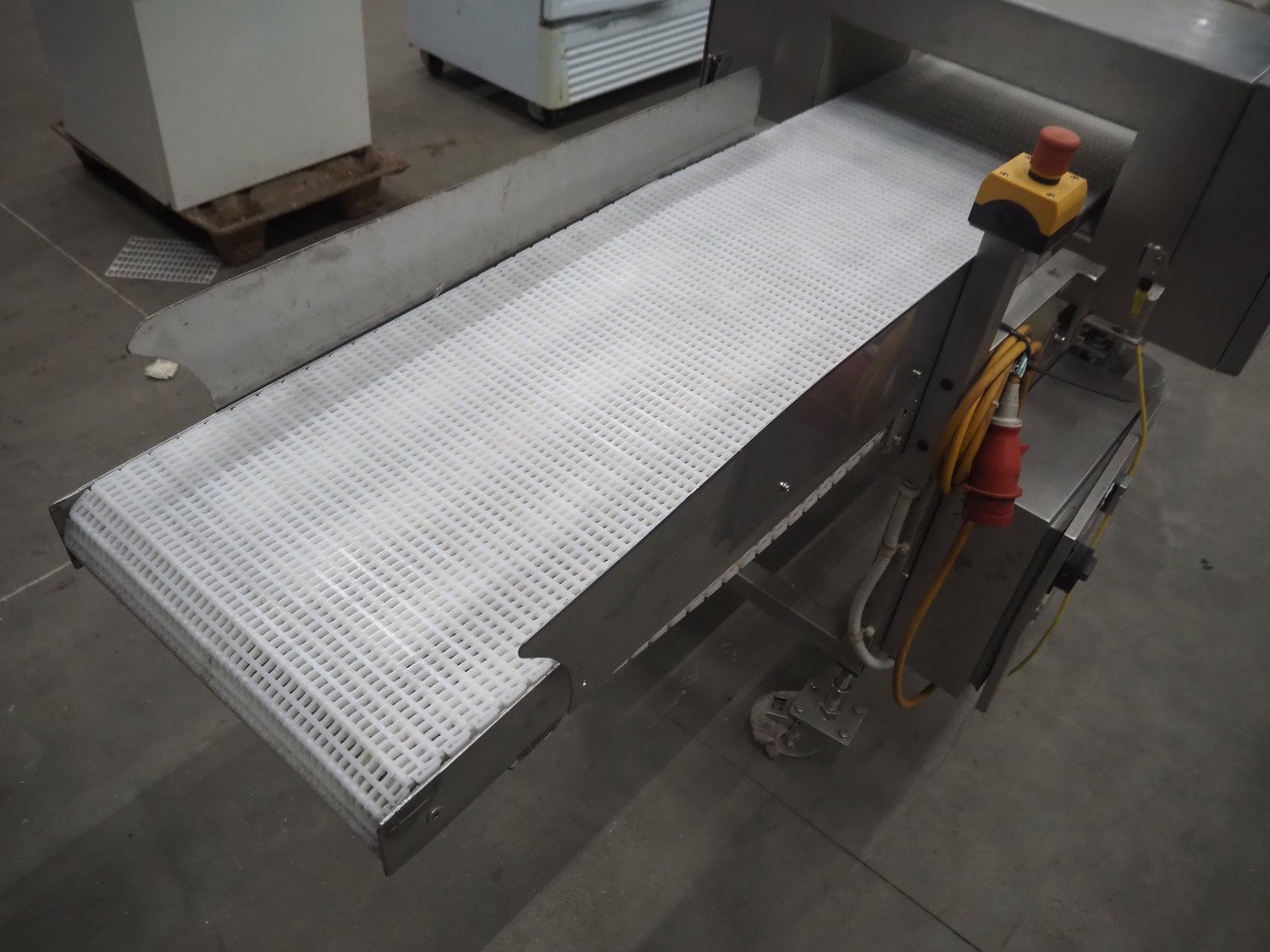 Loma Systems mobile metal detector with rejector, year of construction: 1997, plastic mesh belt, belt width: 400 mm, clearance: 450 mm x 120 mm, total dimensions: 2200 mm x 1200 mm x 1100 mm.
