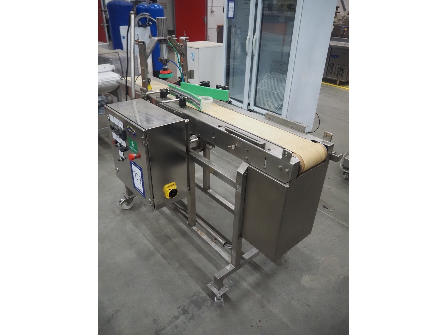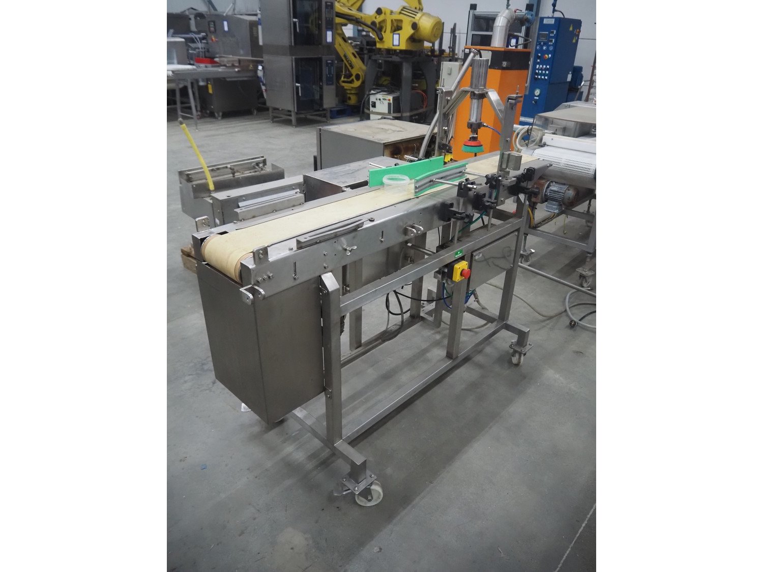 Mobile lid closing machine, s/s frame, plastic belt, belt width: 150 mm, diameter press: 90 mm, total dimensions: 1750 mm x 700 mm x 1400 mm.