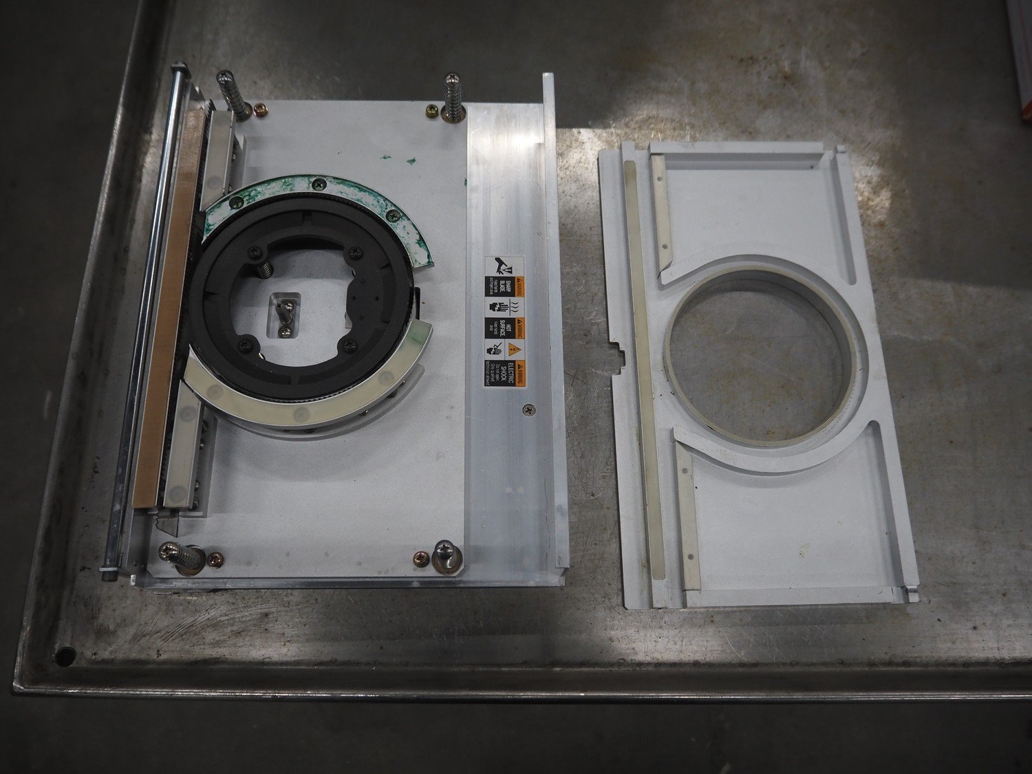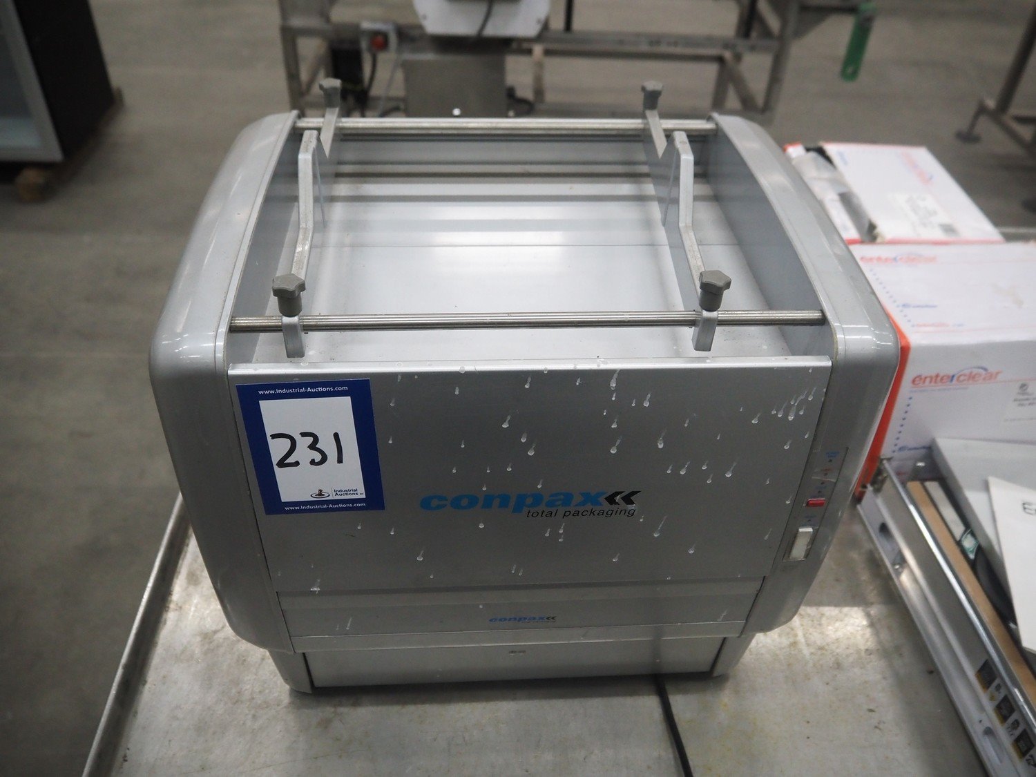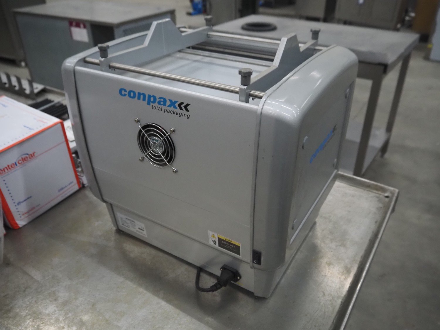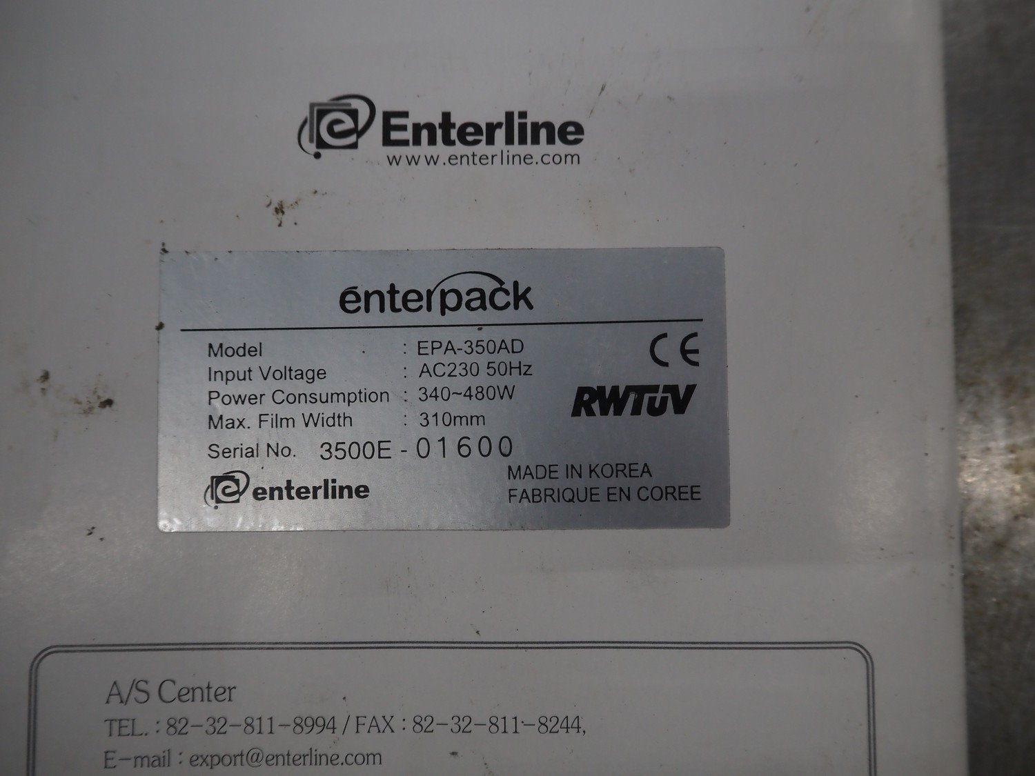 Enterpack/Conpax packaging machine, model: EPA-350AD, serial number: 3500E-01600, 230 V, 50 Hz, 340-480 Watt, diameter dye: 135 mm, maximum film width: 310 mm, dimensions: 452 mm x 354 mm x 410 mm.