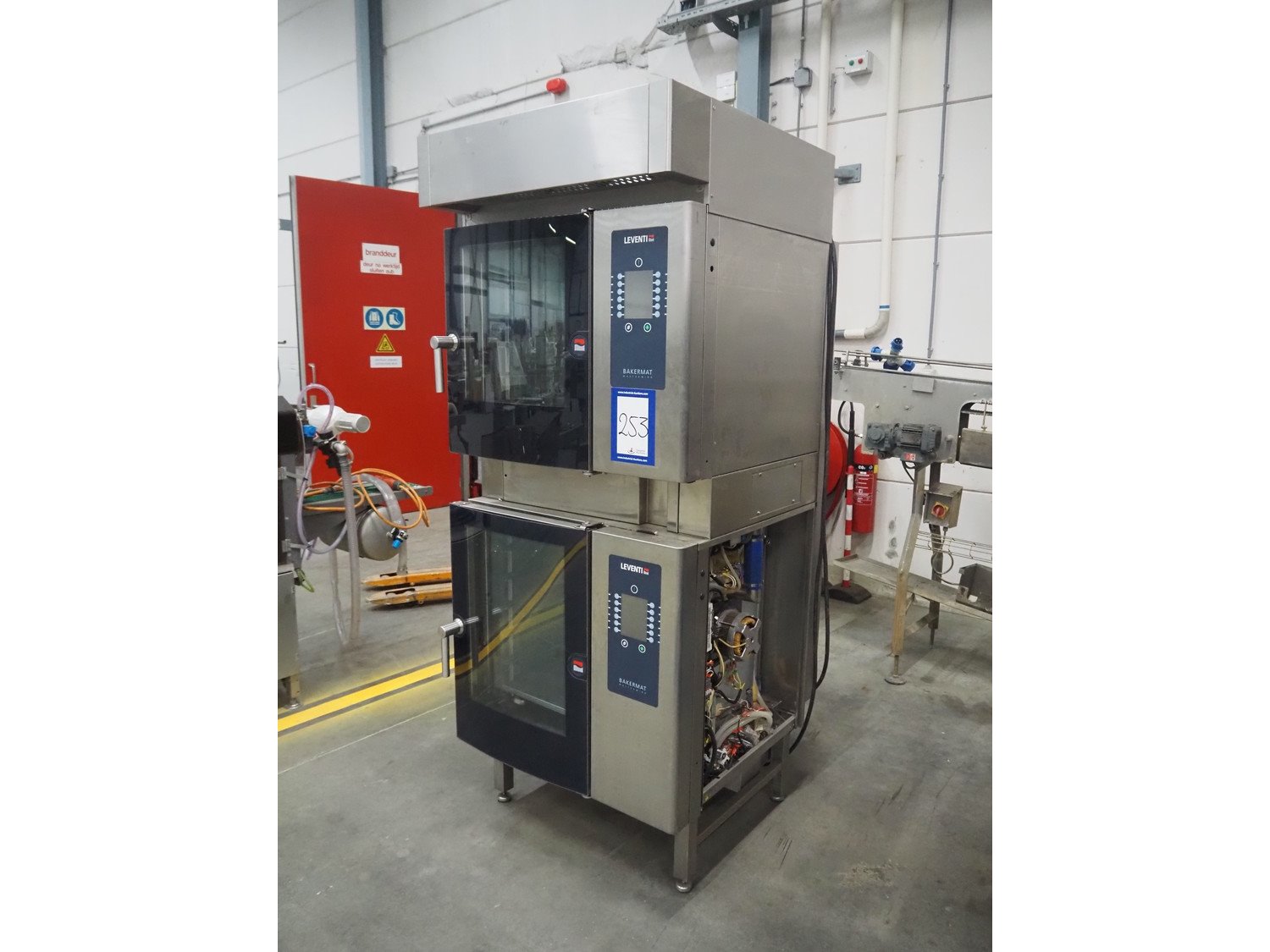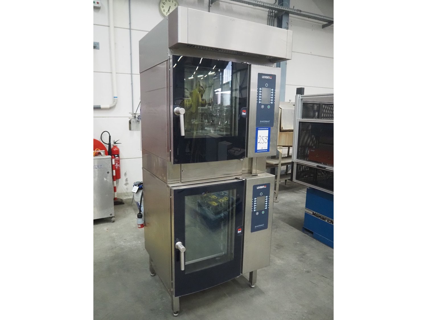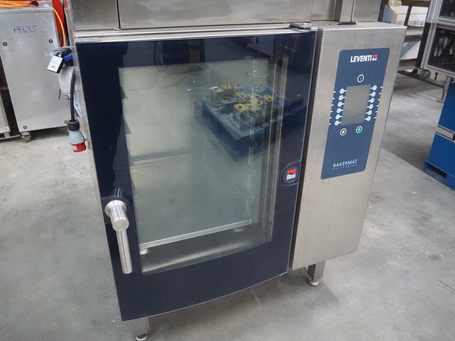 Leventi double stacked combi steamer with hood, 5 and 6 floors, dimensions each floor: 600 mm x 400 mm, total dimensions: 1050 mm x 900 mm x 2210 mm. Missing cover.