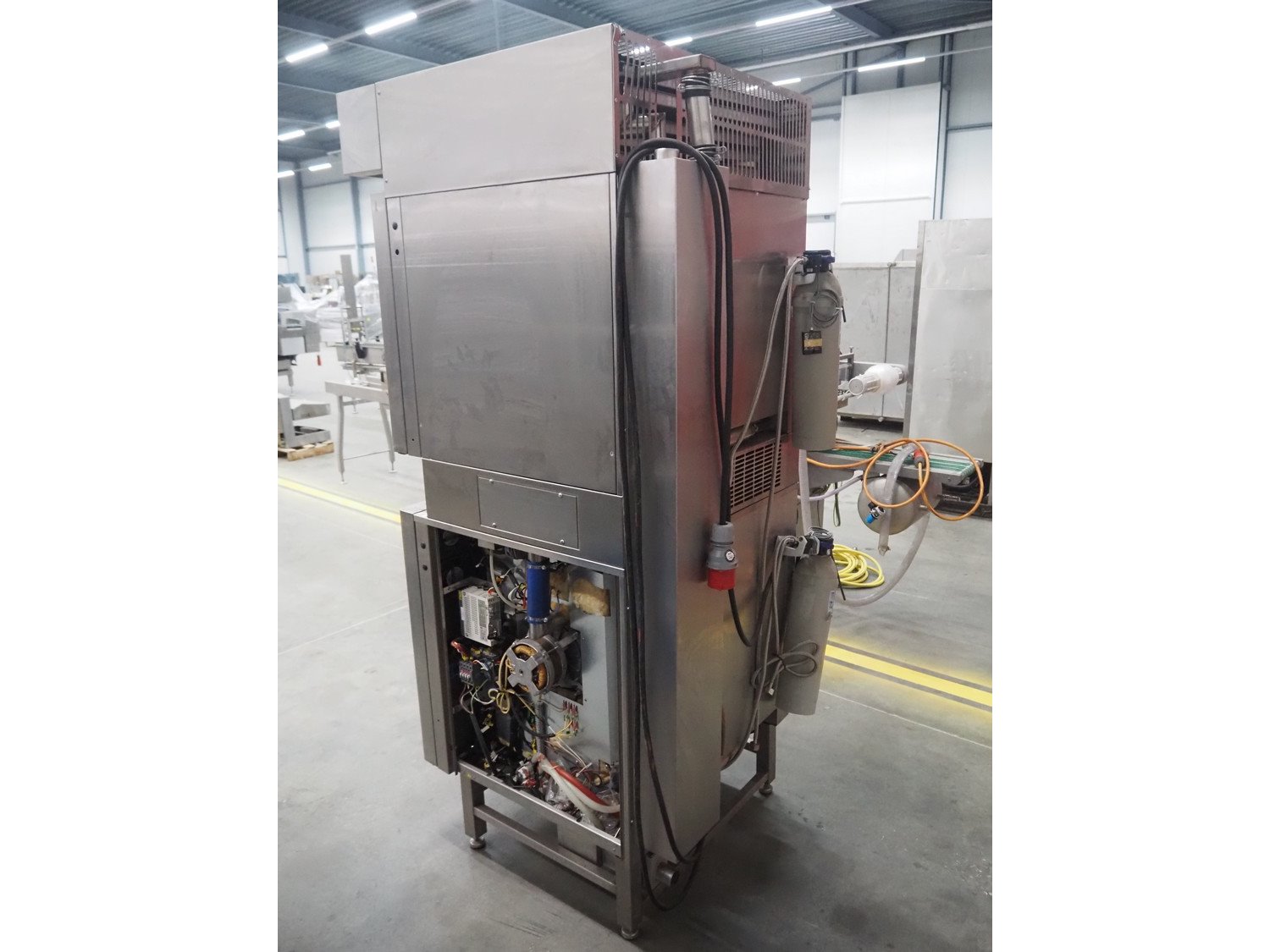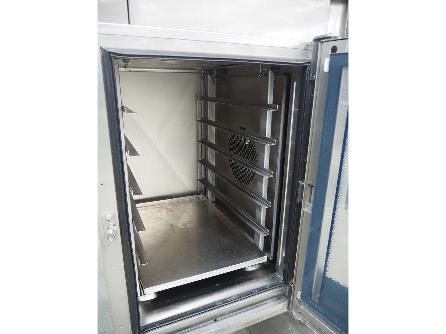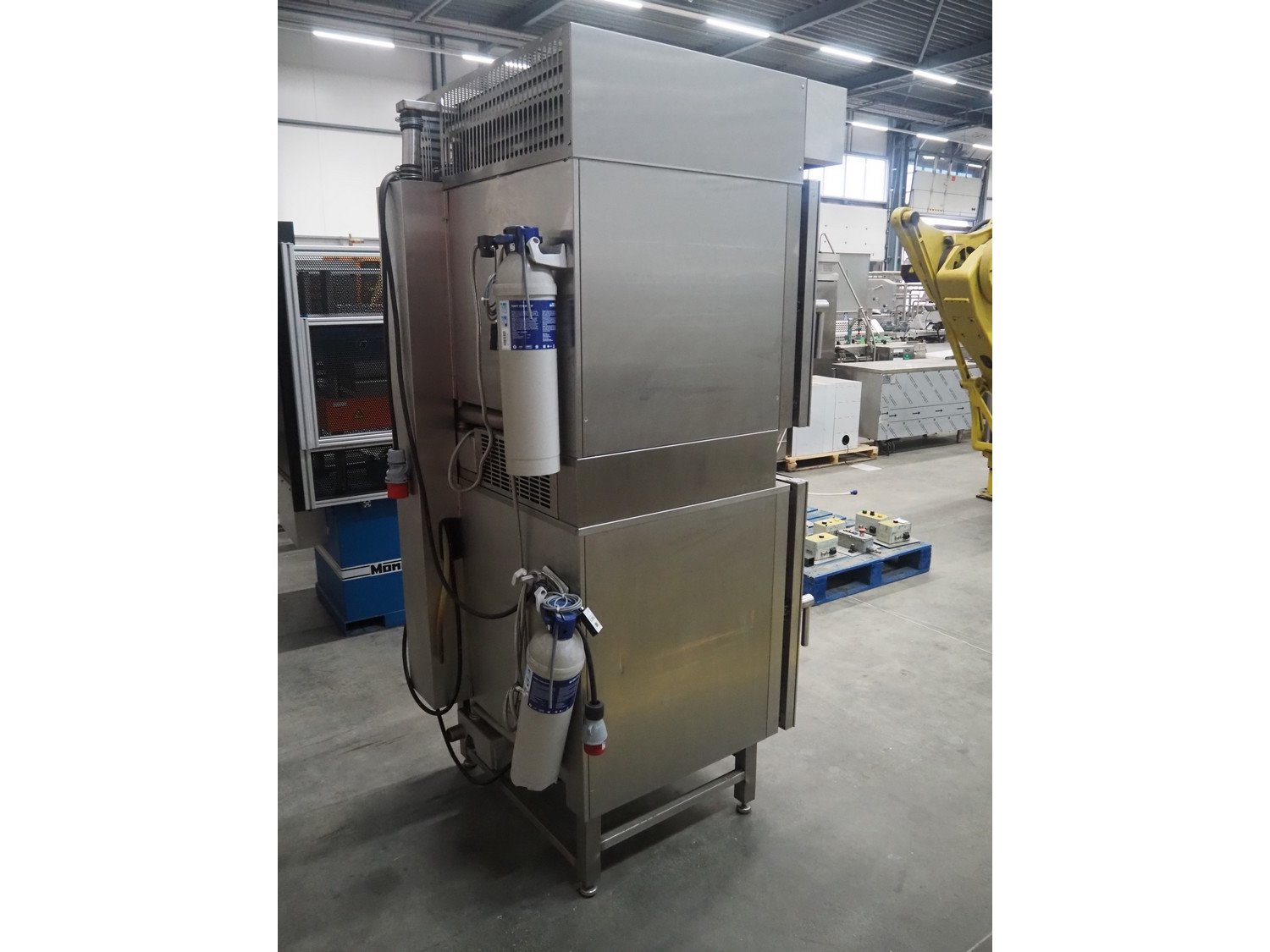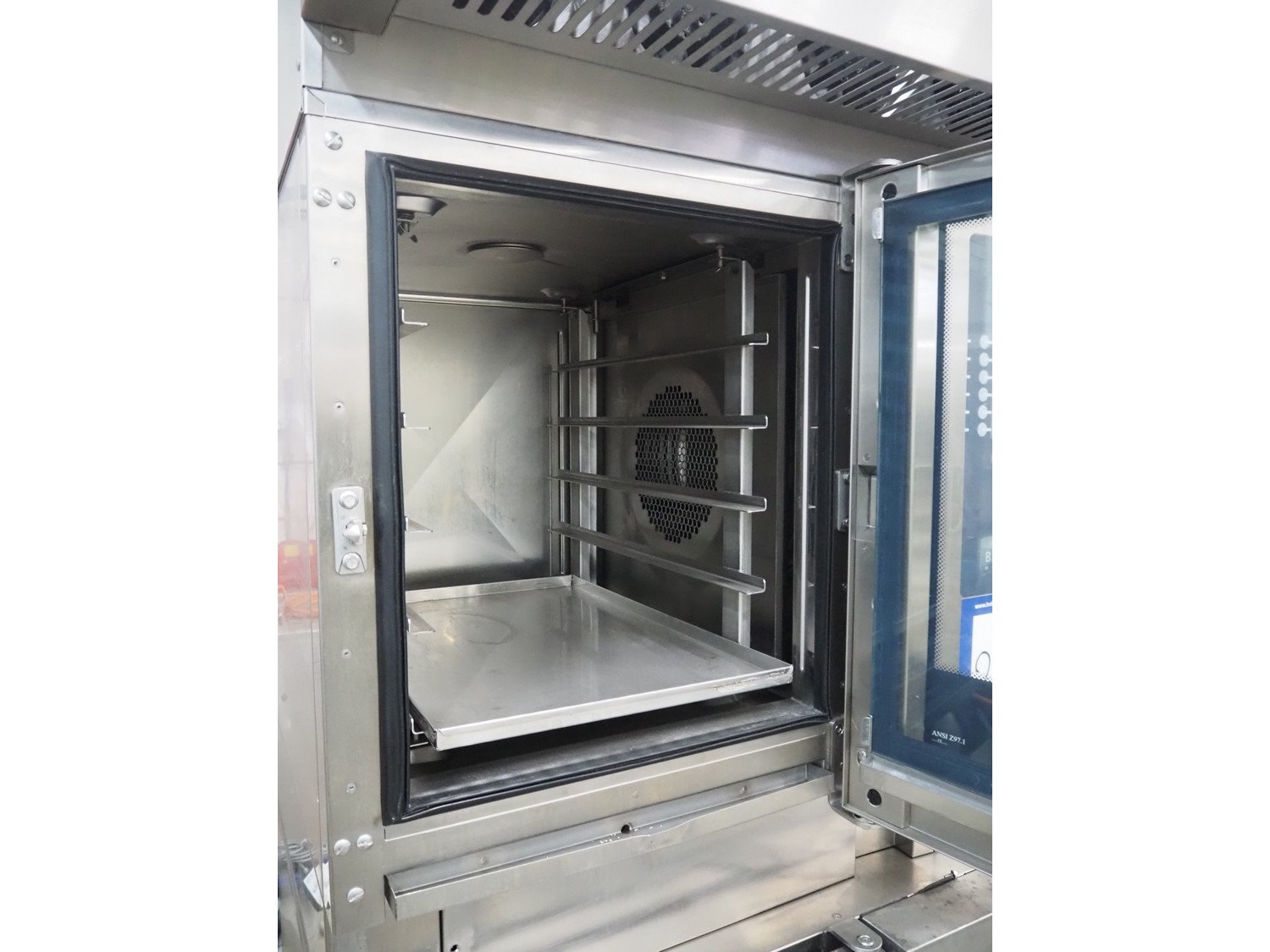 Leventi double stacked combi steamer with hood, 5 and 6 floors, dimensions each floor: 600 mm x 400 mm, total dimensions: 1050 mm x 900 mm x 2210 mm. Missing cover.