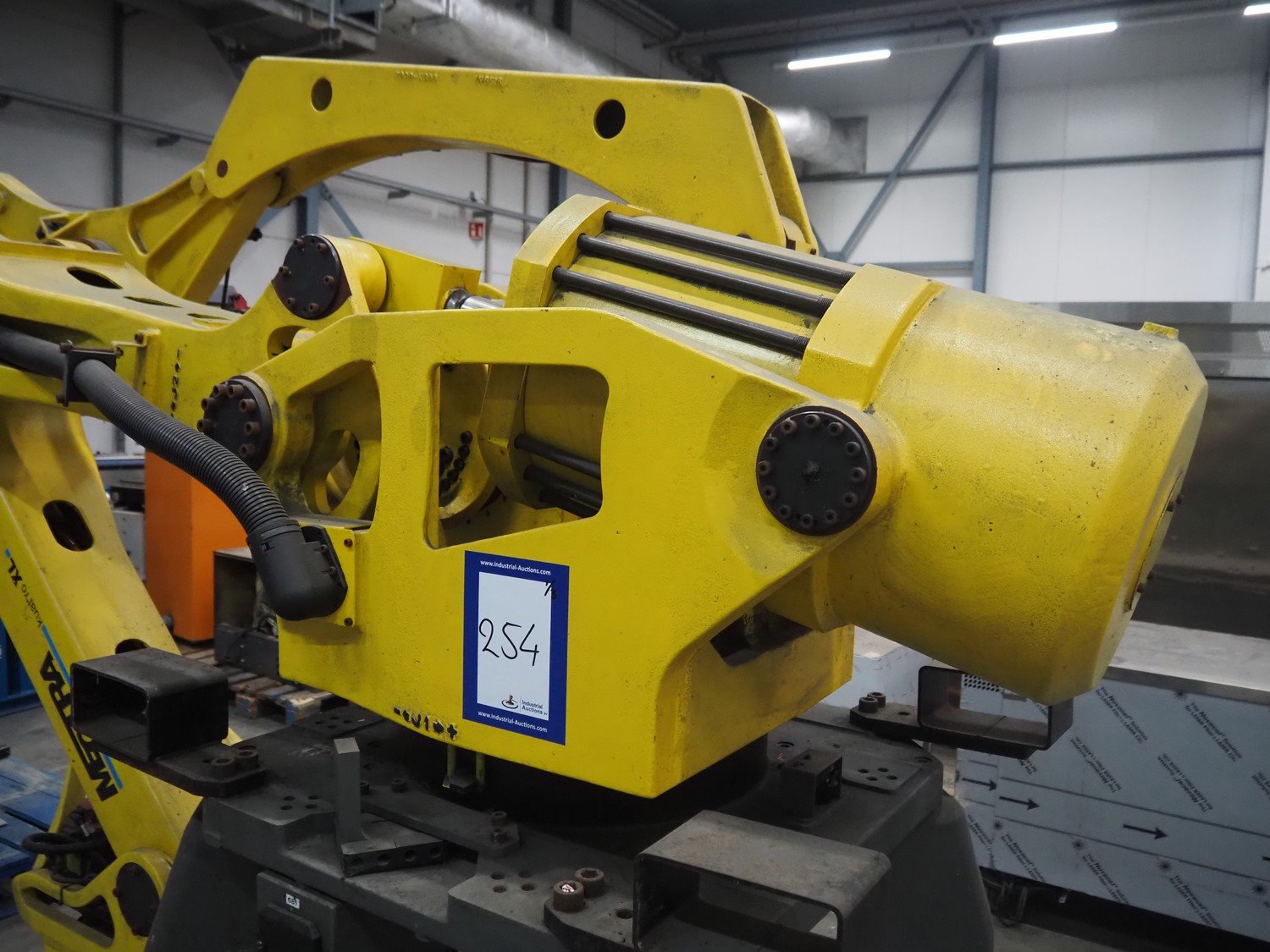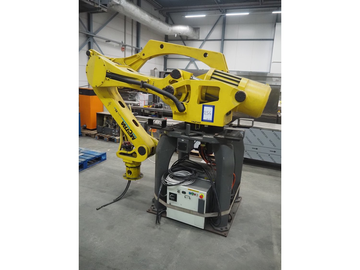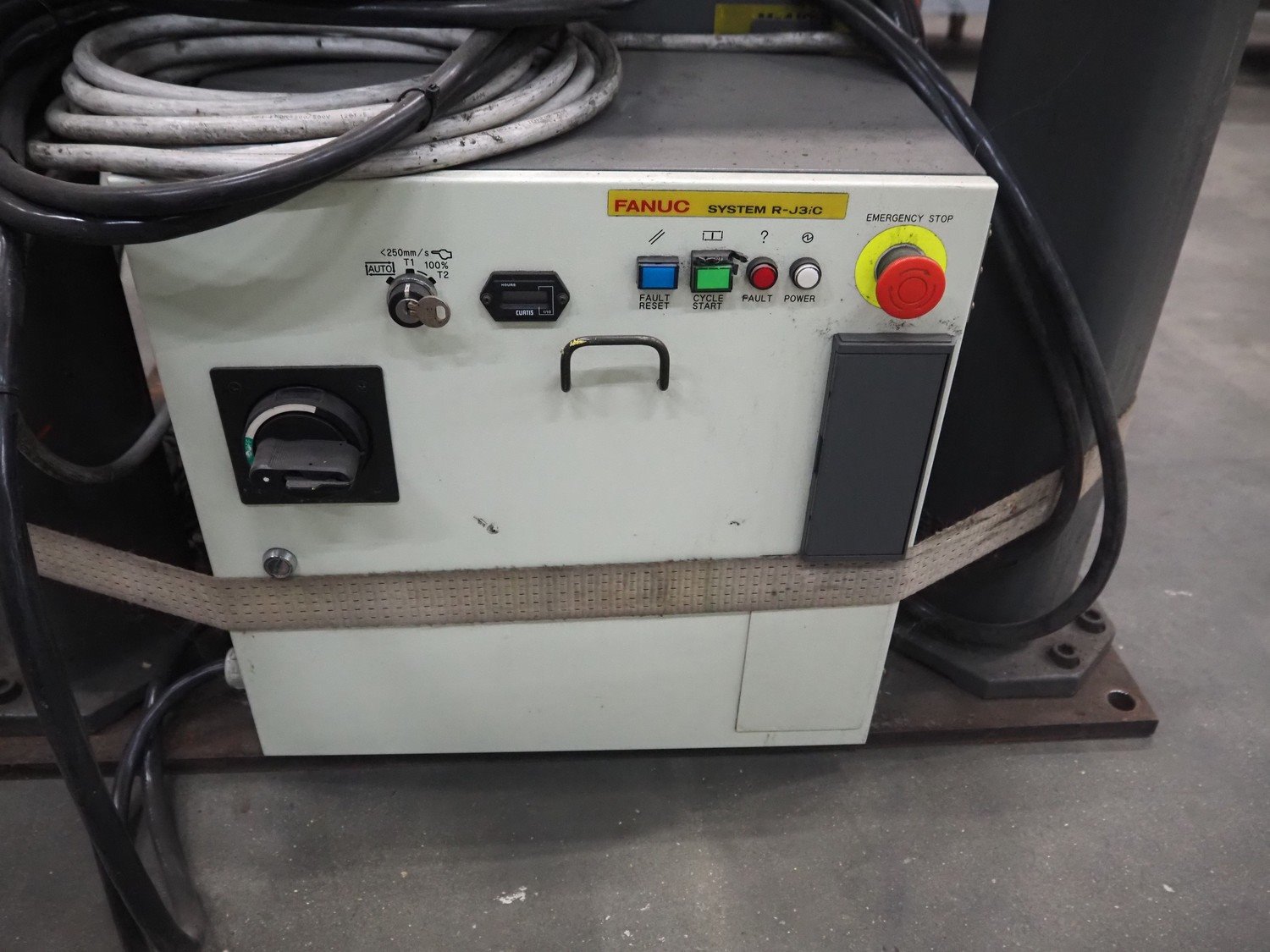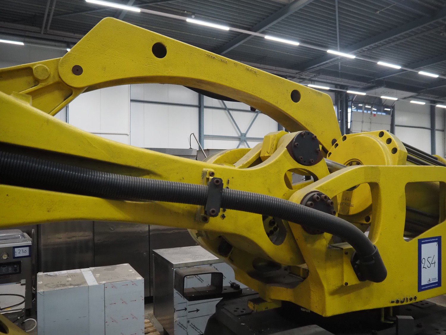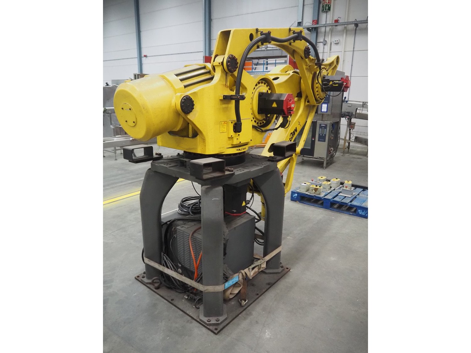Fanuc palletizing robot with part for palletising system, pallet size: 1200 mm x 1000 mm x 145 mm, system: R-J3IC, type robot: A05B-2513-B010, dimensions robot: 2950 mm x 1200 mm x 2290 mm, dimensions platform: 1700 mm x 1550 mm x 1700 mm. Including pallet with parts.
