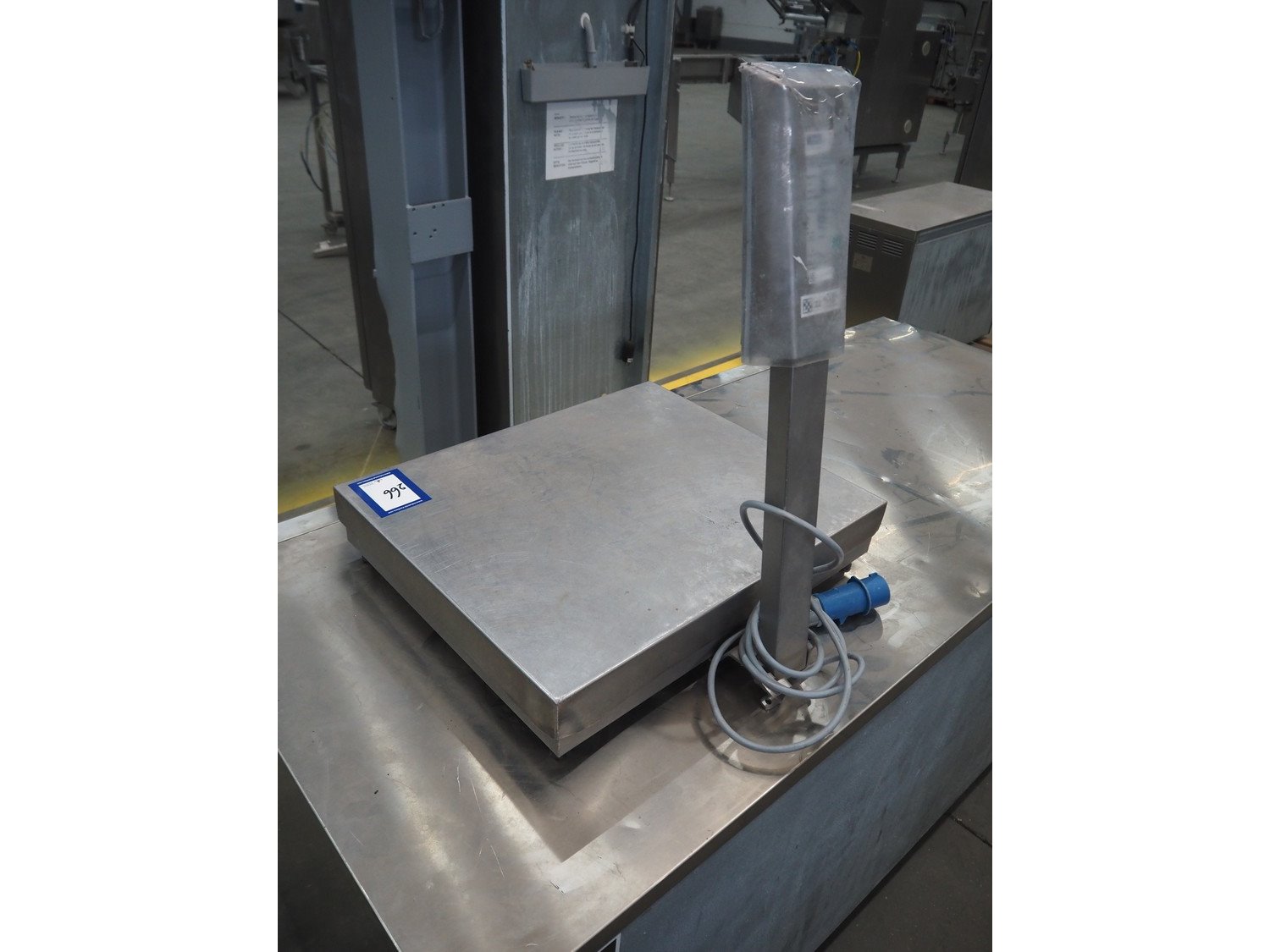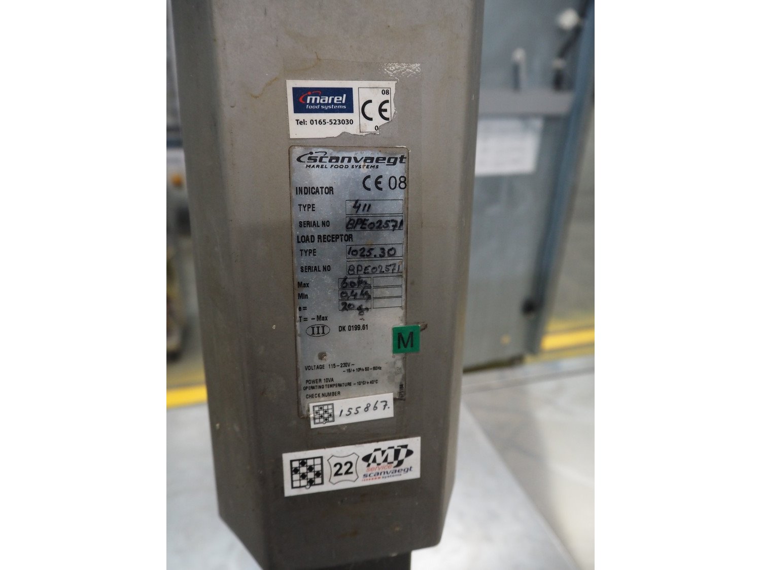 Scanvaegt weighing scale with indicator, type indicator: 411, serial number: BPE02571, type receptor: 1025.30, serial number: BPE02571, maximum weight: 60 kg, minimum weight: 0.4 kg, e= 20 gram, dimensions: 560 mm x 600 mm x 700 mm.