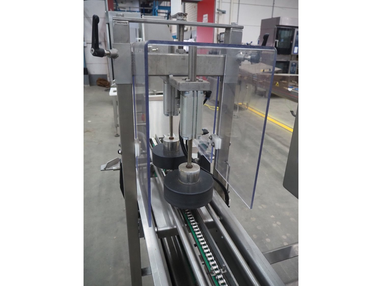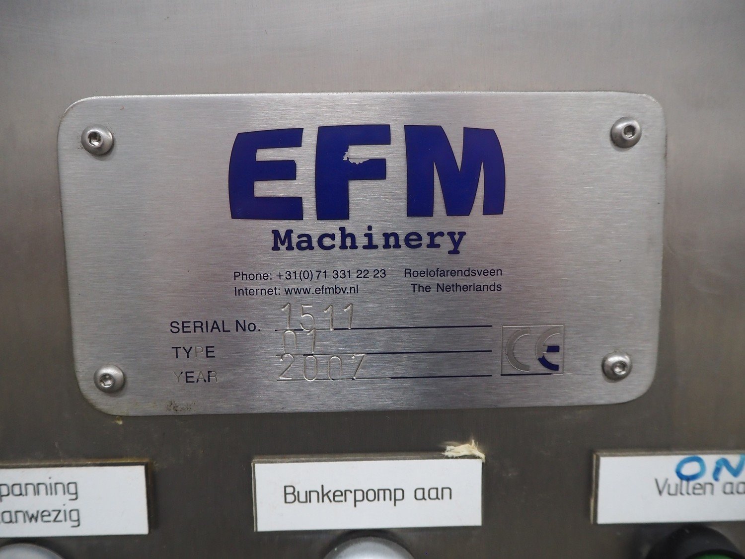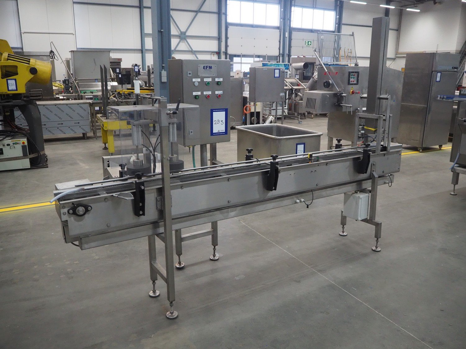 EFM machinery filling and lid closing machine, type: 01, serial number: 1511, year of construction: 2007, chain belt, belt width: 40 mm, lid diameter: 80 mm, total dimensions: 3100 mm x 750 mm x 2050 mm.