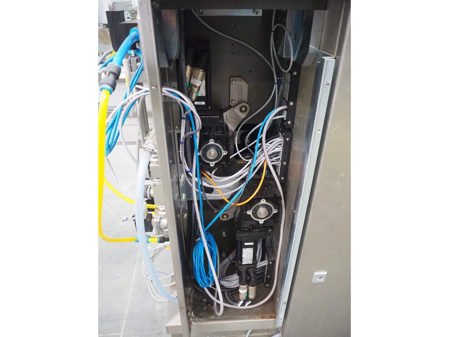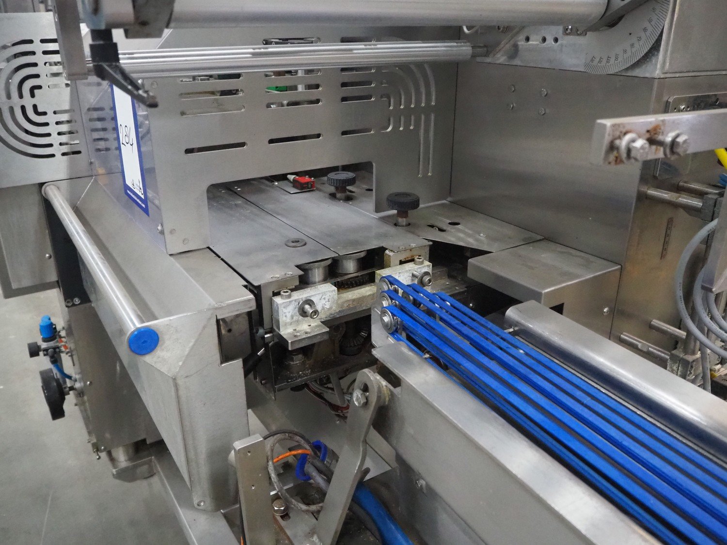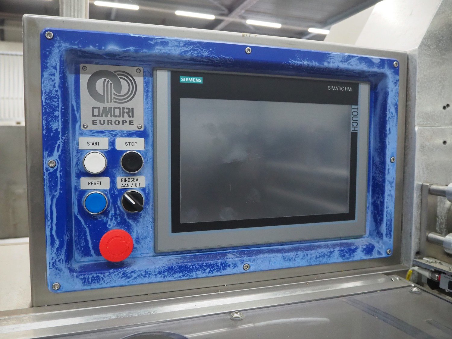 Omori Europe B.V. flowpacker, type: S-5015EU-BX, serial number: X18228, year of construction: 2020, 400 V, 3 Ph, 50 Hz, 10 kW, weight: 1500 kg, seal length: 250 mm, plastic outfeed belt, belt width: 180 mm, total dimensions: 3900 mm x 1100 mm x 1850 mm.