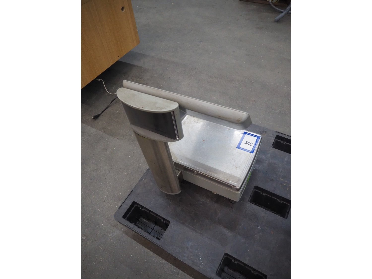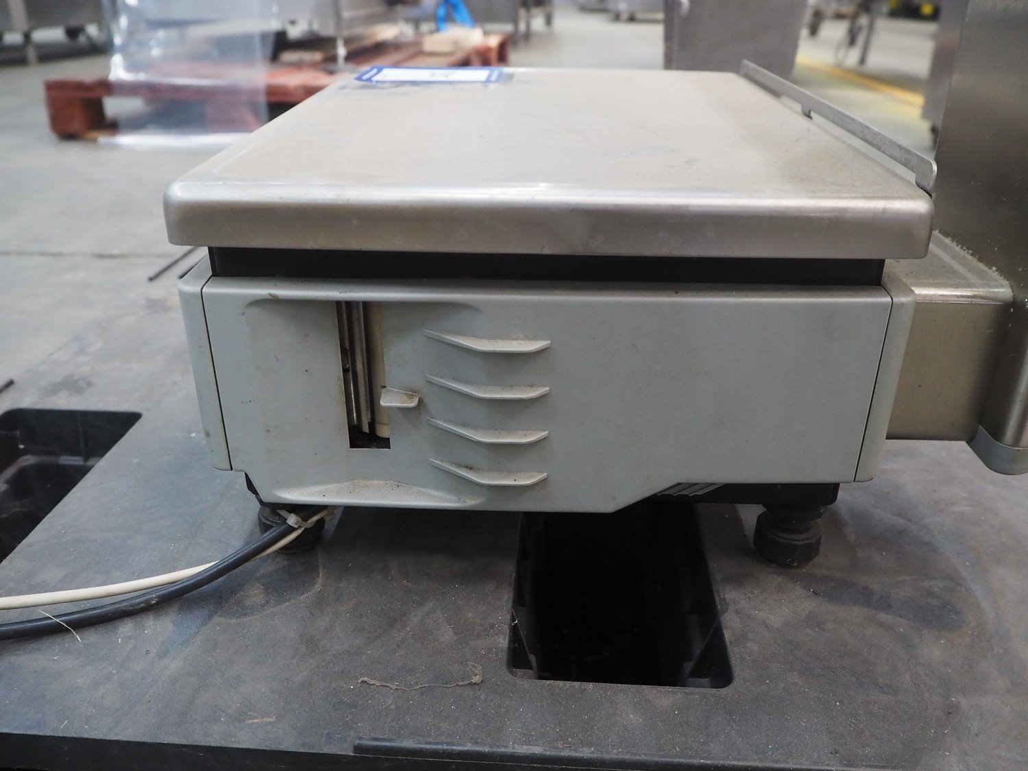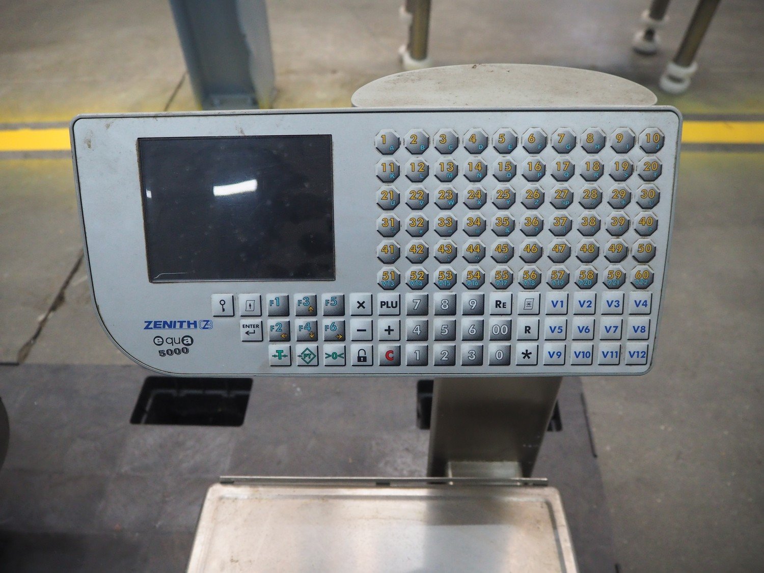 CZB weighing scale with label printer, model: EQUA 5000, serial number: 120950249, 110/230 V, 50/60 Hz, 24 W, maximum capacity: 12 kg, minimum capacity: 40 g, e= 2 g, T = -9.998 kg, dimensions: 500 mm x 360 mm x 480 mm.