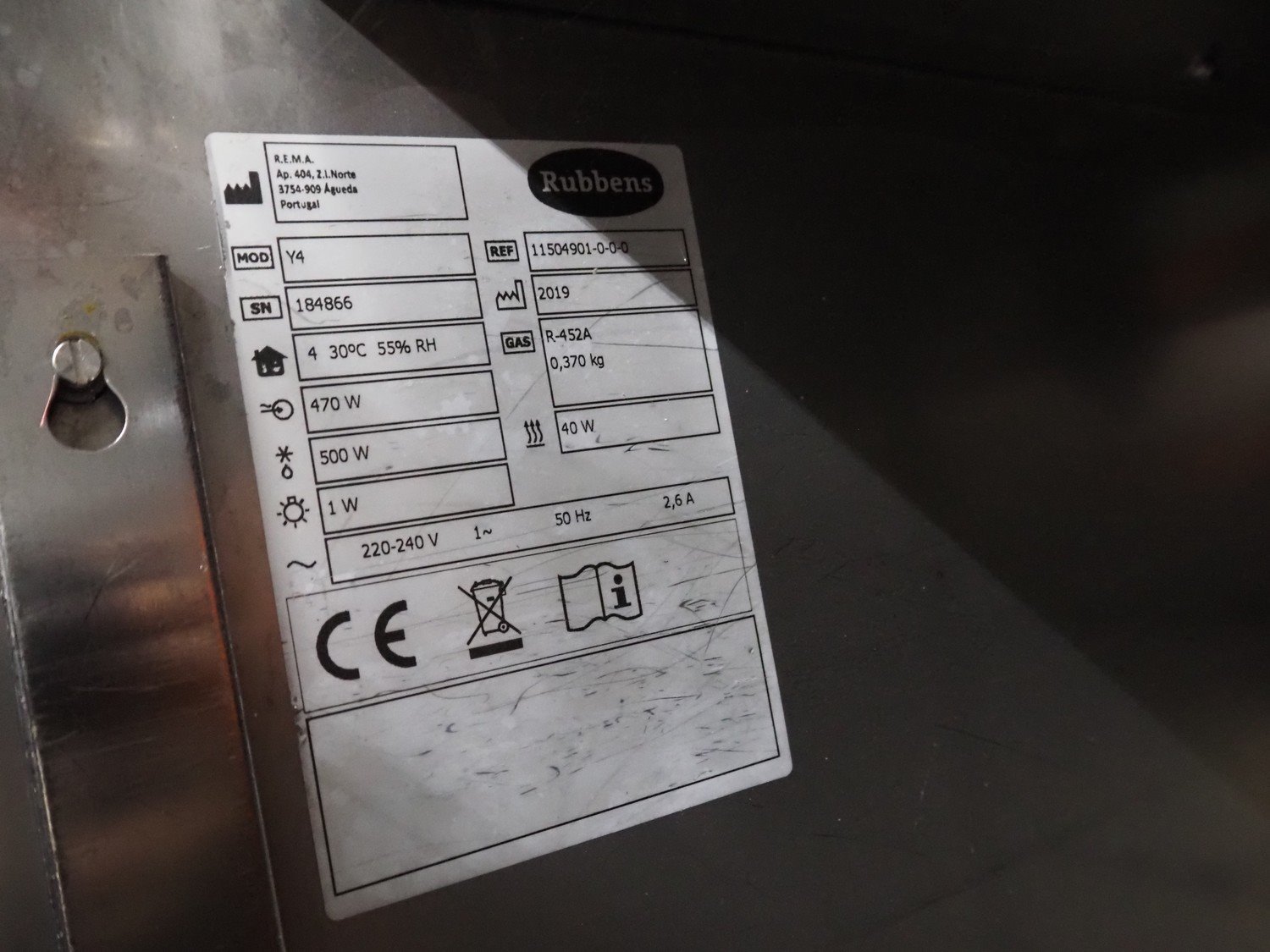Rubbens blast chiller, model: Y4, serial number: 184866, year of construction: 2019, 220-240 V, 1 Ph, 50 Hz, 2.6 A, refrigerant: R452A / 0.370 kg, dimensions: 720 mm x 510 mm x 2080 mm. Damaged.