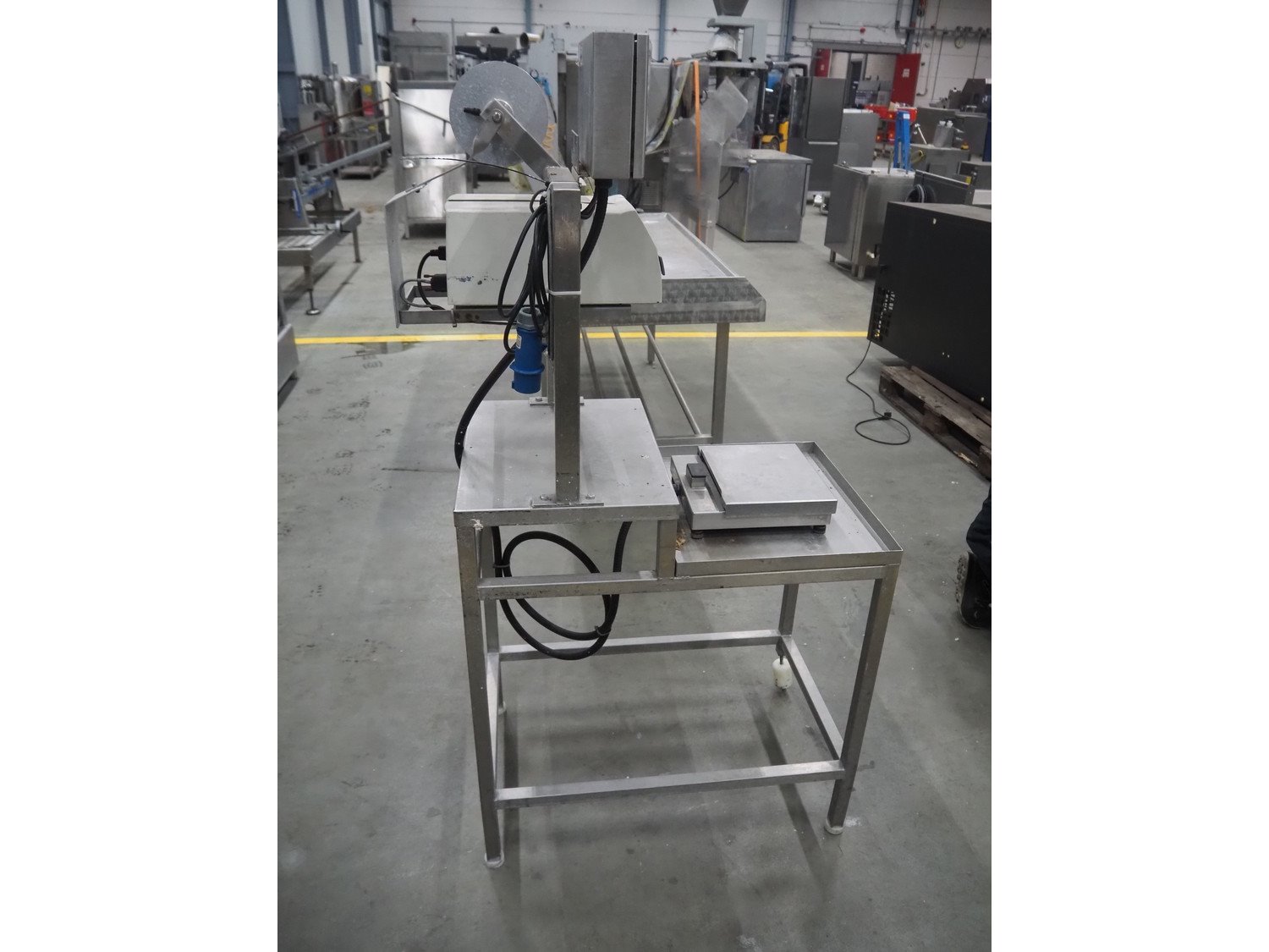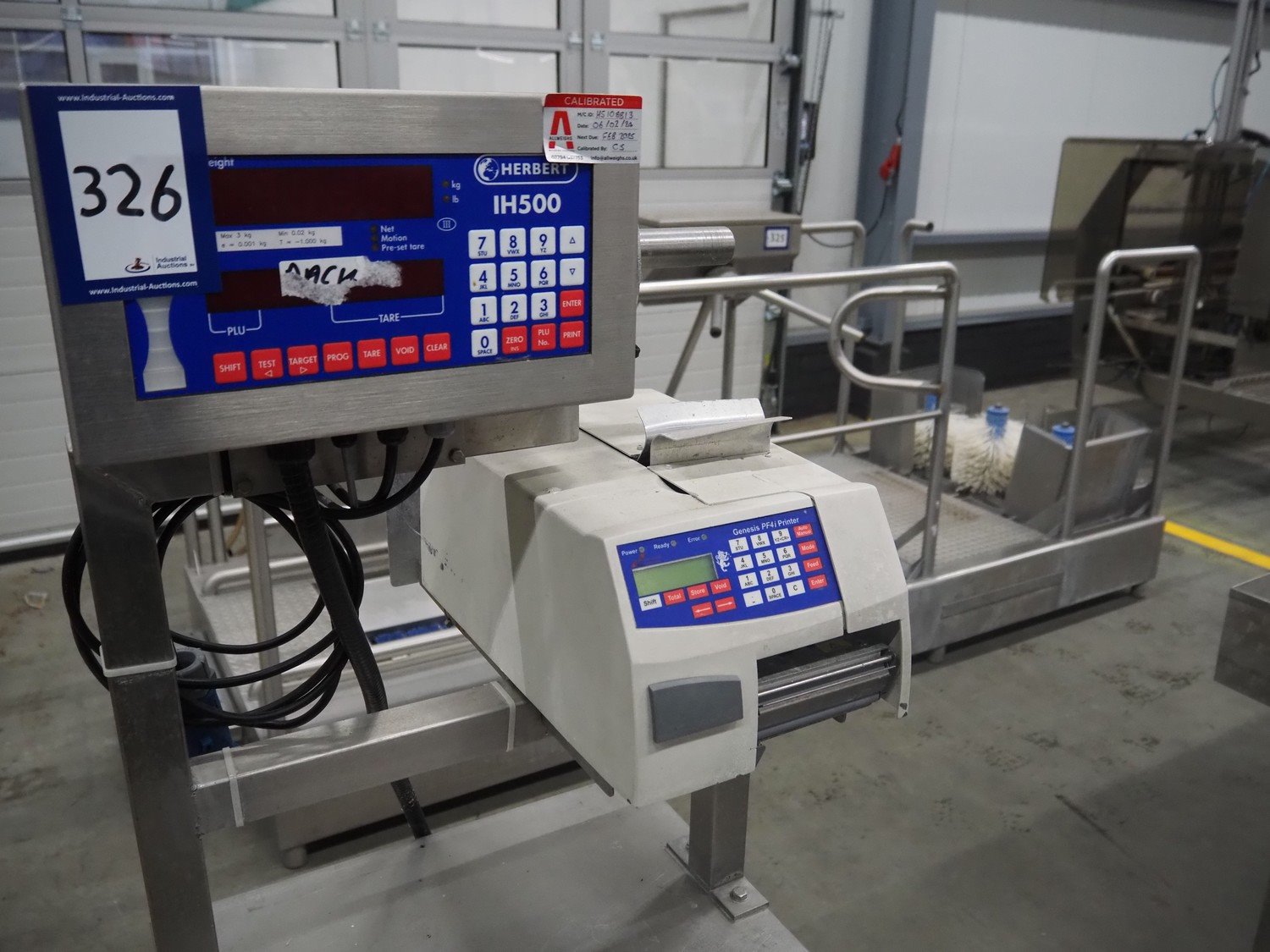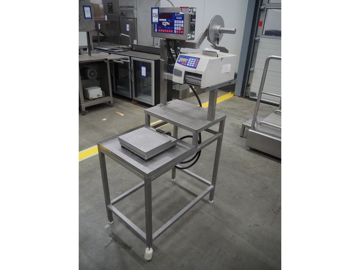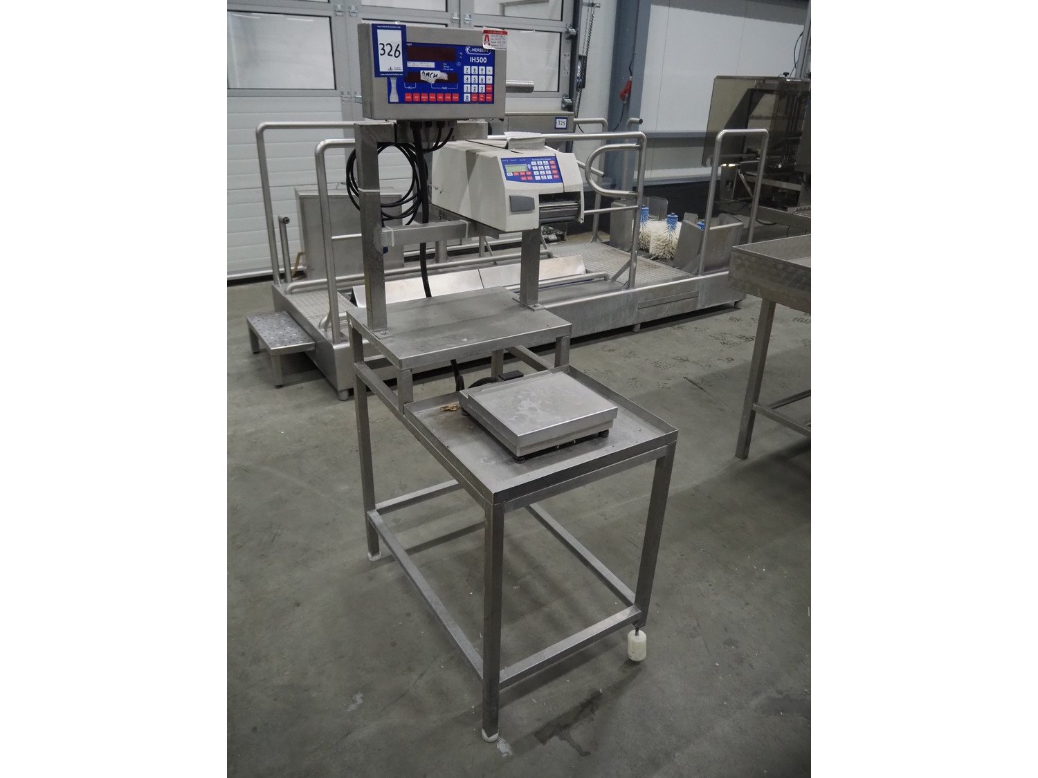 Herbert weighing machine with labeller, type: IH500, maximum: 3 kg, minimum weight: 0.02 kg, e= 0.001 kg, T = -1.000 kg, dimensions: 900 mm x 550 mm x 1600 mm.
