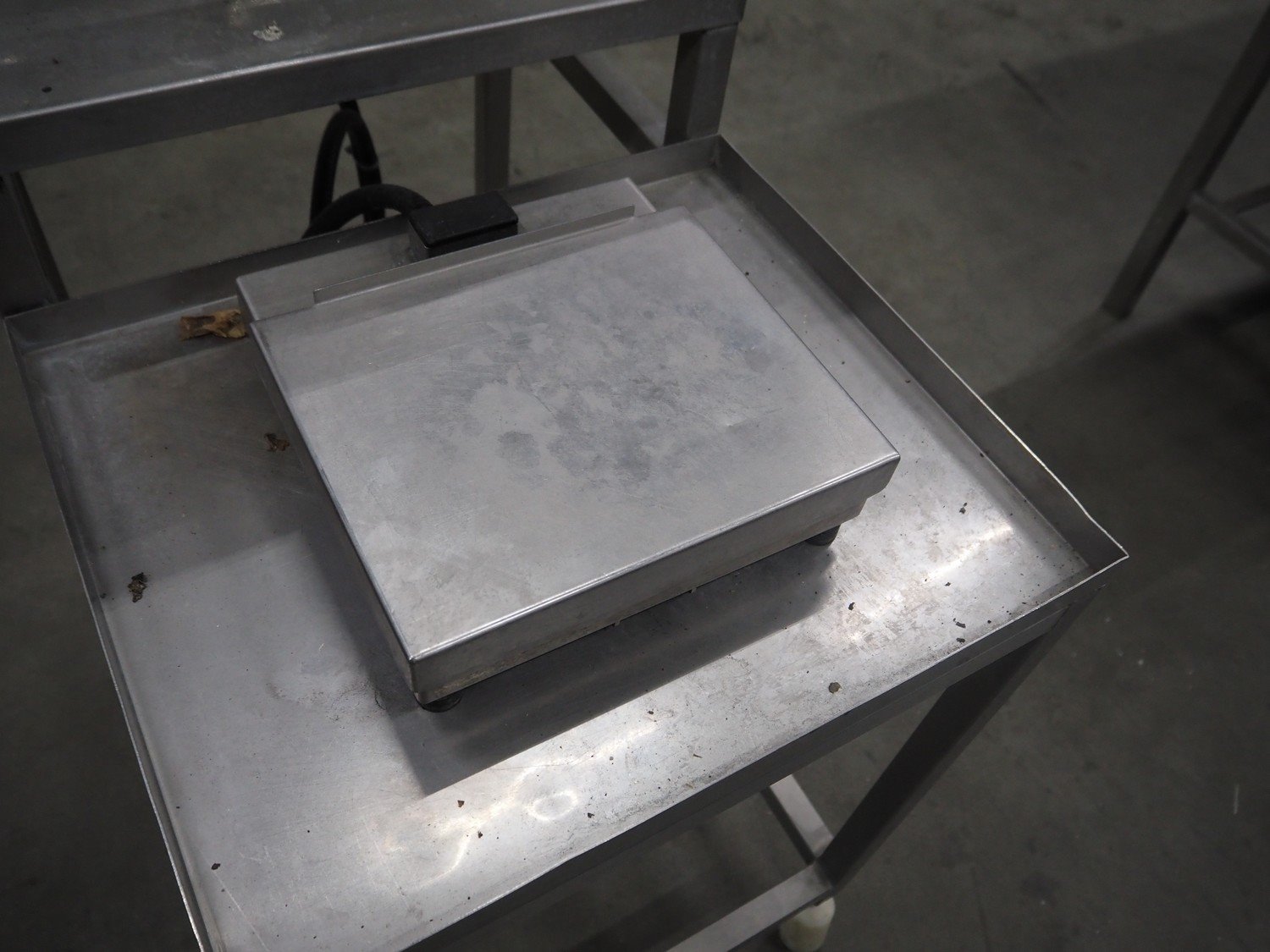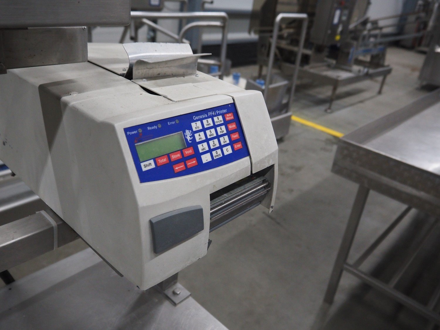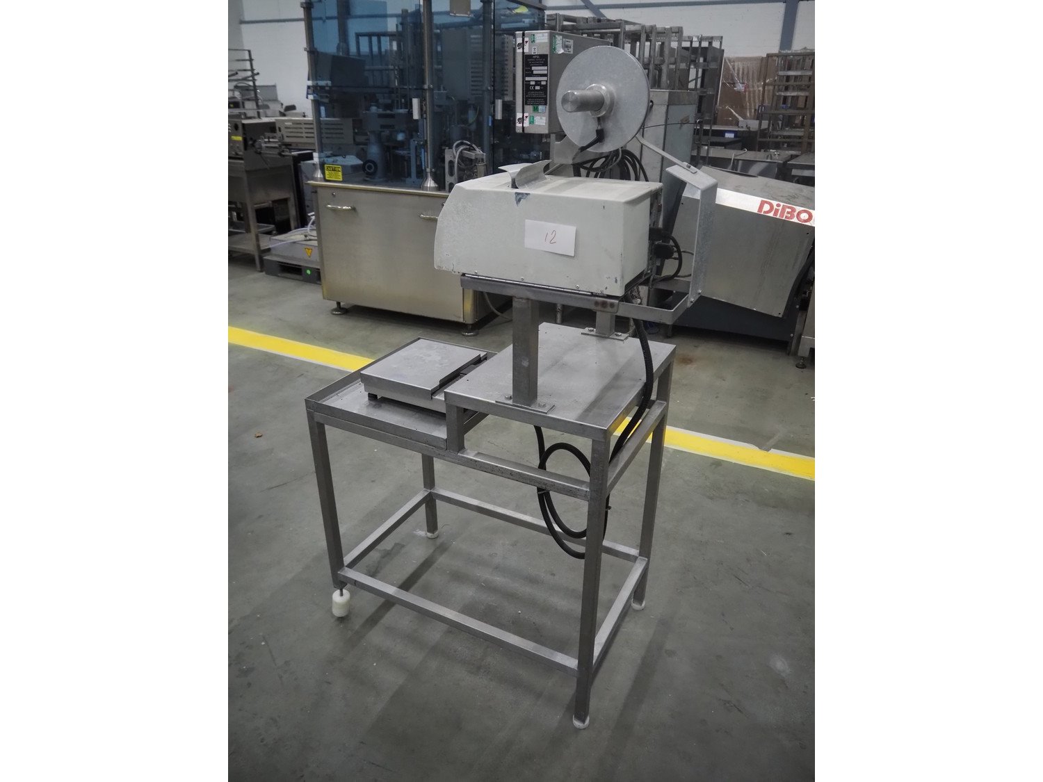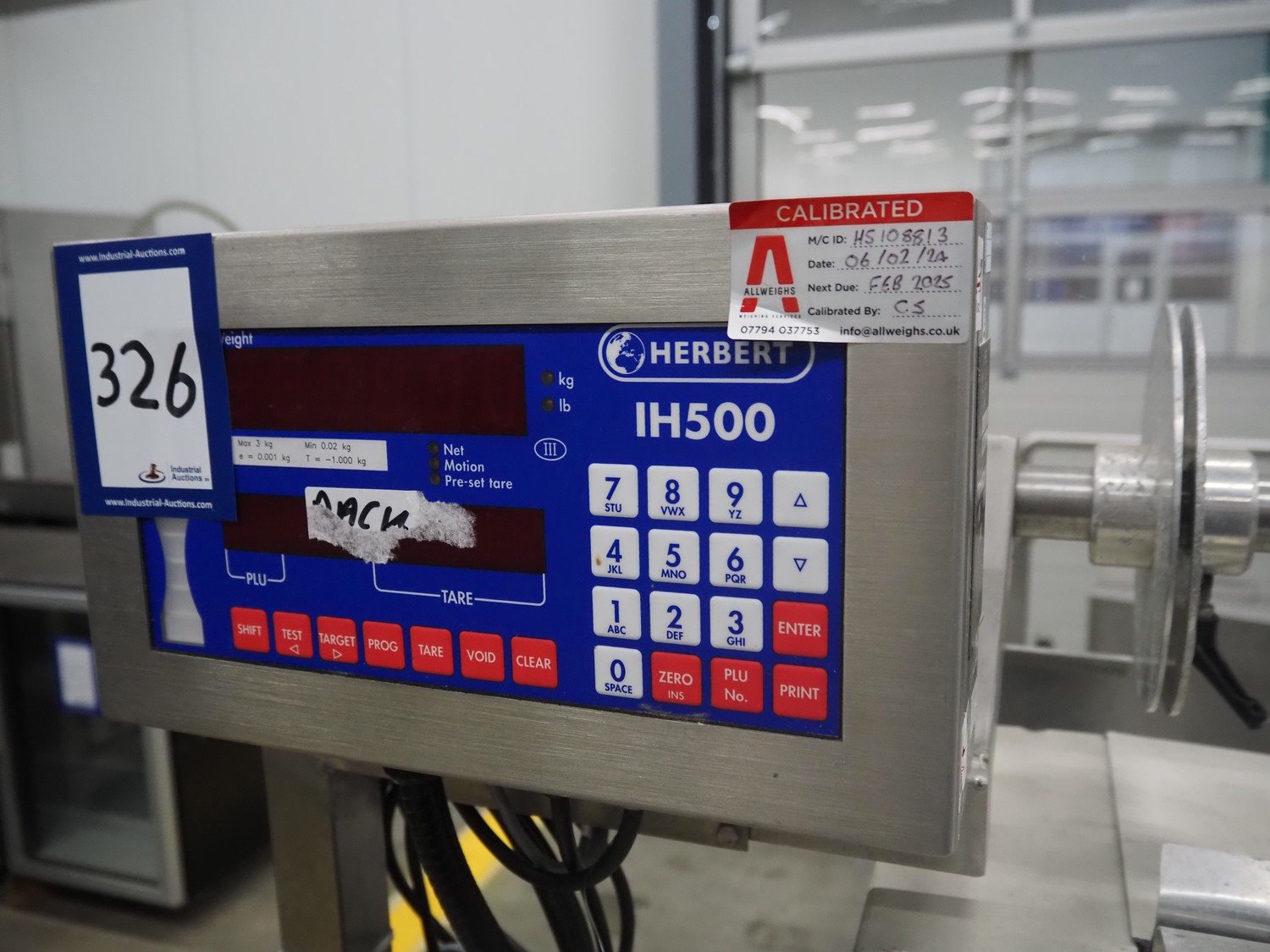 Herbert weighing machine with labeller, type: IH500, maximum: 3 kg, minimum weight: 0.02 kg, e= 0.001 kg, T = -1.000 kg, dimensions: 900 mm x 550 mm x 1600 mm.