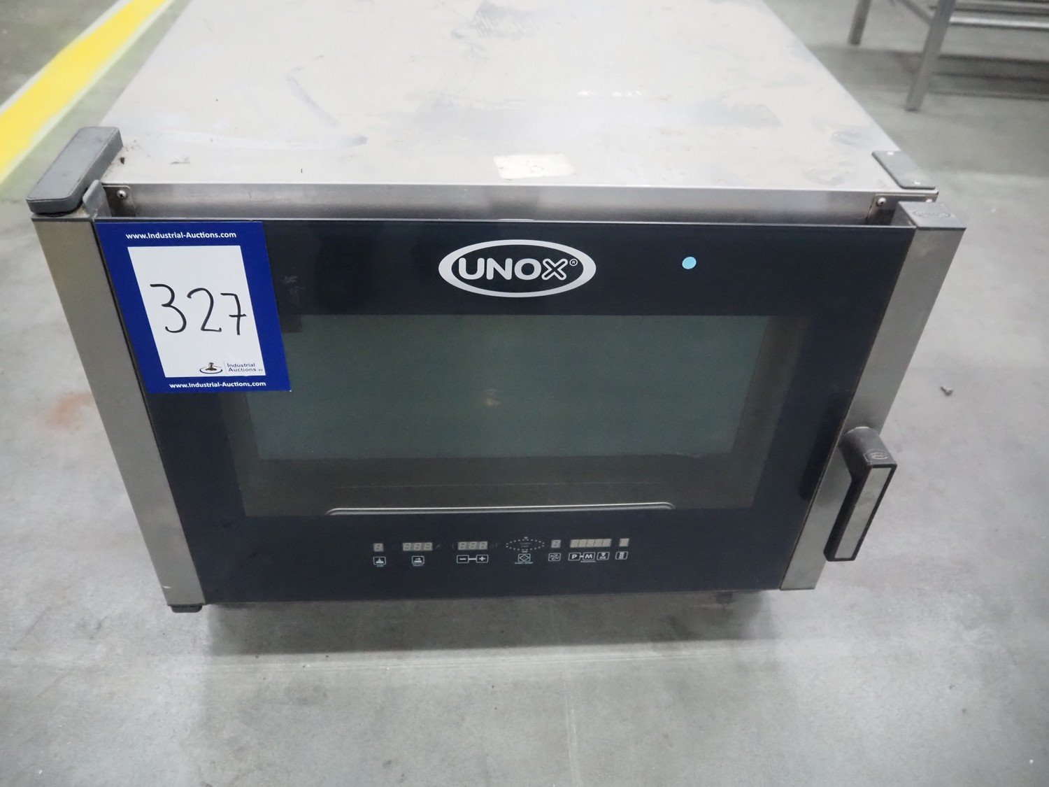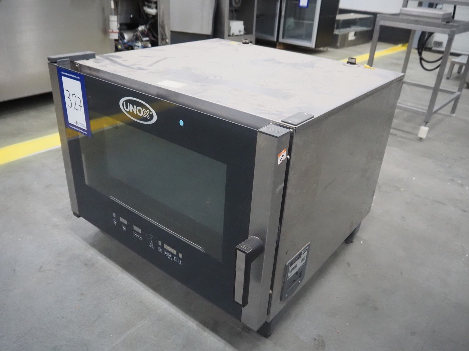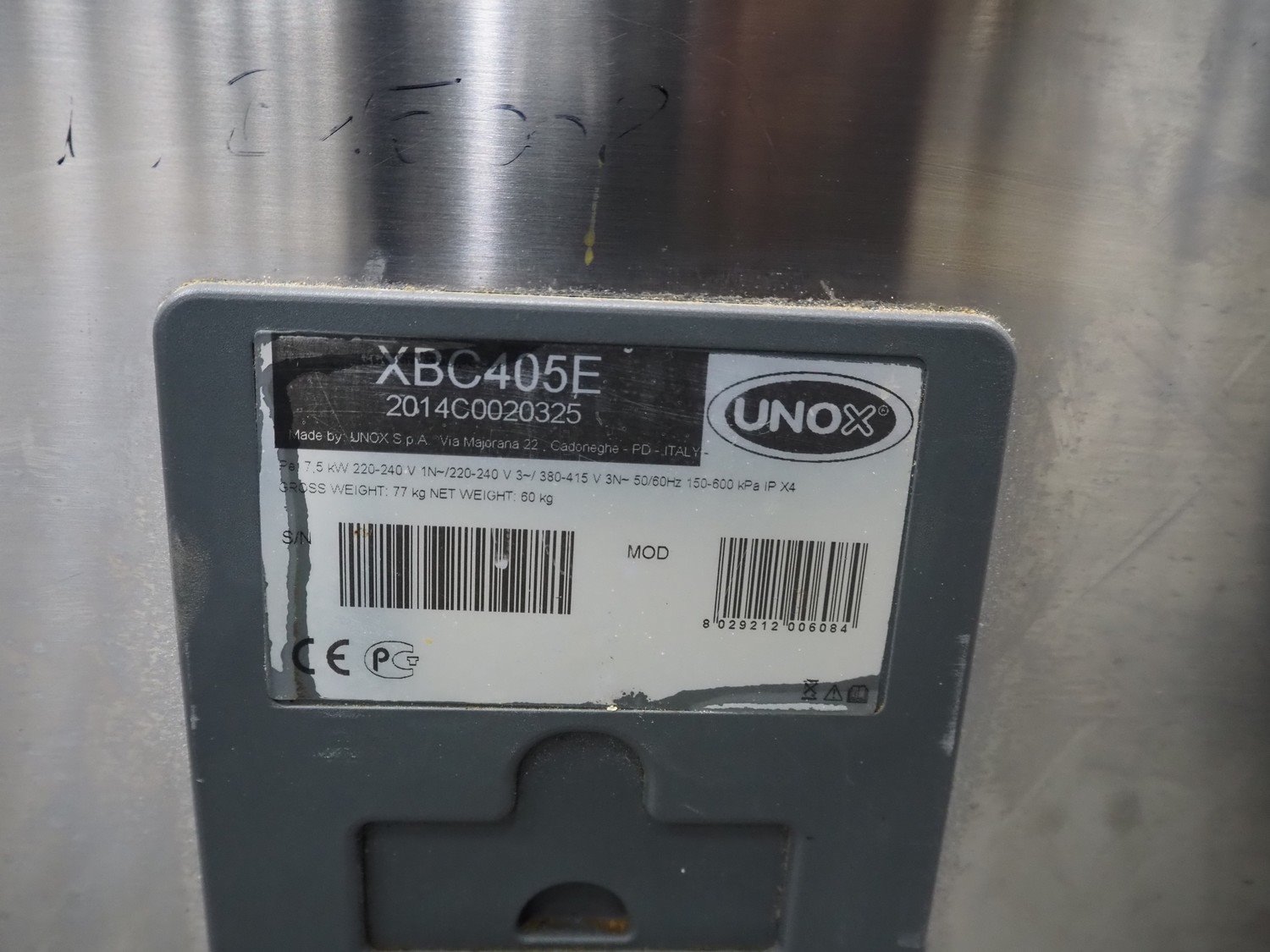 Unox combisteamer, type: XBC405E, serial number: 2014C0020325, 220-240/380-415 V, 1/3 Ph, 50/60 Hz, 7.5 kW, gross weight: 77 kg, net weight: 60 kg, 4 floors, dimensions each floor: 360 mm x 600 mm, total dimensions: 860 mm x 560 mm x 700 mm.