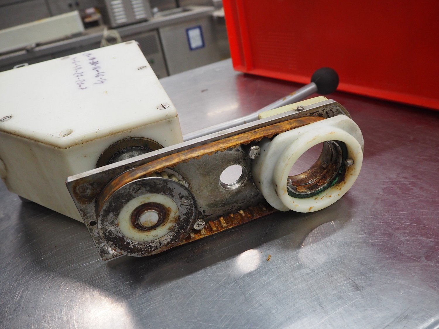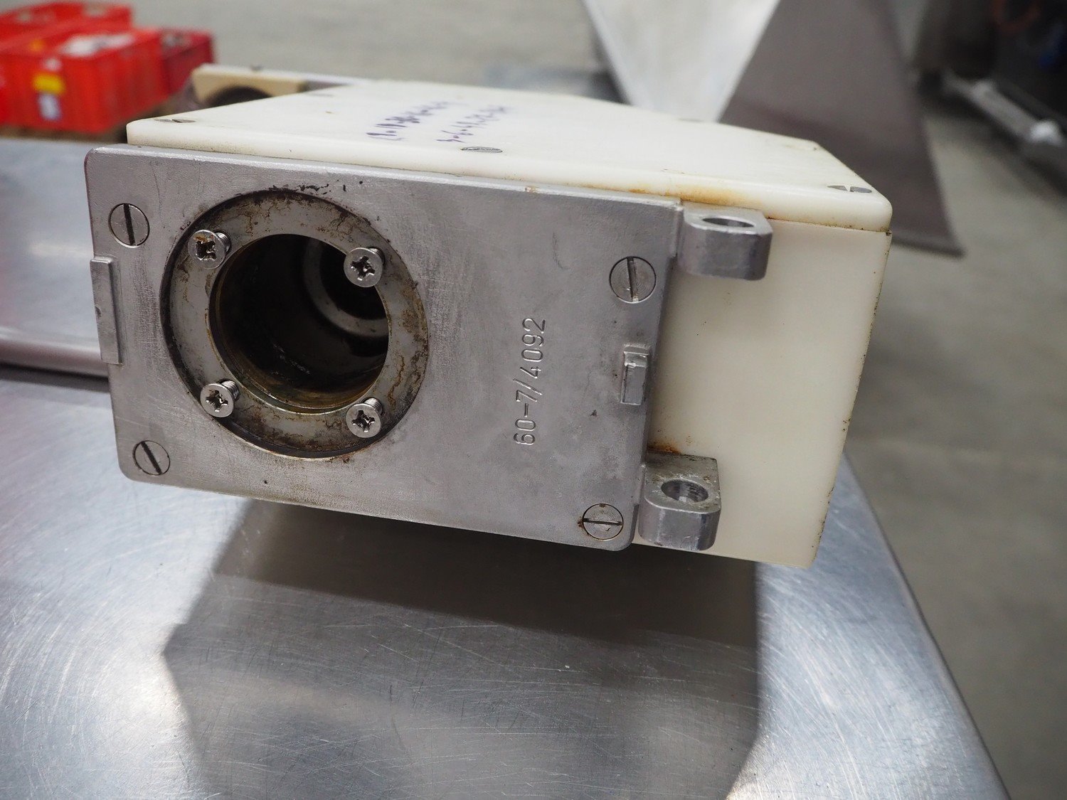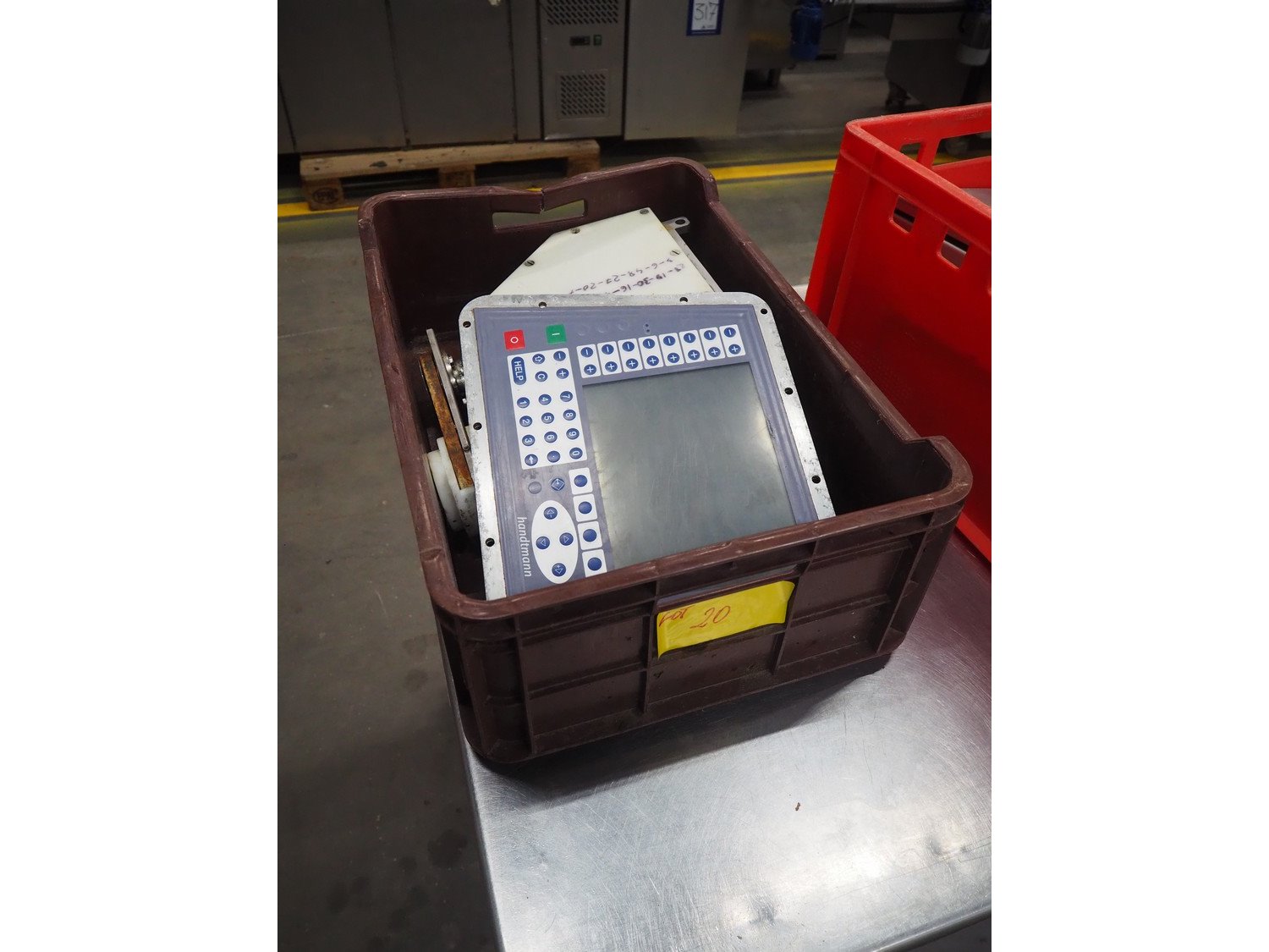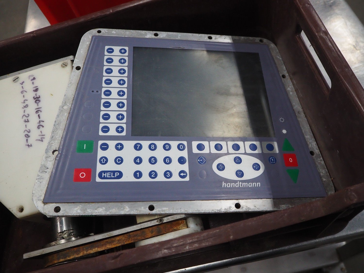 Plastic crate with Handtmann screen and case holding device, type: 60-7, number: 4092, dimensions: 600 mm x 400 mm x 200 mm.