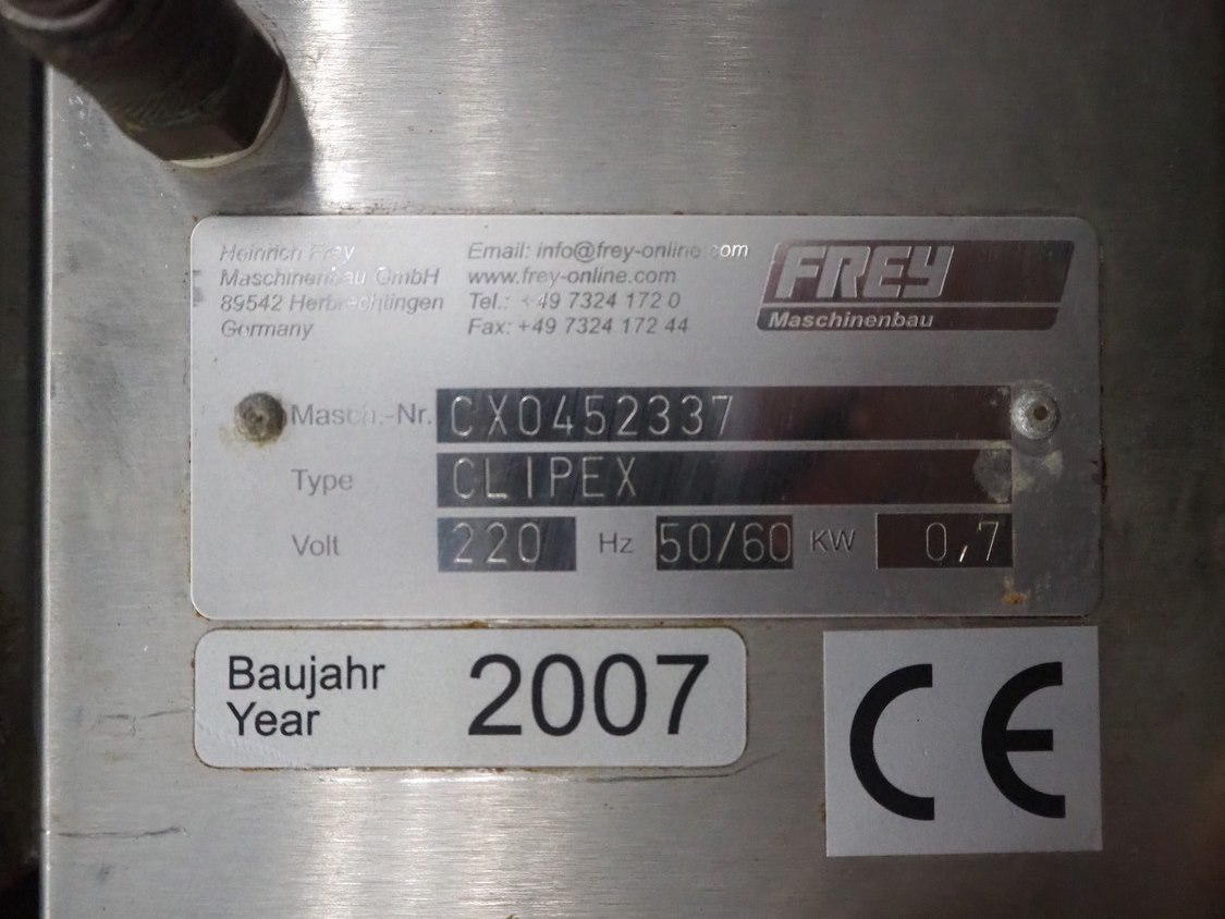 Frey Maschinenbau casing sealer, type: CLIPEX, machine number: CX 0452337, year of construction: 2007, 220 V, 50/60 Hz, 0.7 kW, dimensions: 370 mm x 300 mm x 150 mm
