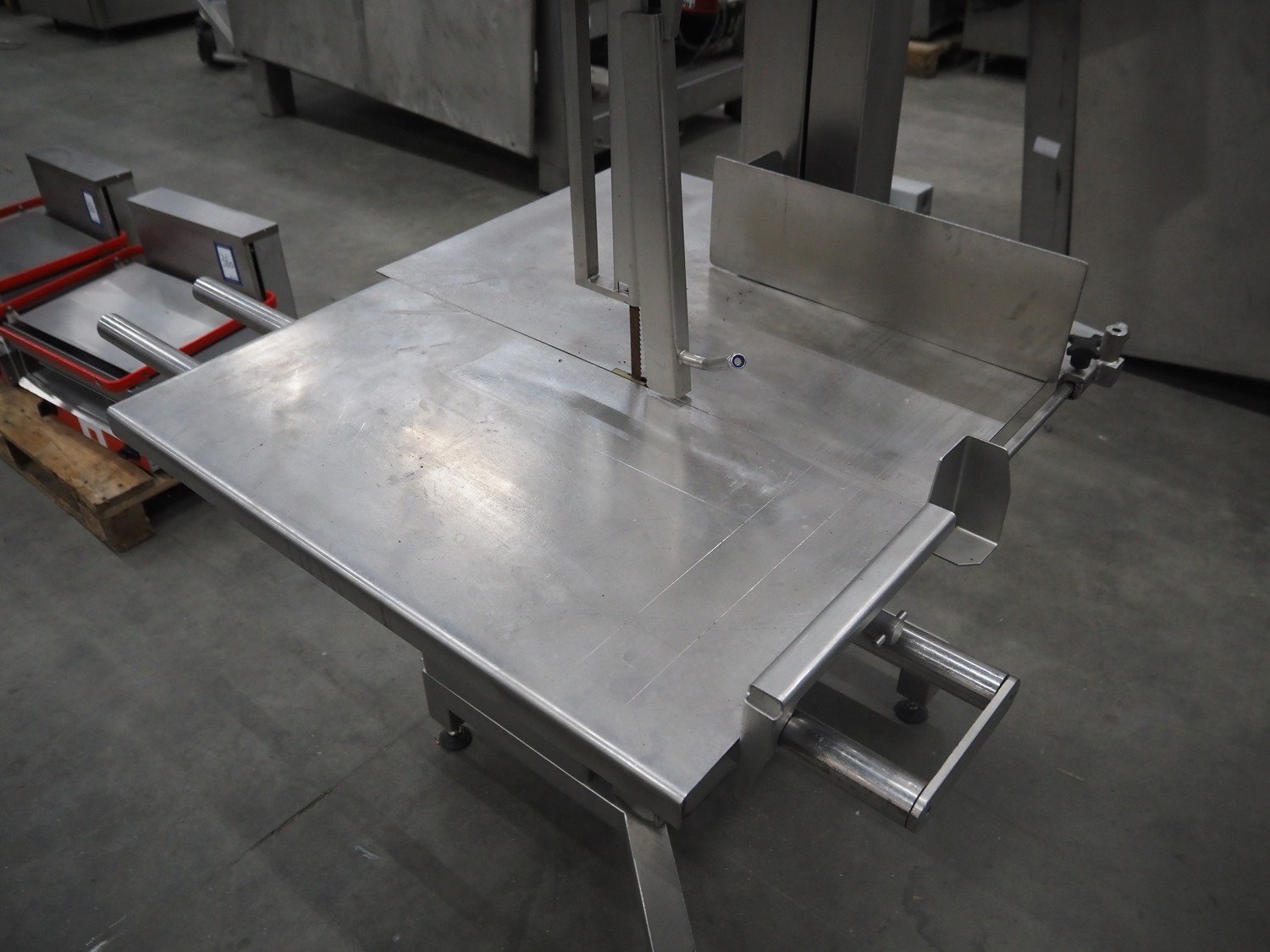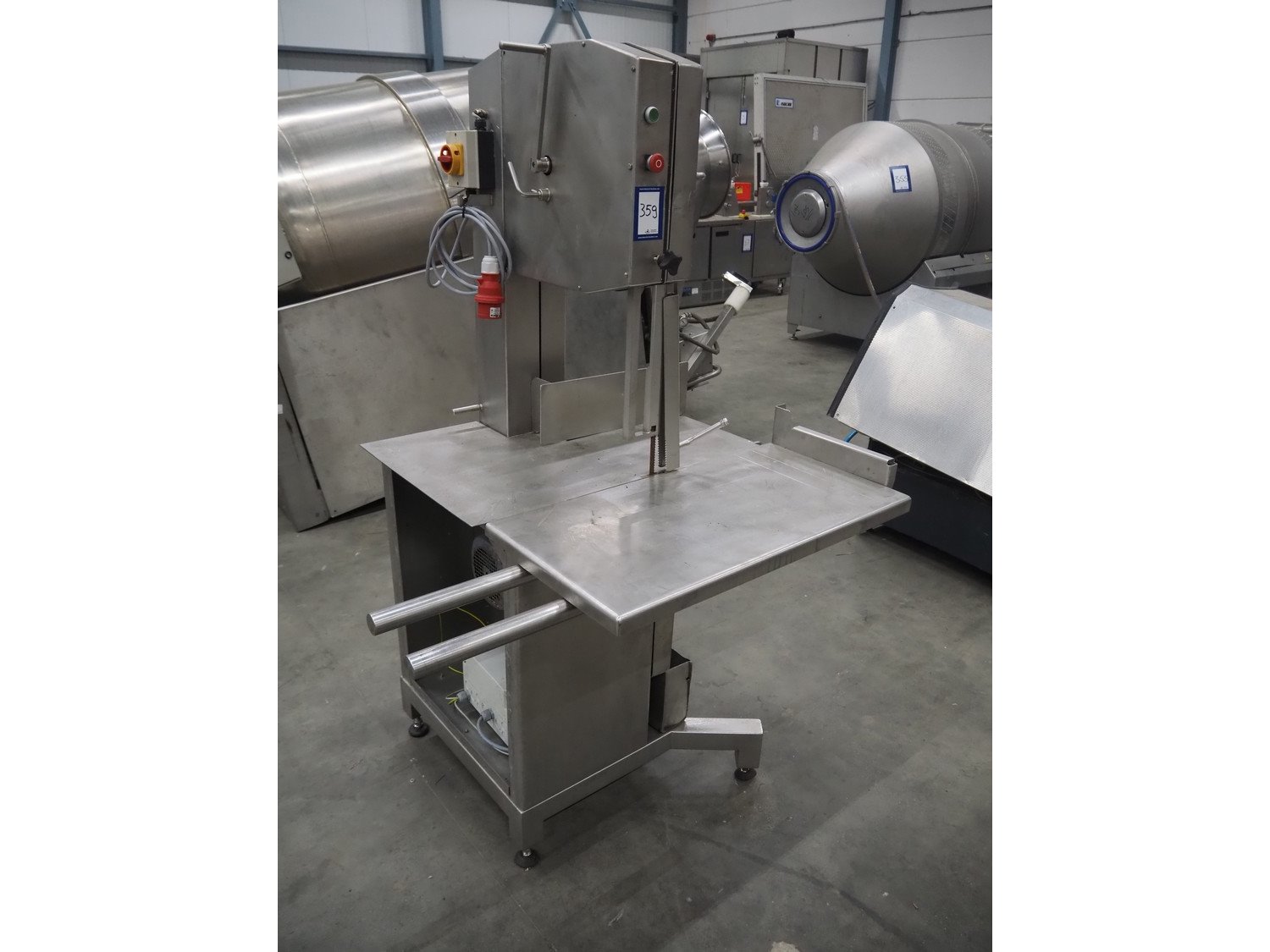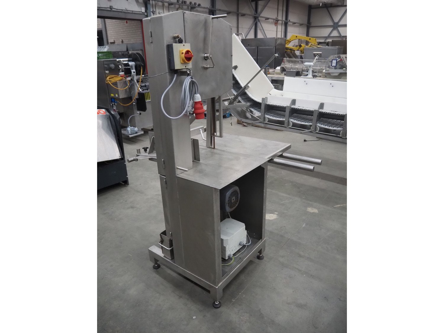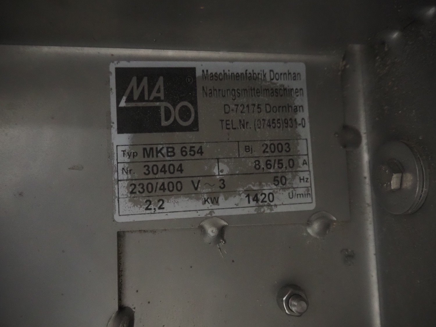 Mado bandsaw, type: MKB 654, serial number: 30404, year of construction: 2003, 230/400 V, 3 Ph, 50 Hz, 8.6/5.0 A, table dimensions: 850 mm x 720 mm, total dimensions: 1300 mm x 1000 mm x 1800 mm. Missing cover.