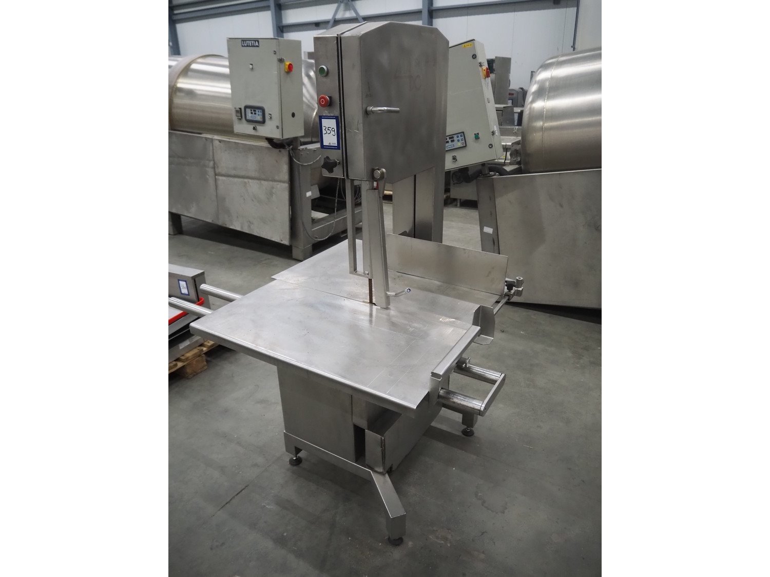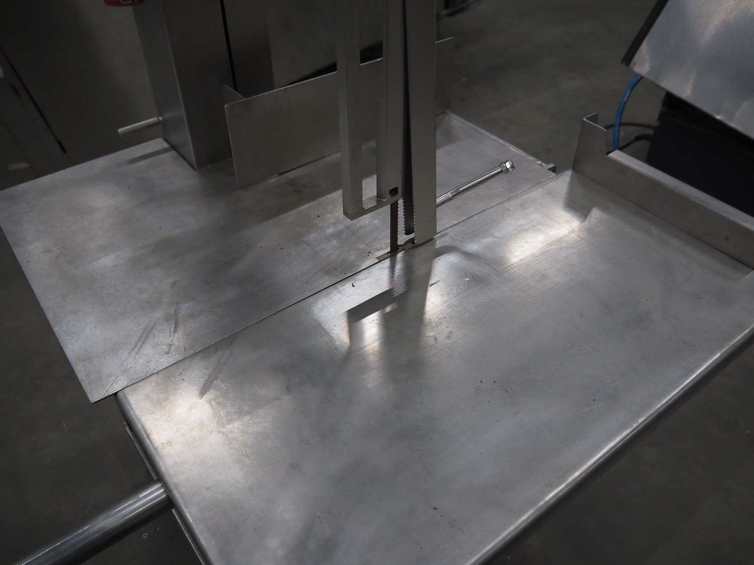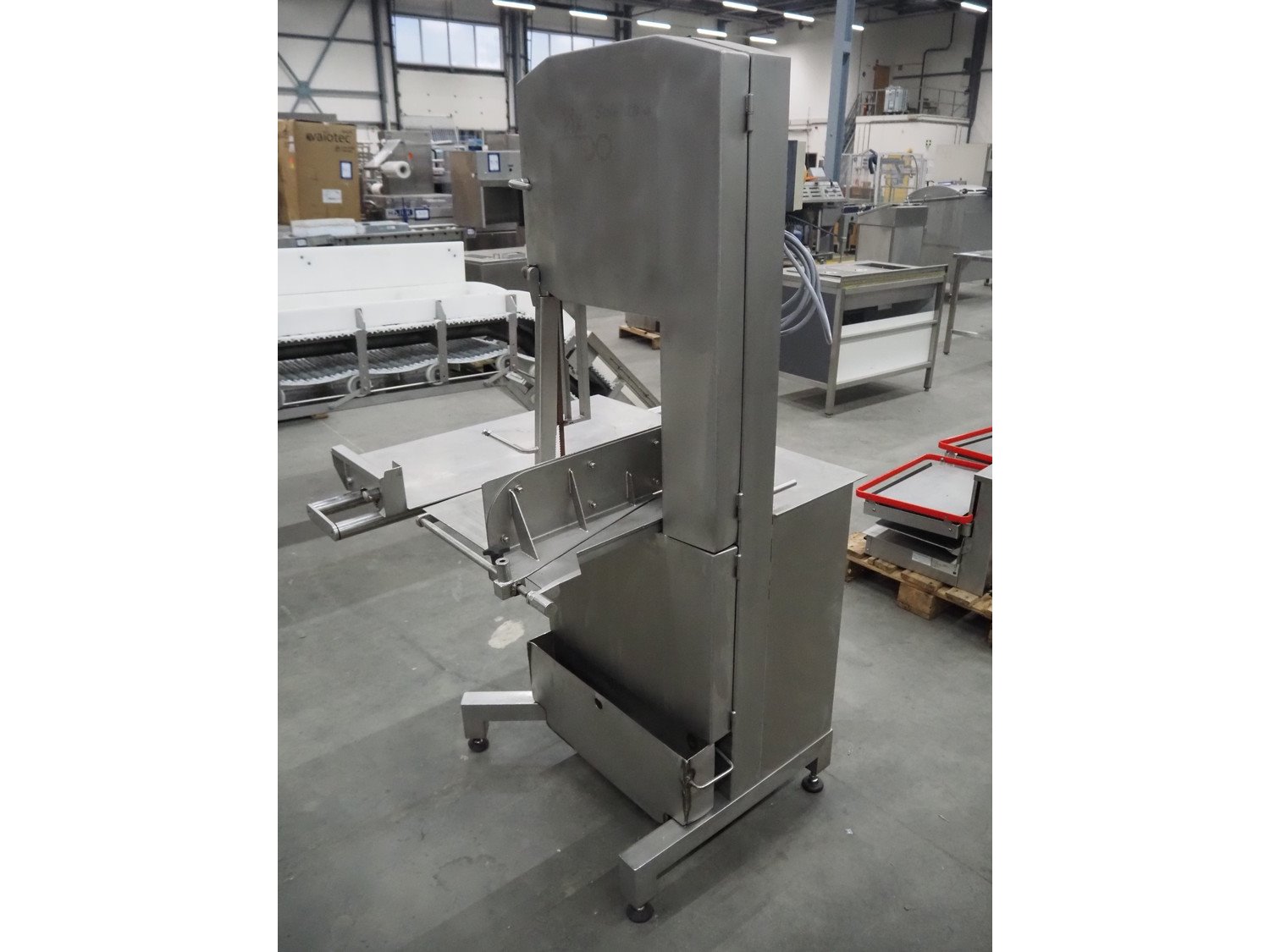 Mado bandsaw, type: MKB 654, serial number: 30404, year of construction: 2003, 230/400 V, 3 Ph, 50 Hz, 8.6/5.0 A, table dimensions: 850 mm x 720 mm, total dimensions: 1300 mm x 1000 mm x 1800 mm. Missing cover.