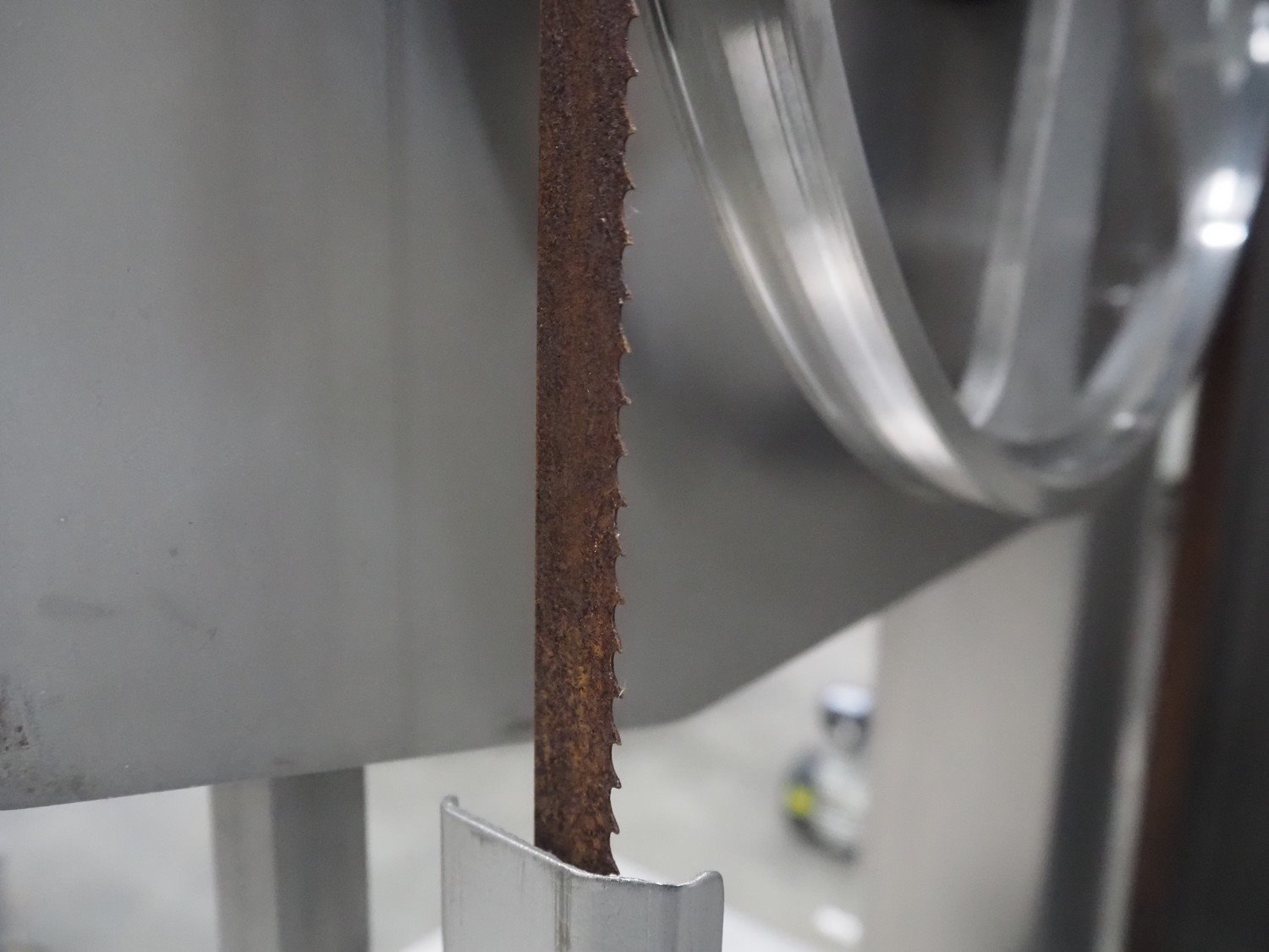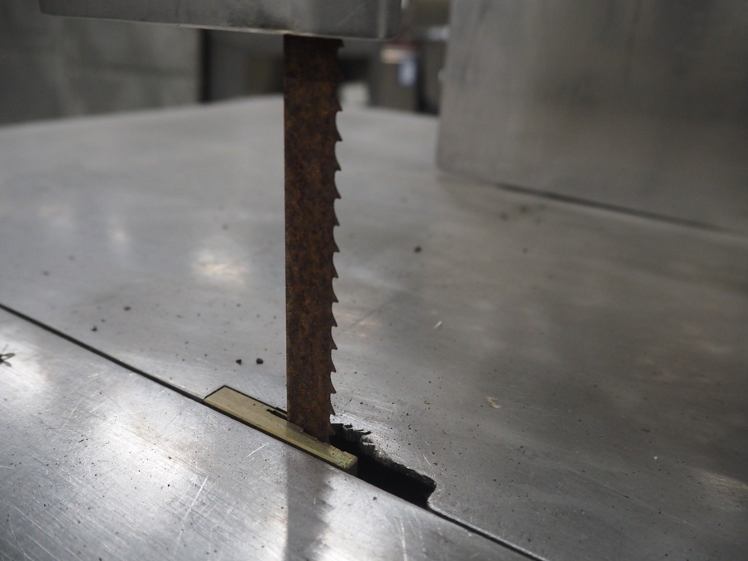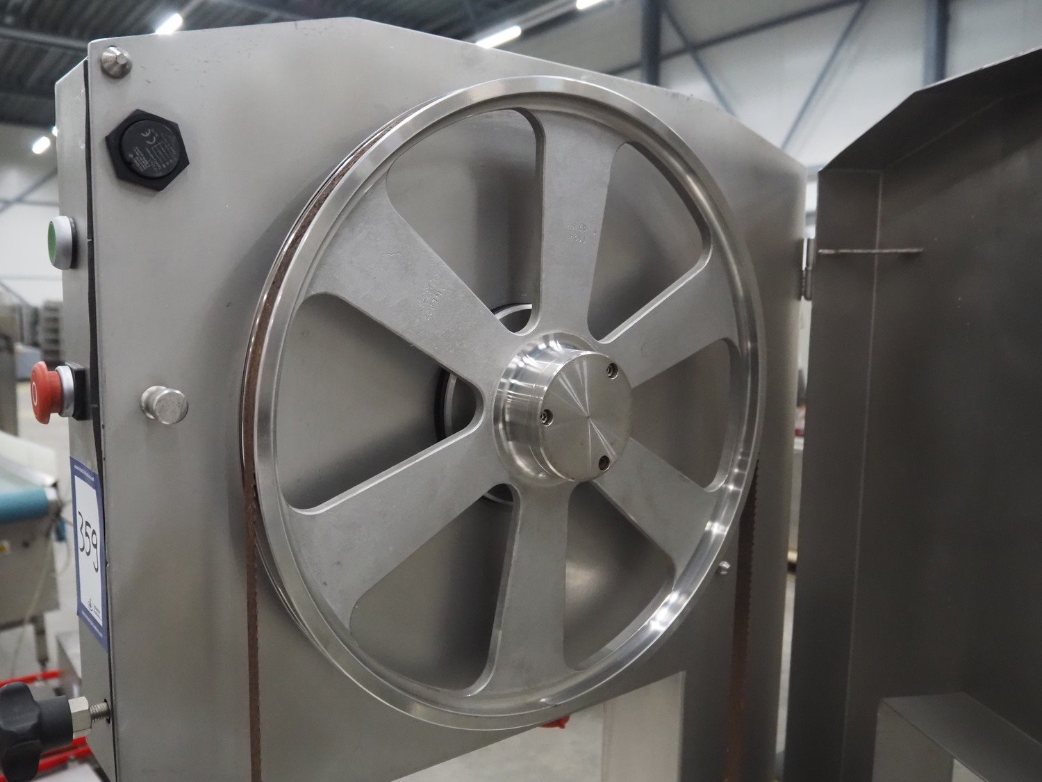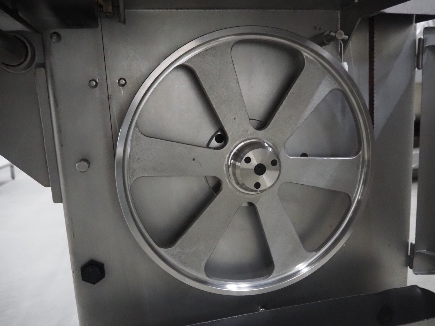 Mado bandsaw, type: MKB 654, serial number: 30404, year of construction: 2003, 230/400 V, 3 Ph, 50 Hz, 8.6/5.0 A, table dimensions: 850 mm x 720 mm, total dimensions: 1300 mm x 1000 mm x 1800 mm. Missing cover.