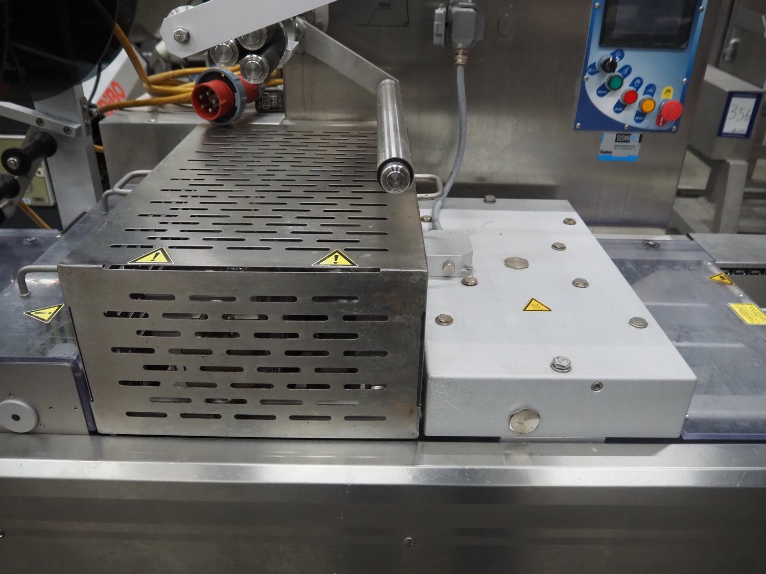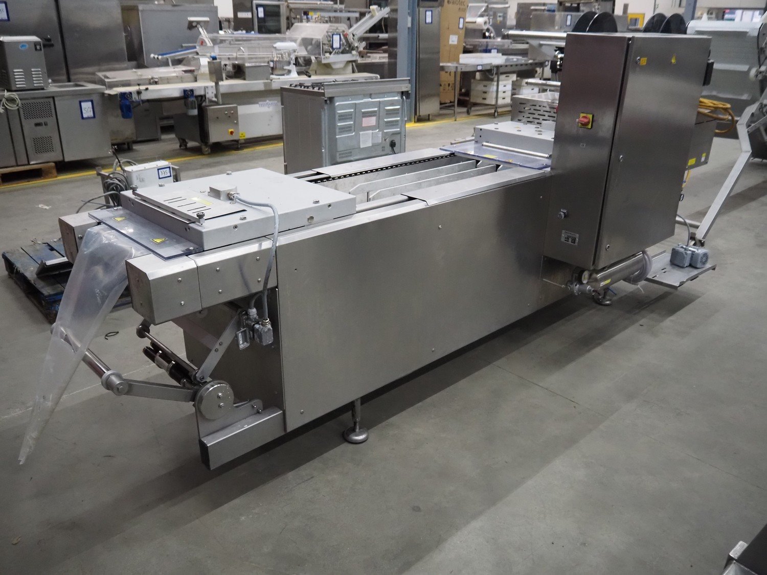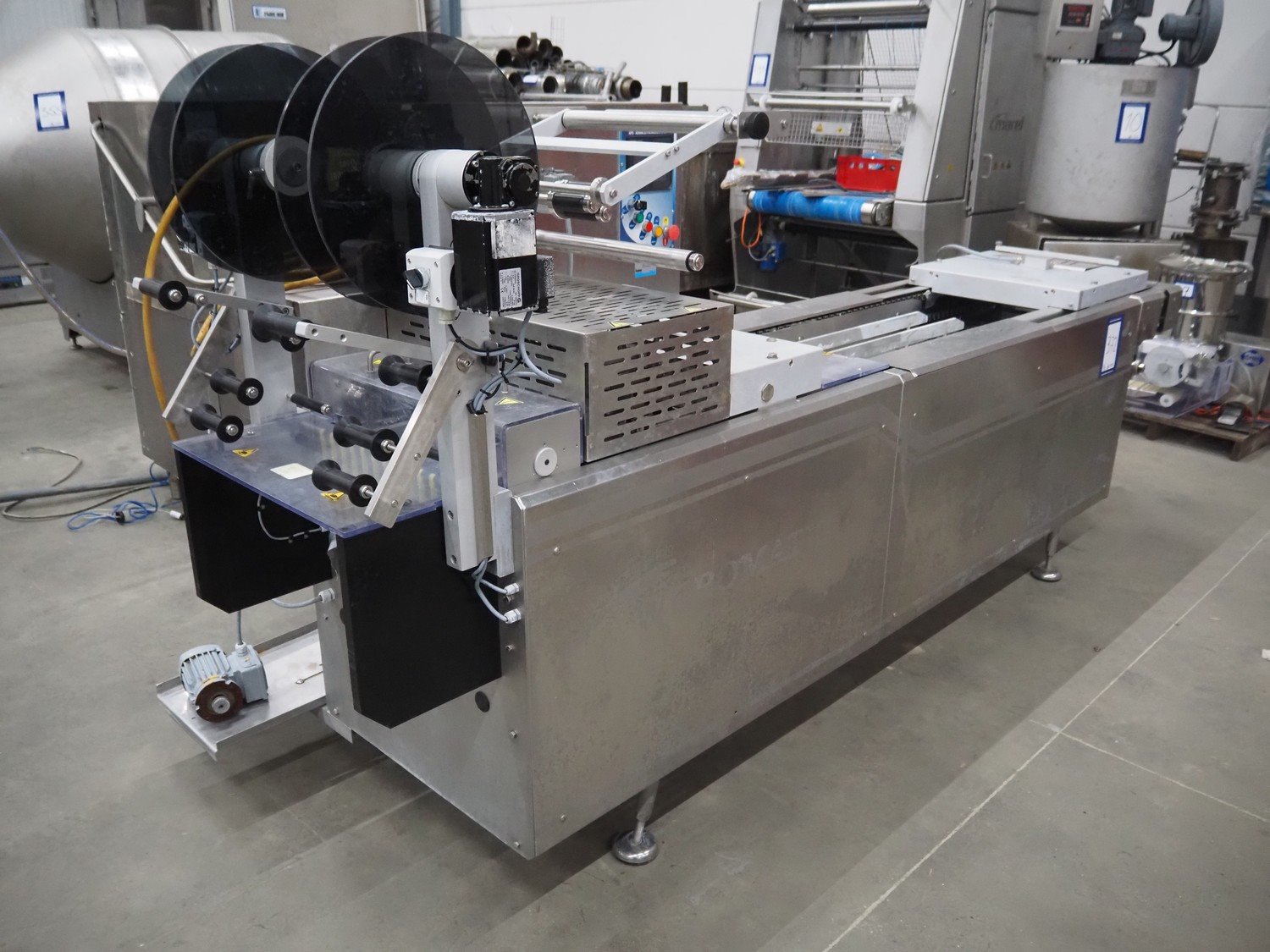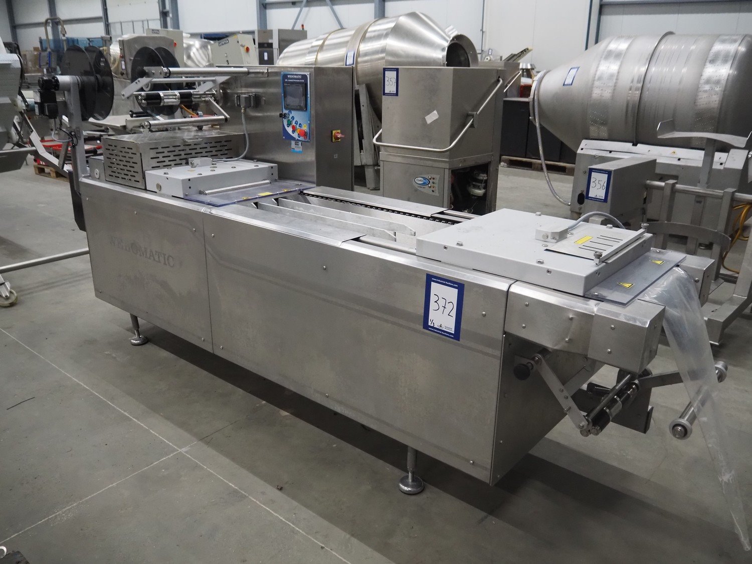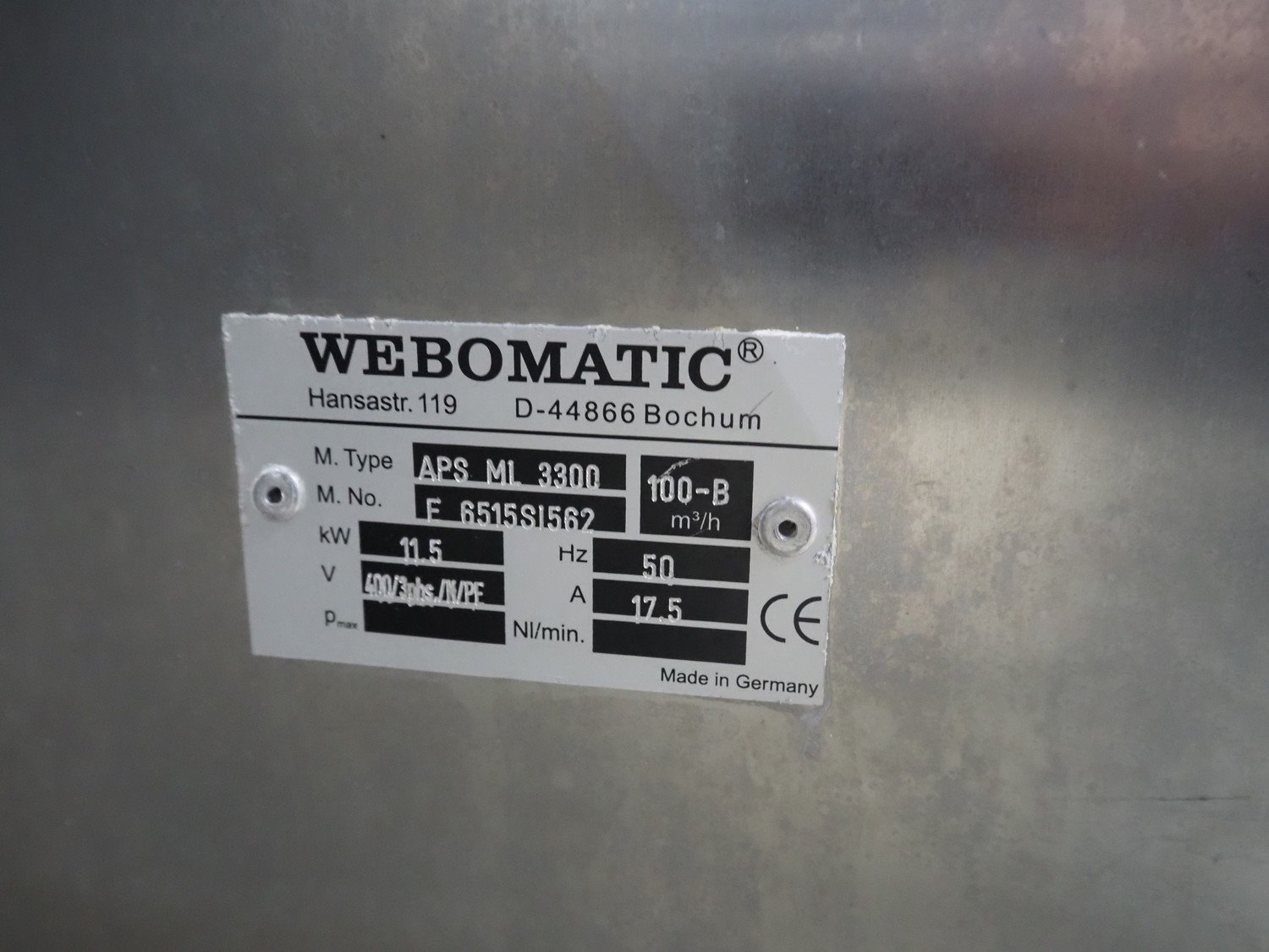 Webomatic thermoformer, type: APS ML 3300, machine number: F 6515SI562, 400 V, 3 Ph, 50 Hz, 17.5 A, 11.5 kW, film width: 410 mm, dimensions dye: (6x) 120 mm x 110 mm, plastic outfeed belt, belt width: 355 mm, 2 Busch vacuum pumps, type: RA 0100 F 503 / RA 0021 B 3Z3 APXX, capacity: 100 m³ per hour / 21 m³ per hour, total dimensions: 3500 mm x 1200 mm x 1620 mm. Including 3 crates with parts.