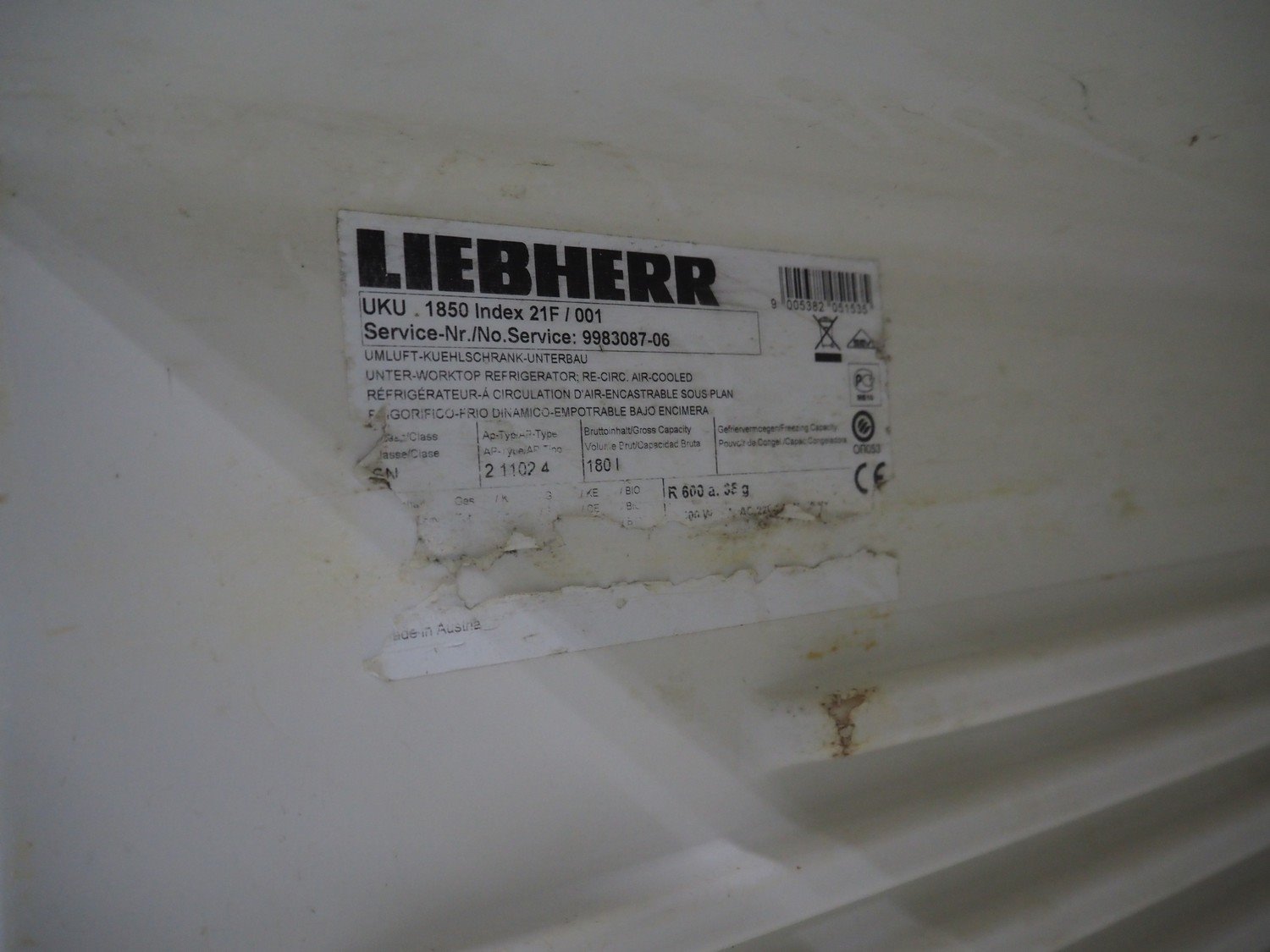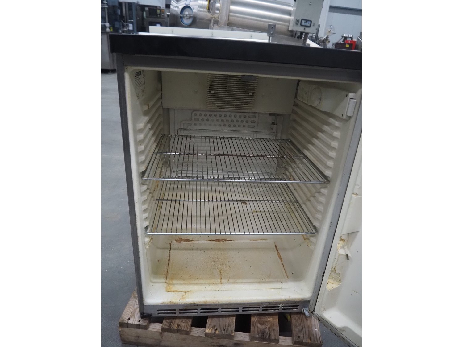 Liebherr refrigerator, model: 1850 Index 21F/001, serial number: 9983087-06, refrigerant: R600a/35 g, capacity: 180 liter, 2 floors, dimensions each floor: 530 mm x 400 mm, total dimensions: 600 mm x 650 mm x 850 mm.