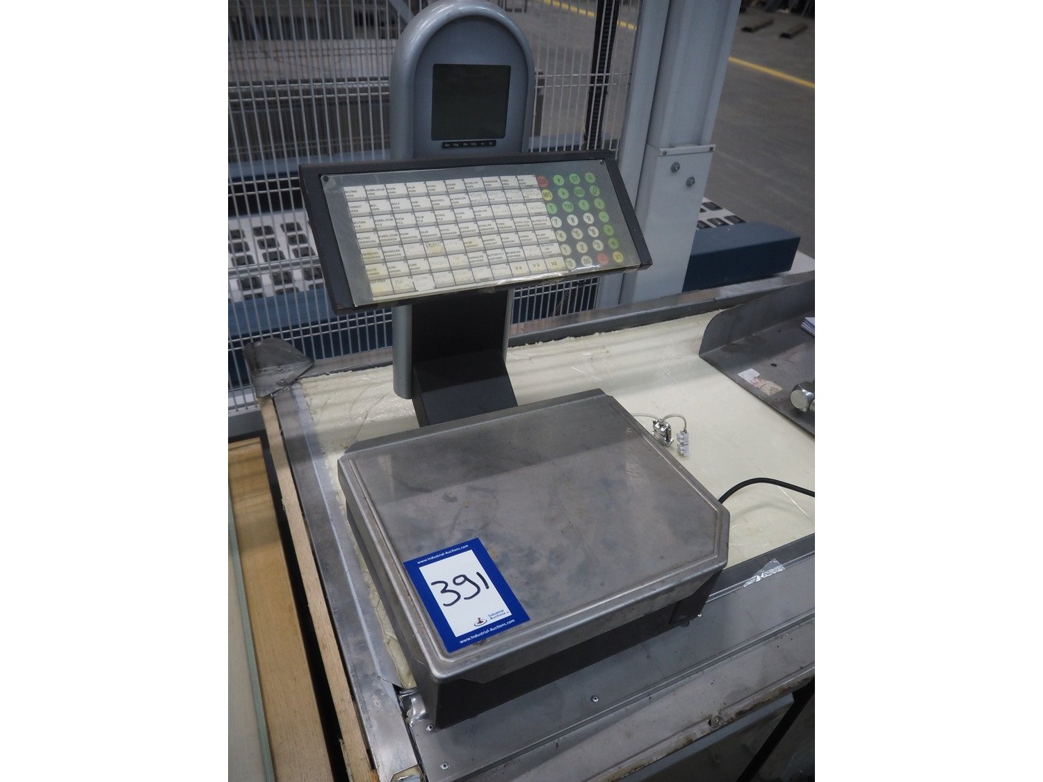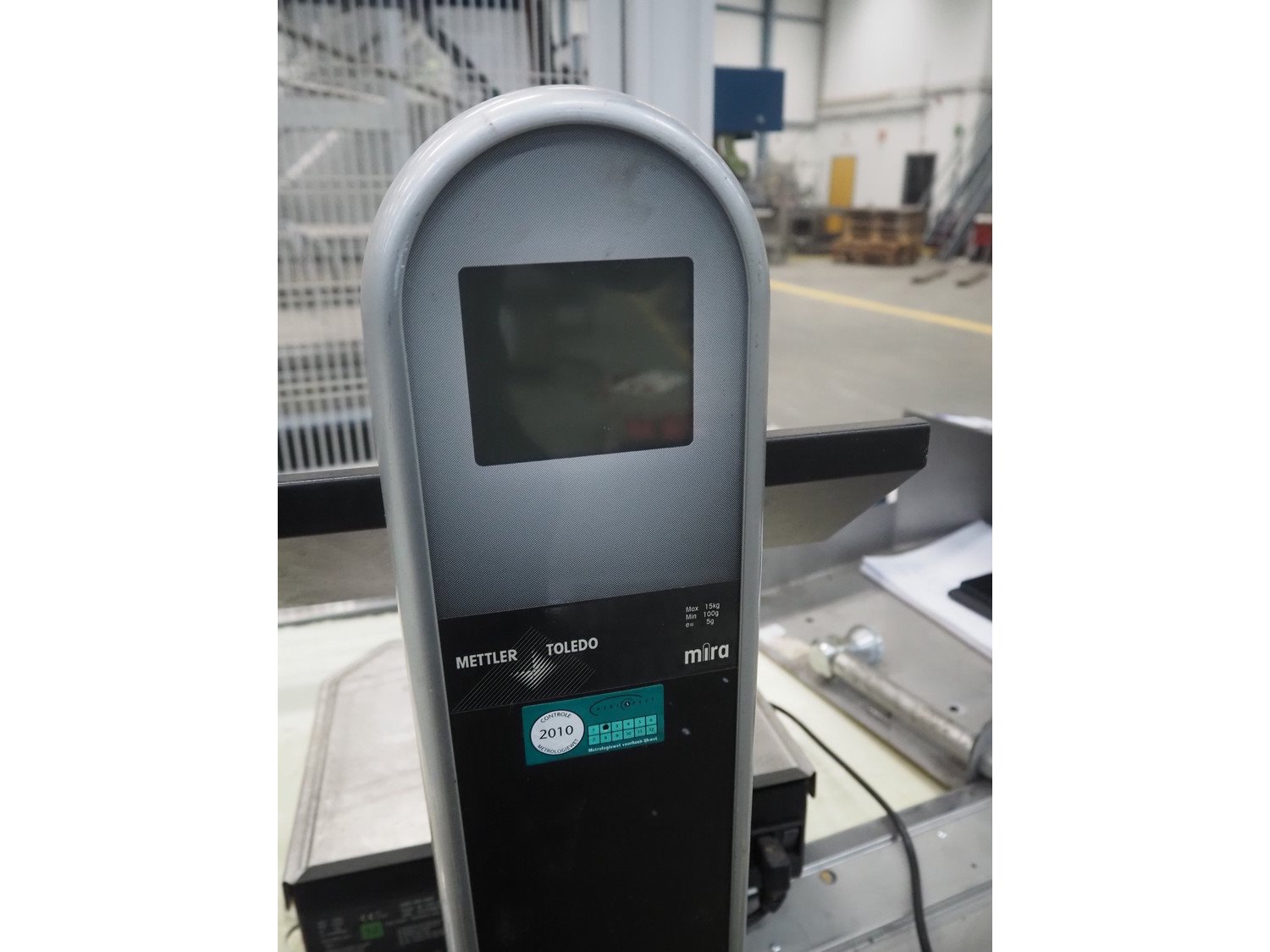 Mettler-Toledo GmbH weighing scale with label printer, type: M-15S-EB, serial number: 2375801, 100-240 V, 50/60 Hz, maximum weight: 15 kg, minimum weight: 100 gram, e= 5 gram, T- -9,995 kg, dimensions: 400 mm x 350 mm x 520 mm.