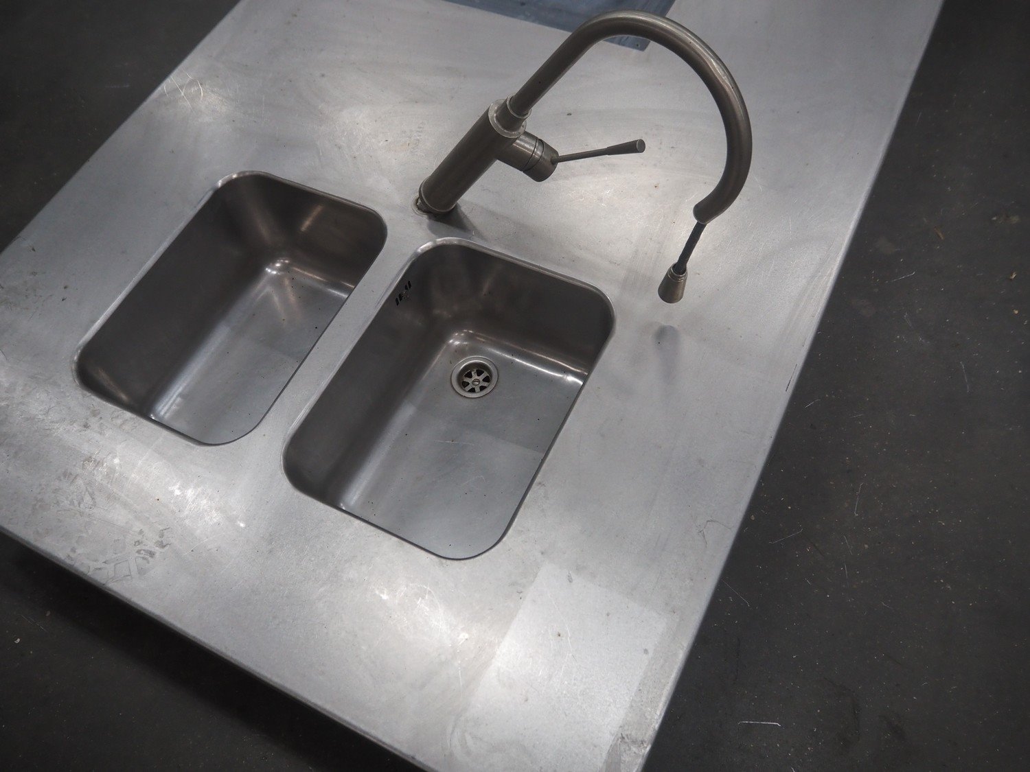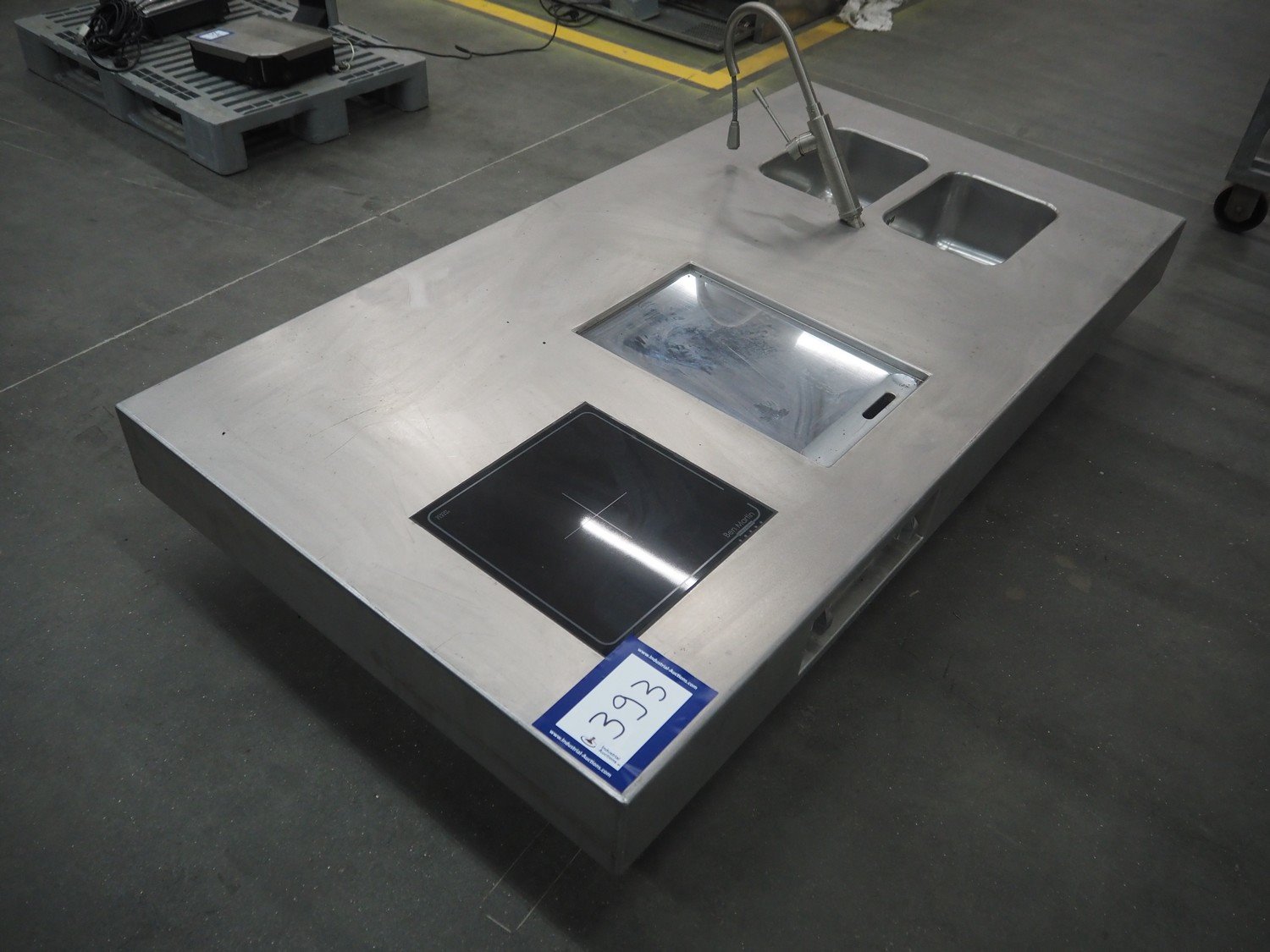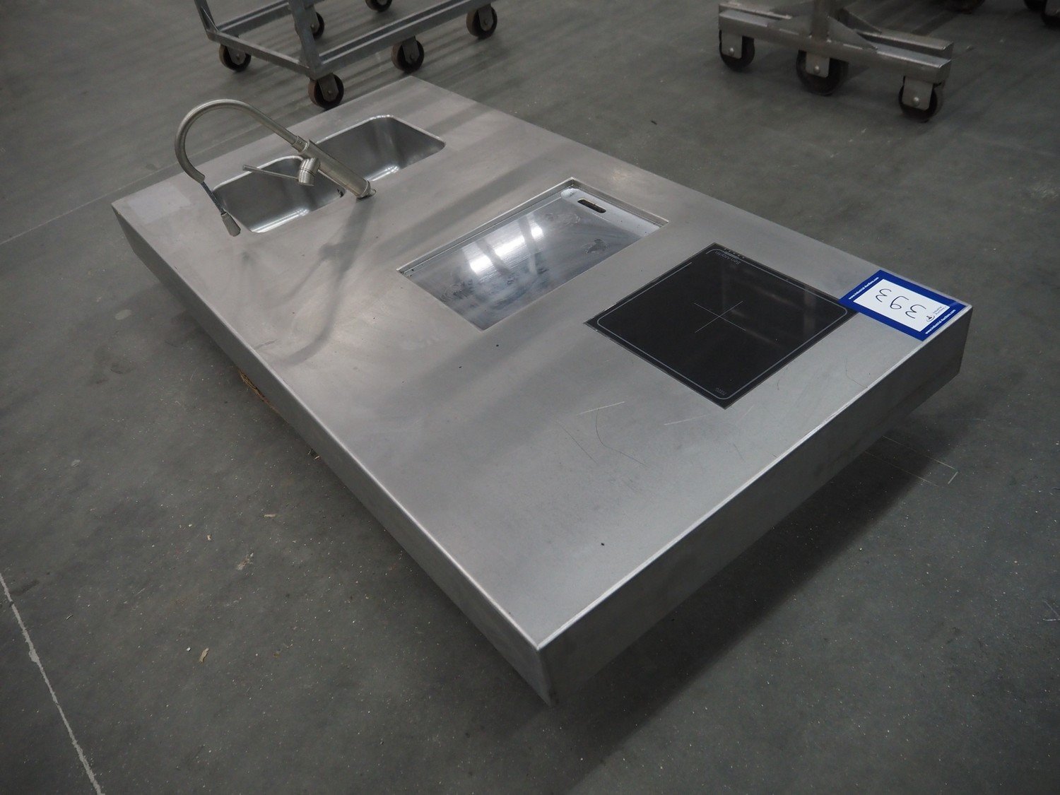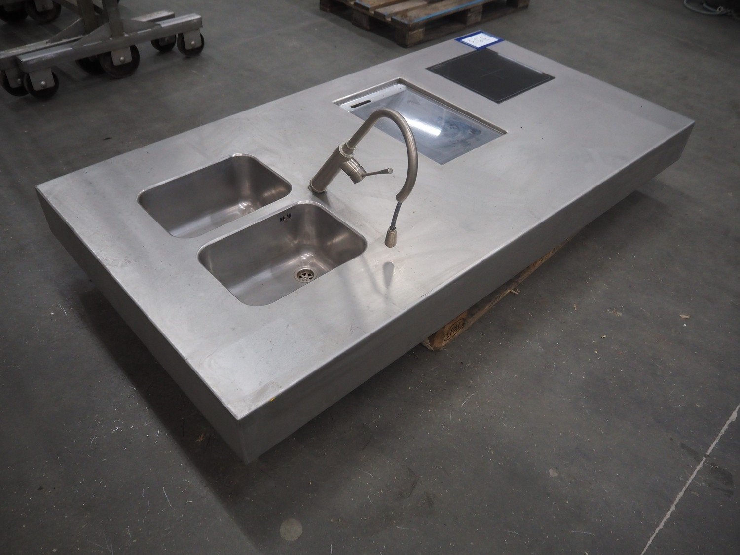 S/s kitchen counter with 2 sinks, faucet, induction plate and grill, dimensions: 2100 mm x 1100 mm x 180 mm.