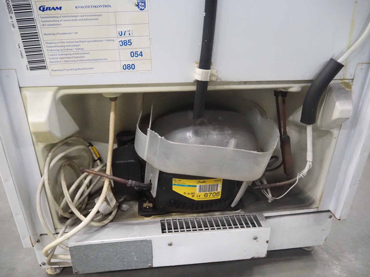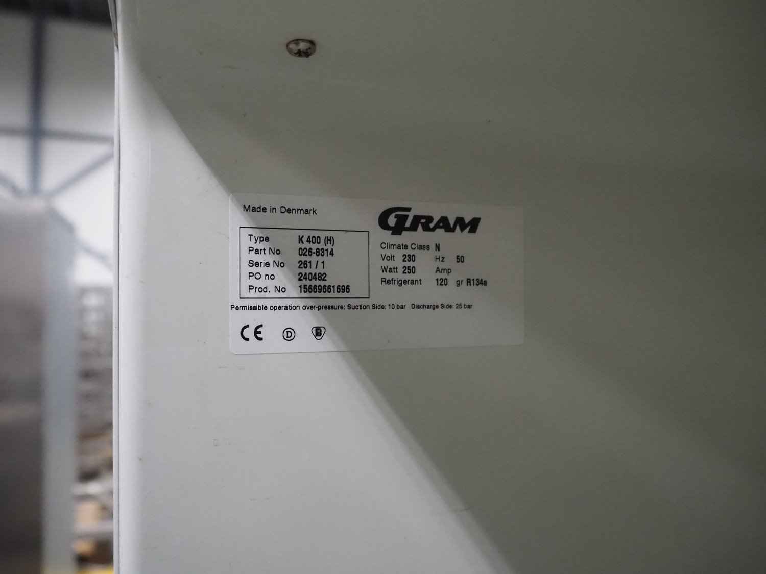 Gram refrigerator, type: K 400 (H), serial number: 261/1, 230 V, 50 Hz, refrigerant: 120 gr R134a, inside dimensions: 500 mm x 450 mm x 1500 mm, total dimensions: 600 mm x 600 mm x 1720 mm.