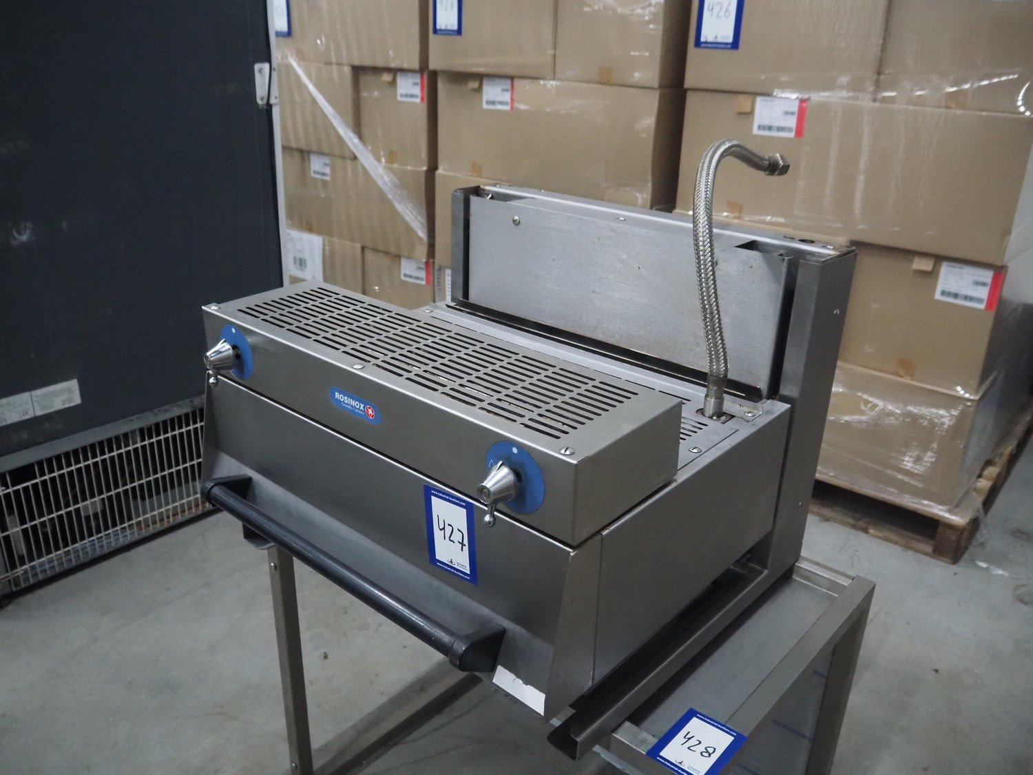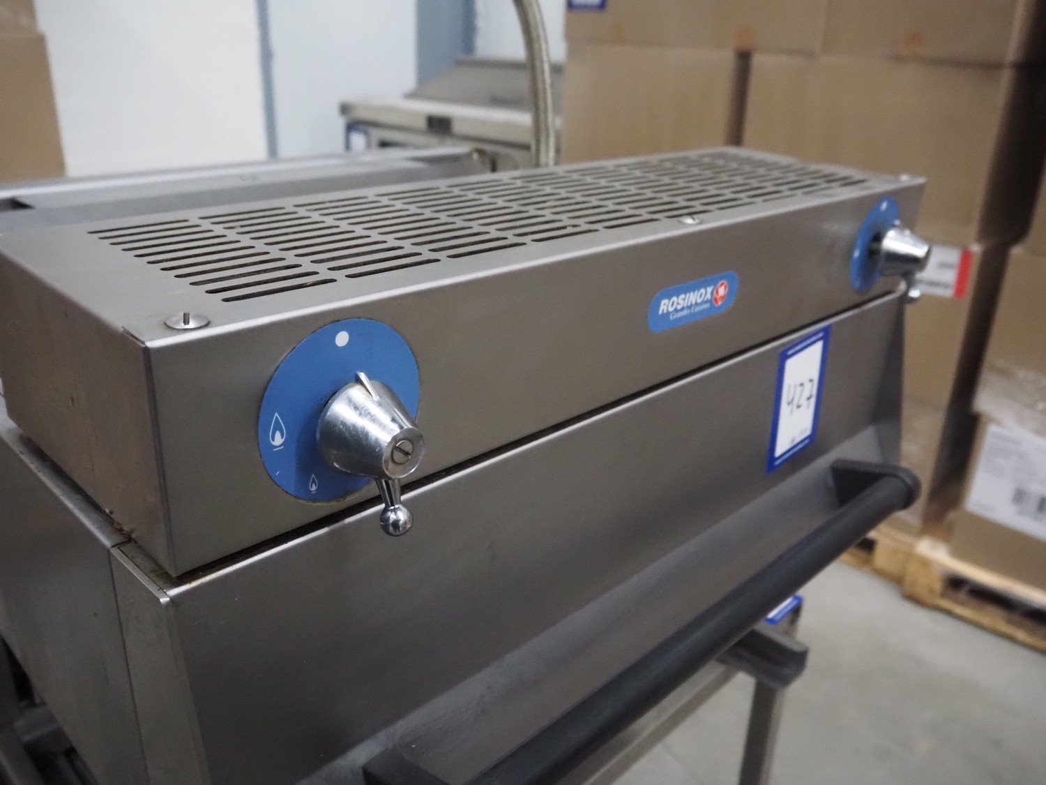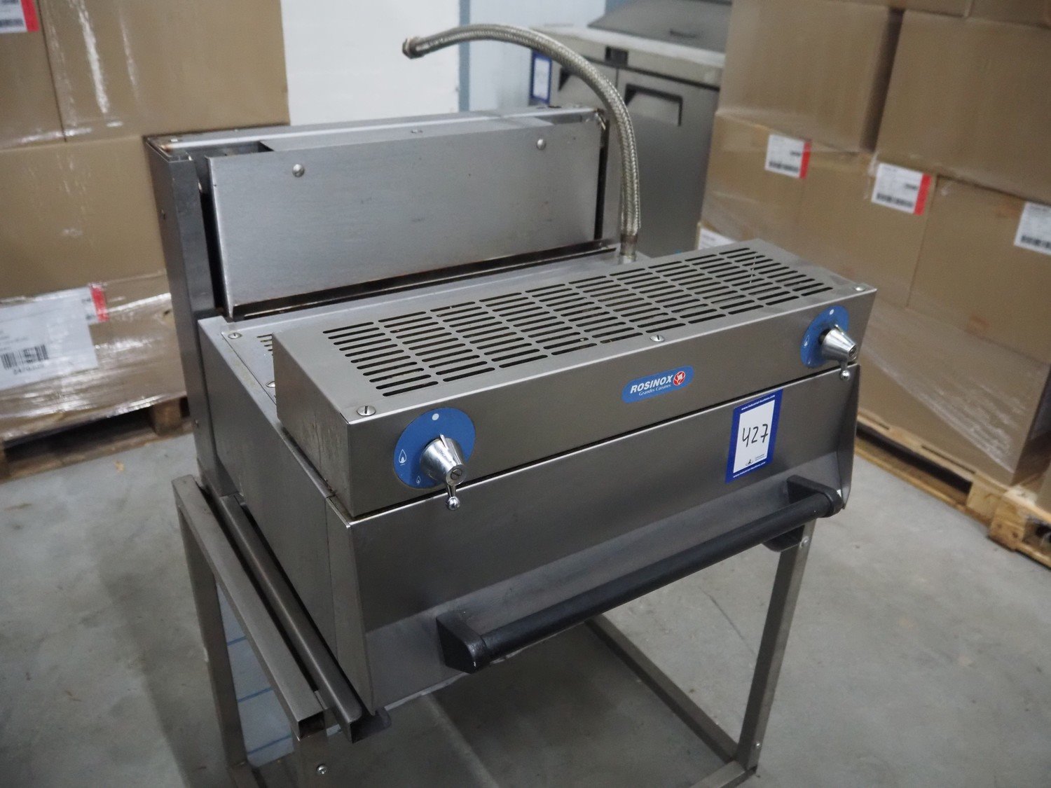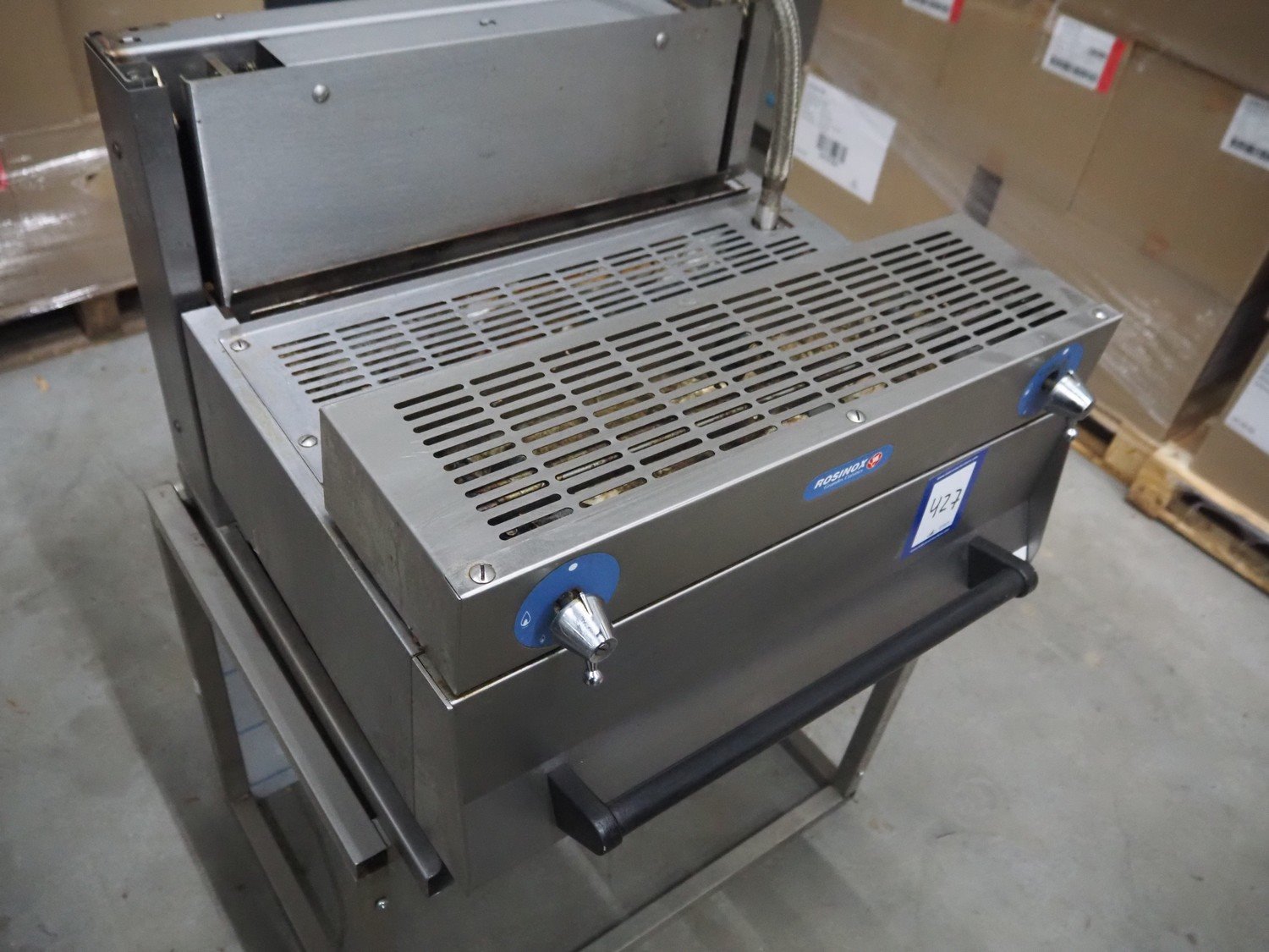 Rosinox gas heated grill, dimensions heated surface: 640 mm x 400 mm, total dimensions: 650 mm x 650 mm x 500 mm.