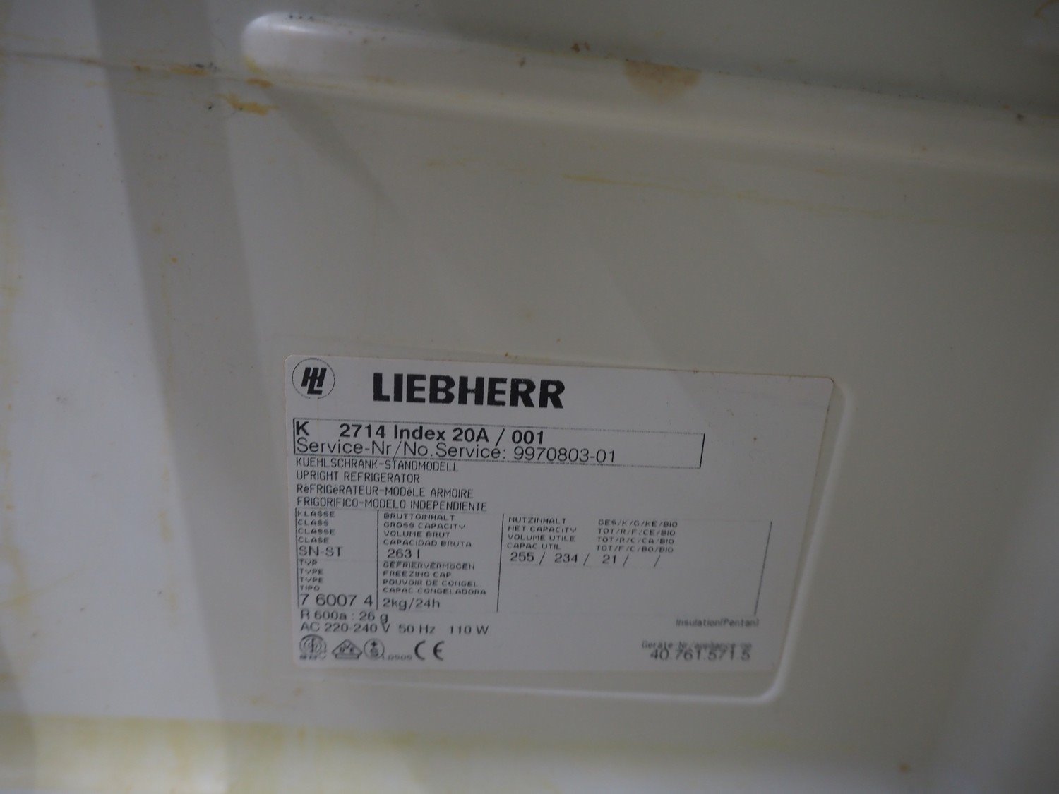 Liebherr refrigerator, type: K 2714 Indez 20A/001, number: 9970803-01, 220-240 V, 50 Hz, 110 W, volume: 263 liter, refrigerant: R600 a : 26g, dimensions: 550 mm x 620 mm x 1400 mm.