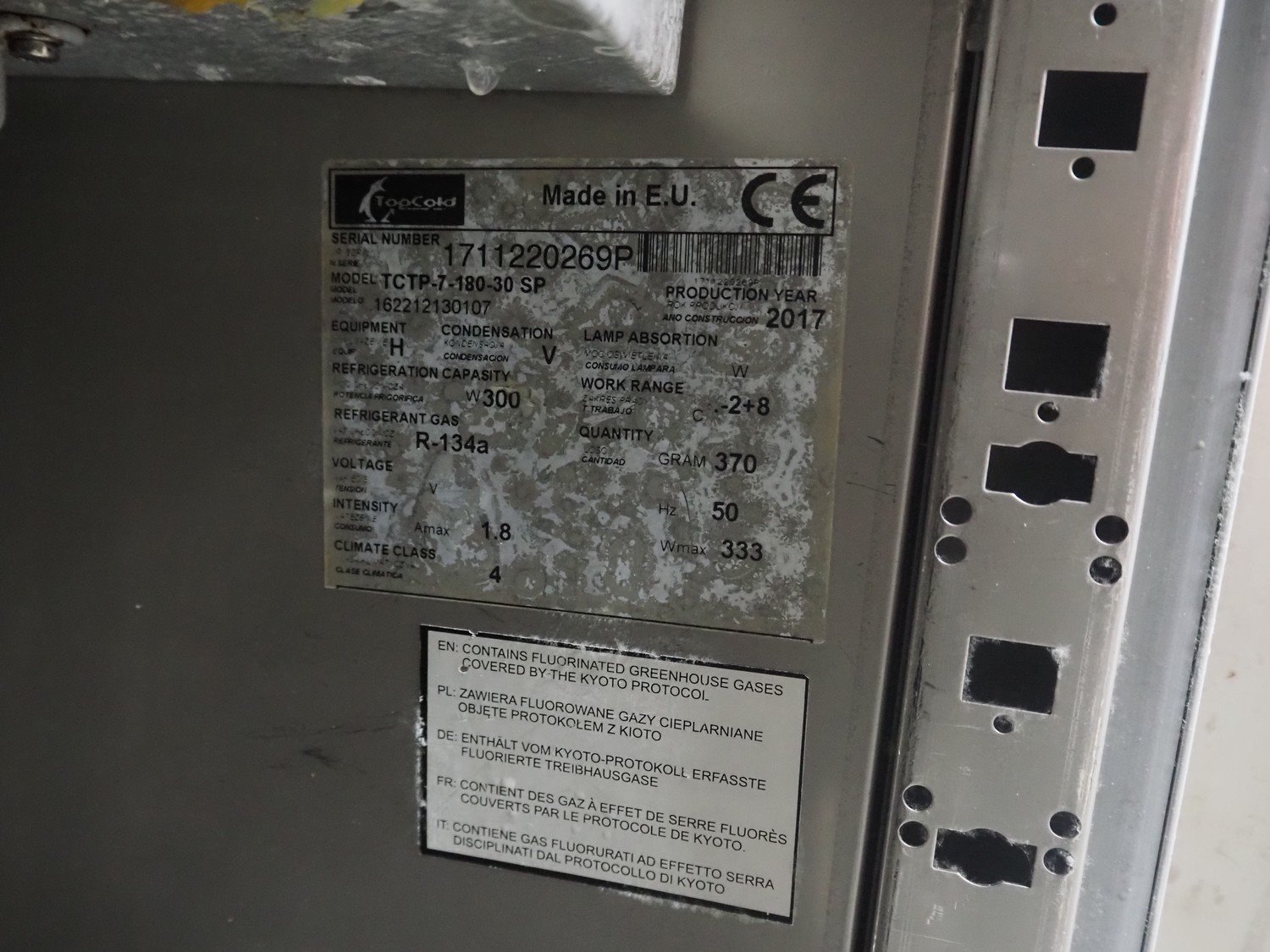 Top Cold refrigerated counter, model: TCTP-7-180-30 SP, serial number: 1711220269P, year of construction: 2017, 50 Hz, refrigerant: R-134a, 370 gram, floor dimensions: 570 mm x 330 mm, total dimensions: 1800 mm x 700 mm x 900 mm.