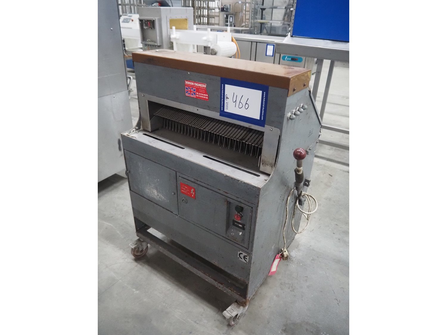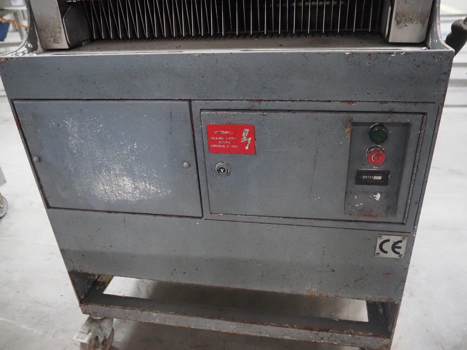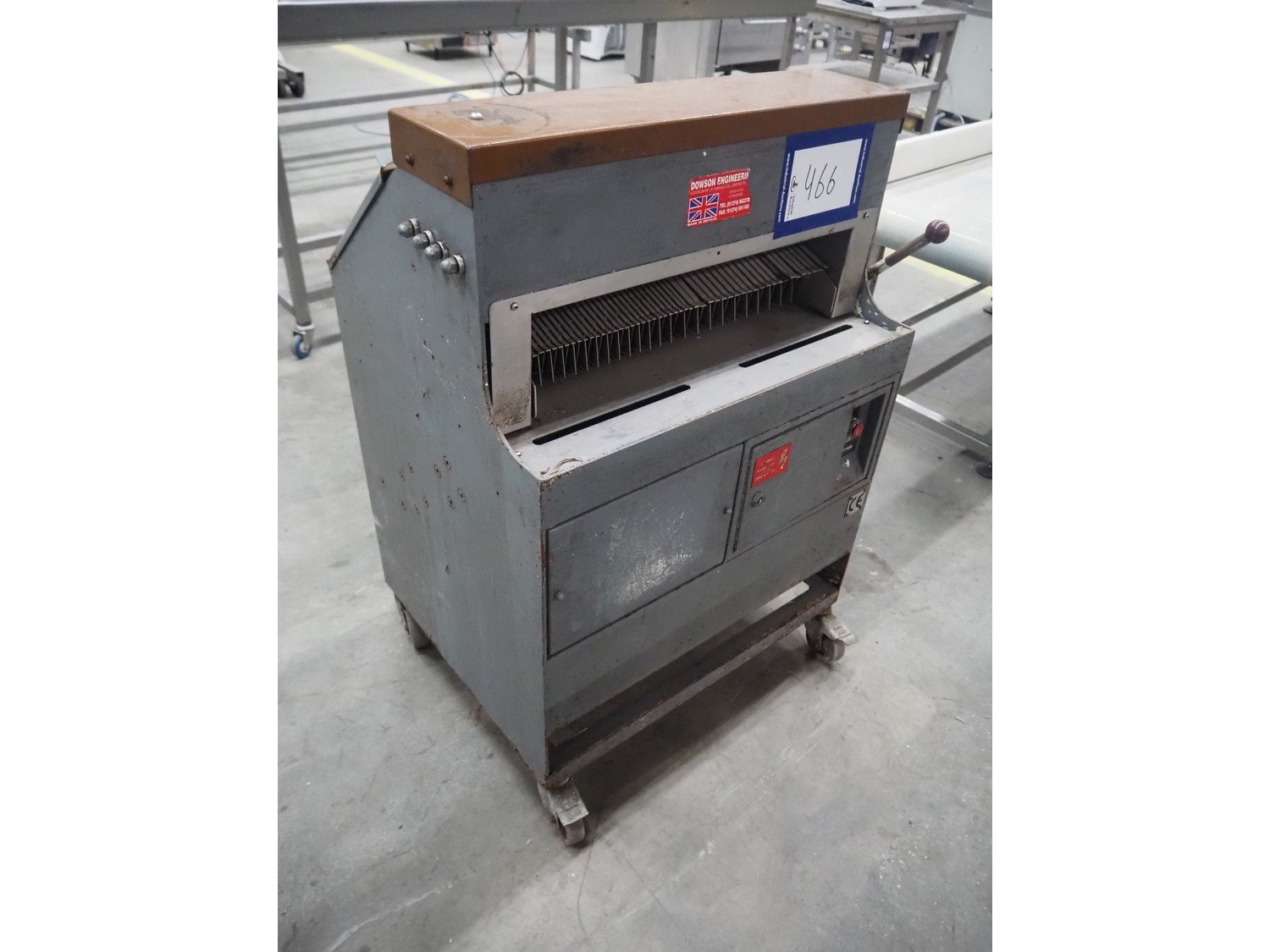 Dowson mobile bread slicer, model: D55-1, serial number: 02531096, 50 knives, distance between knives: 14 mm, total dimensions: 850 mm x 620 mm x 1120 mm.
