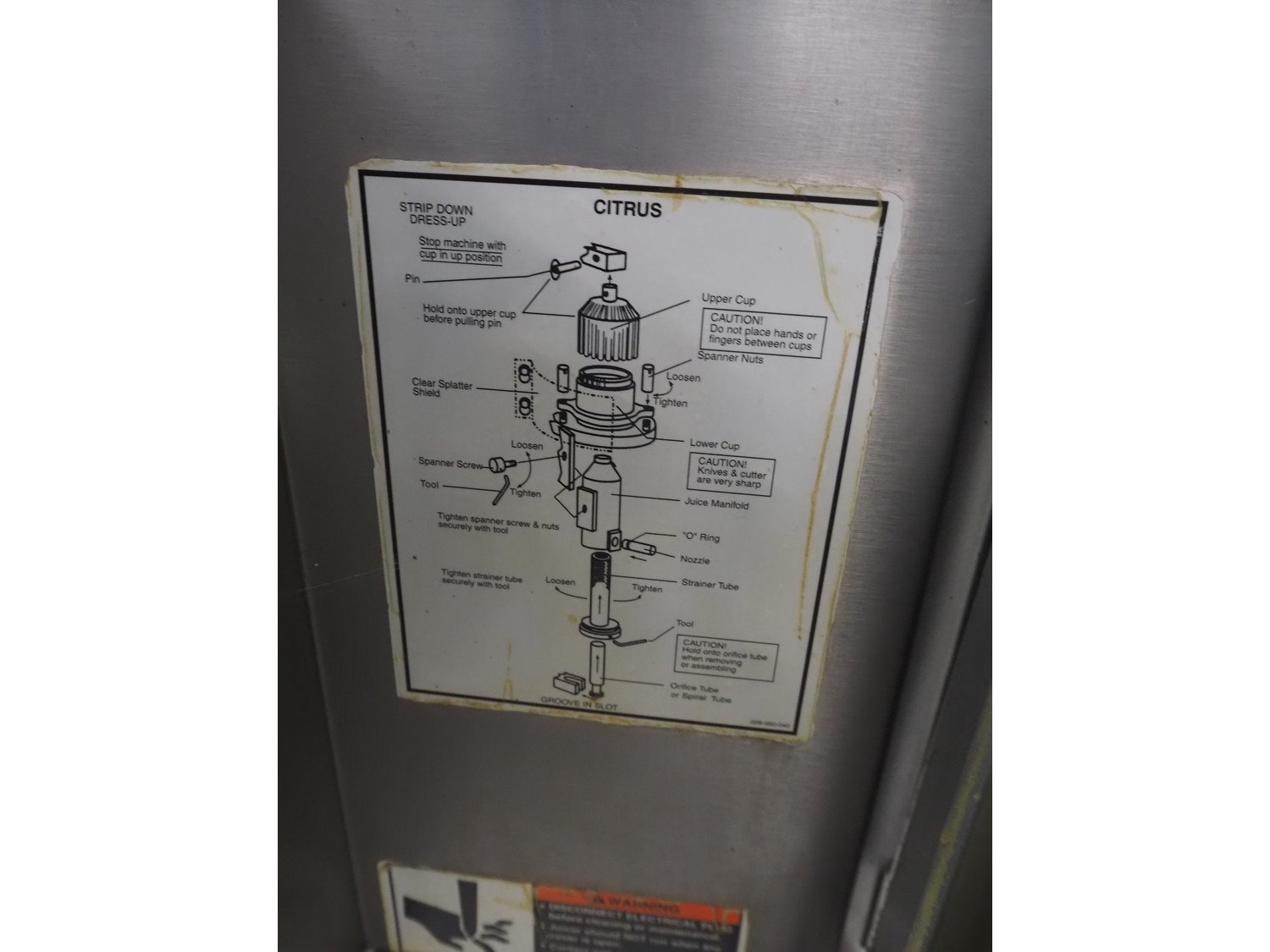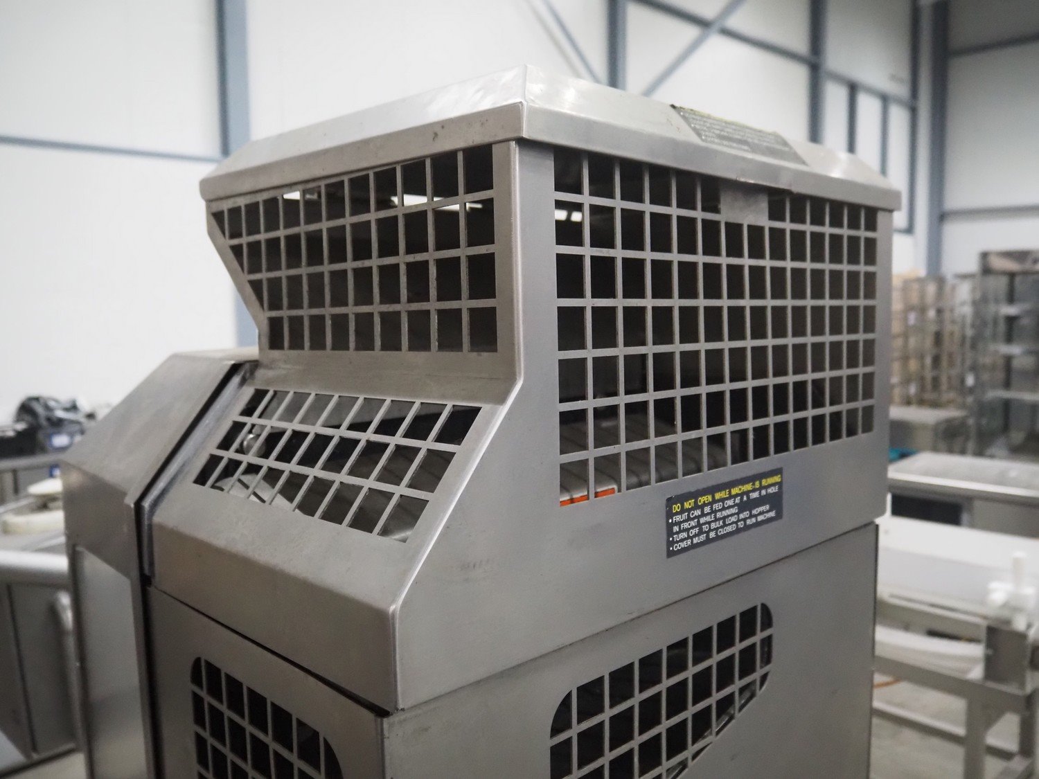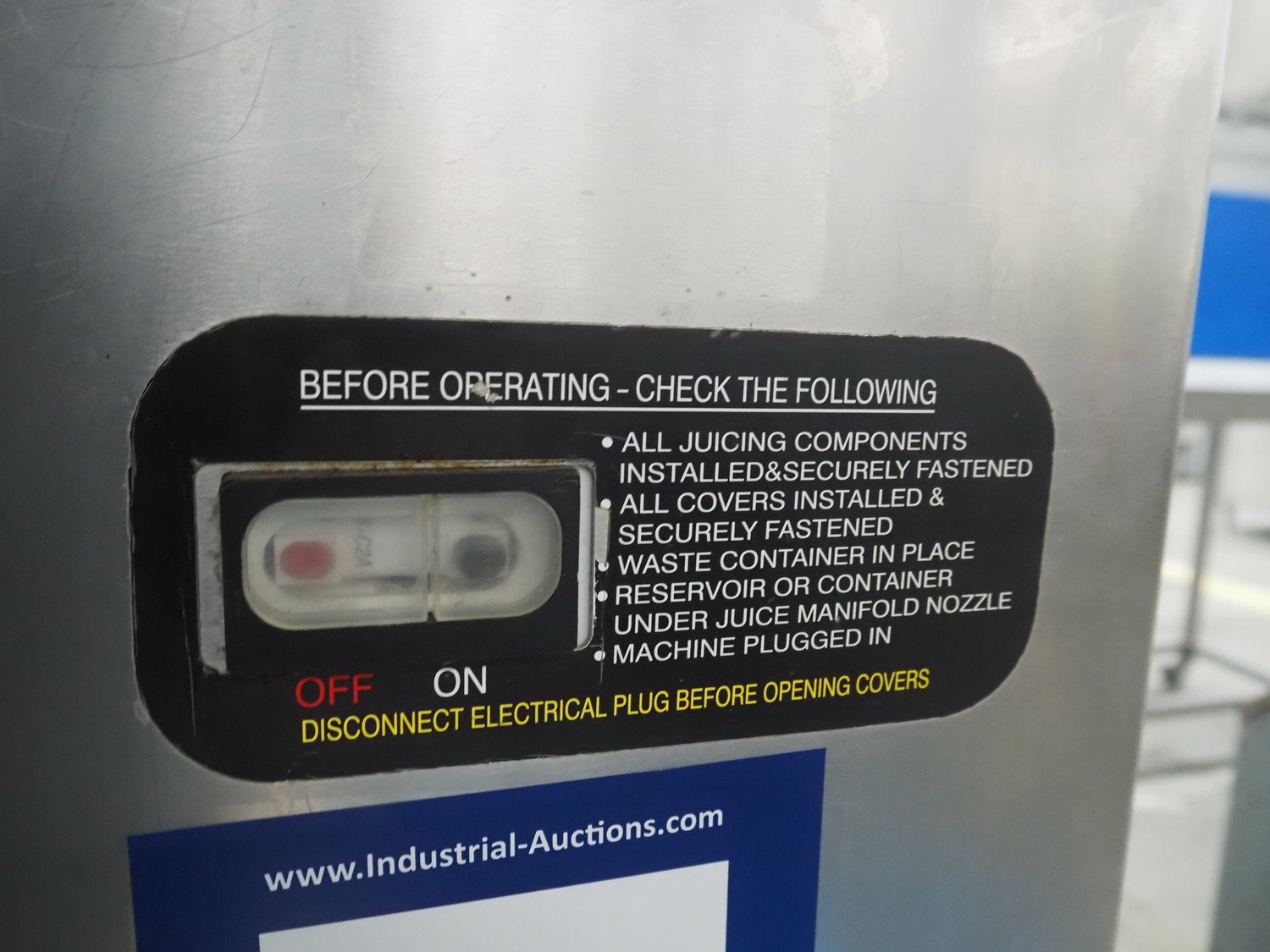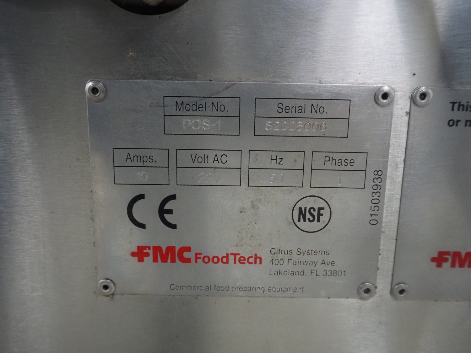 FMC FoodTech mobile multi-fruit juicer, model: POS-1, serial number: 82005006, 220 V, 1 Ph, 50 Hz, 10 A, dimensions: 850 mm x 550 mm x 1860 mm.
